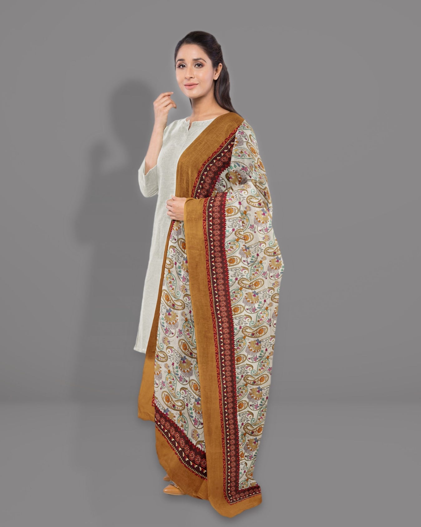 The duppatta is embellished with traditional Digital Kalka patterns, which are accented with a broad mono color printed border. The earthy toned foundation of the Duppatta is enhanced by rich pastel colored traditional Kalka motifs that are highlighted. The entire body of the Duppatta is covered in intricate designs. The themes have been changed in response to changing fashion trends. The piece can be dressed in a traditional style with ornate, detailed, intricate, contemporary designs, highlighting the depth and richness of traditional motifs. It's a one-of-a-kind piece that incorporates both elegance and heritage.