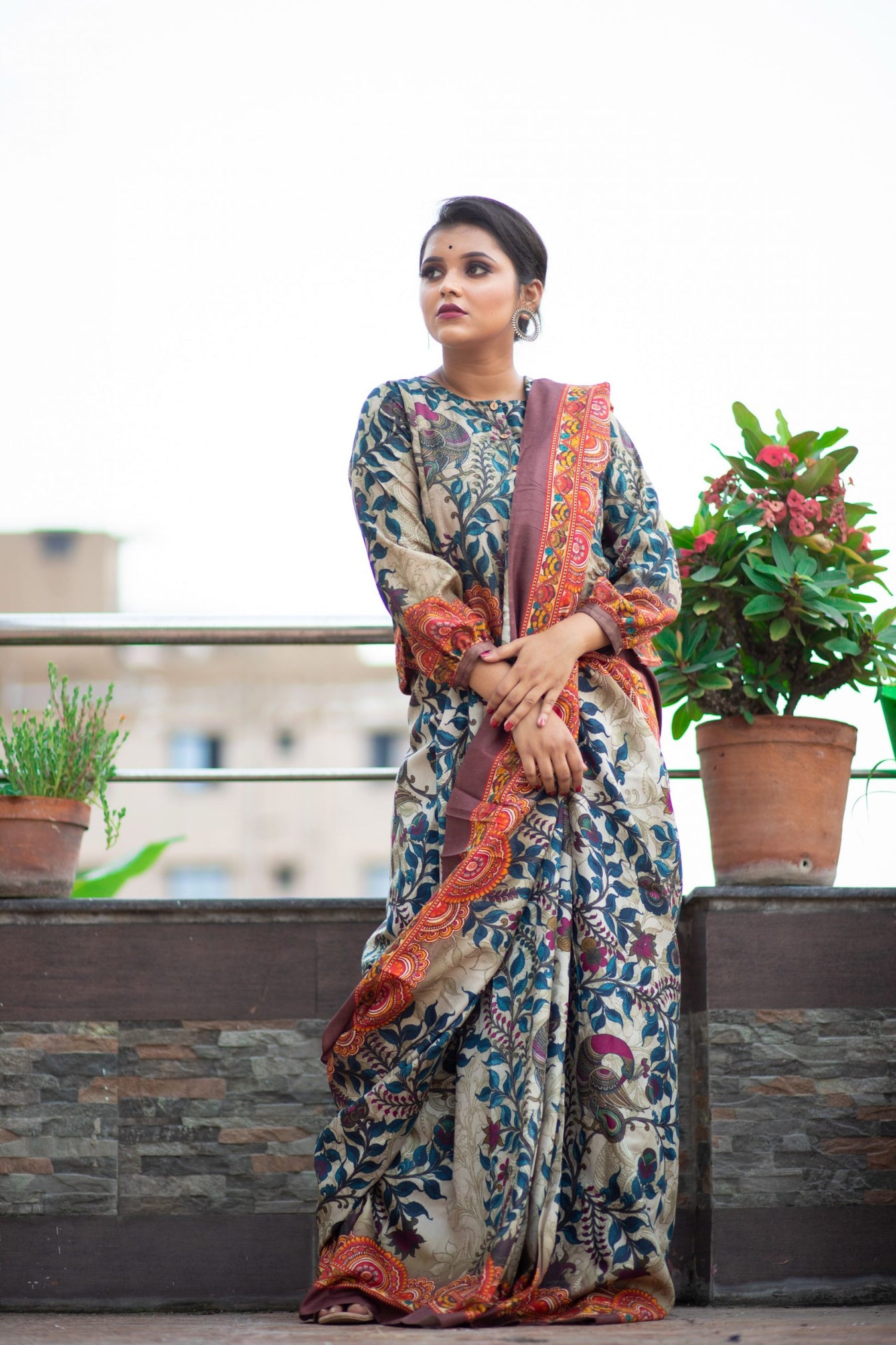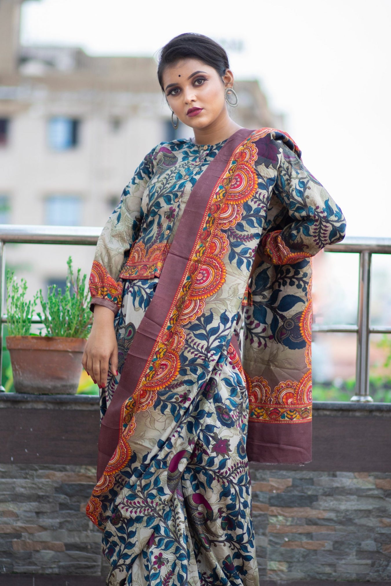 Colour: GREYFabric: TUSSAR Pattern and print: Kalamkari peacock jaal intricately decorates the pallu on the rich Tussar silk Saree. Elaborate border and body prints, accentuates the craft's detailed motifs, along with the soft, bold, stylized drape of the saree making it an eye-catching attire in the wardrobe.Silk purity: Pure Tussar SilkPack contains: 1 Saree, 1 BlouseCare instructions: Dry wash