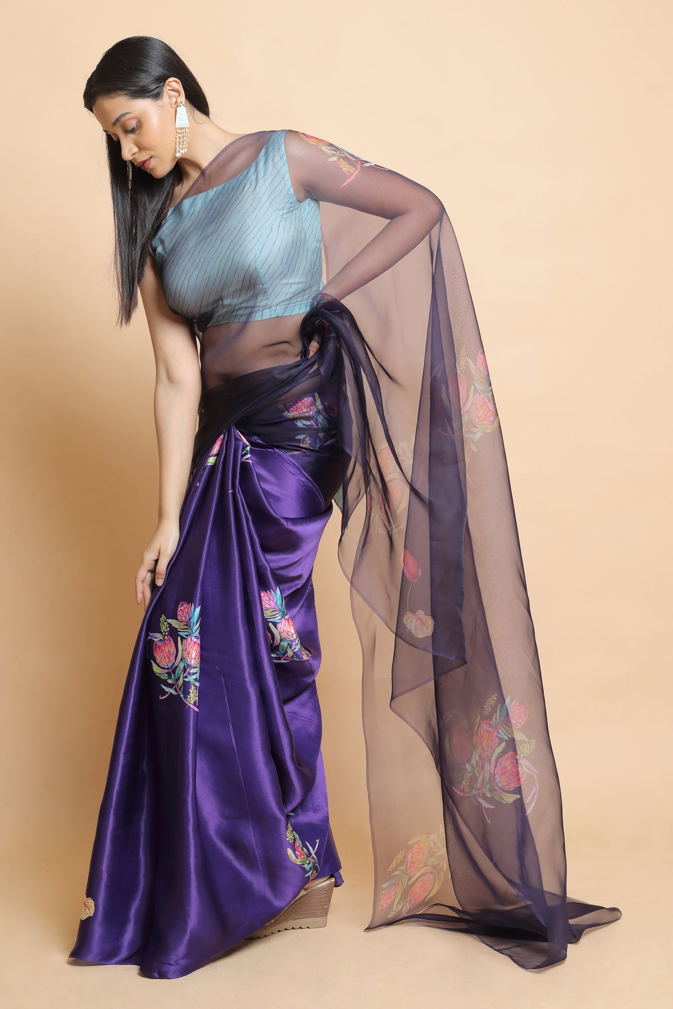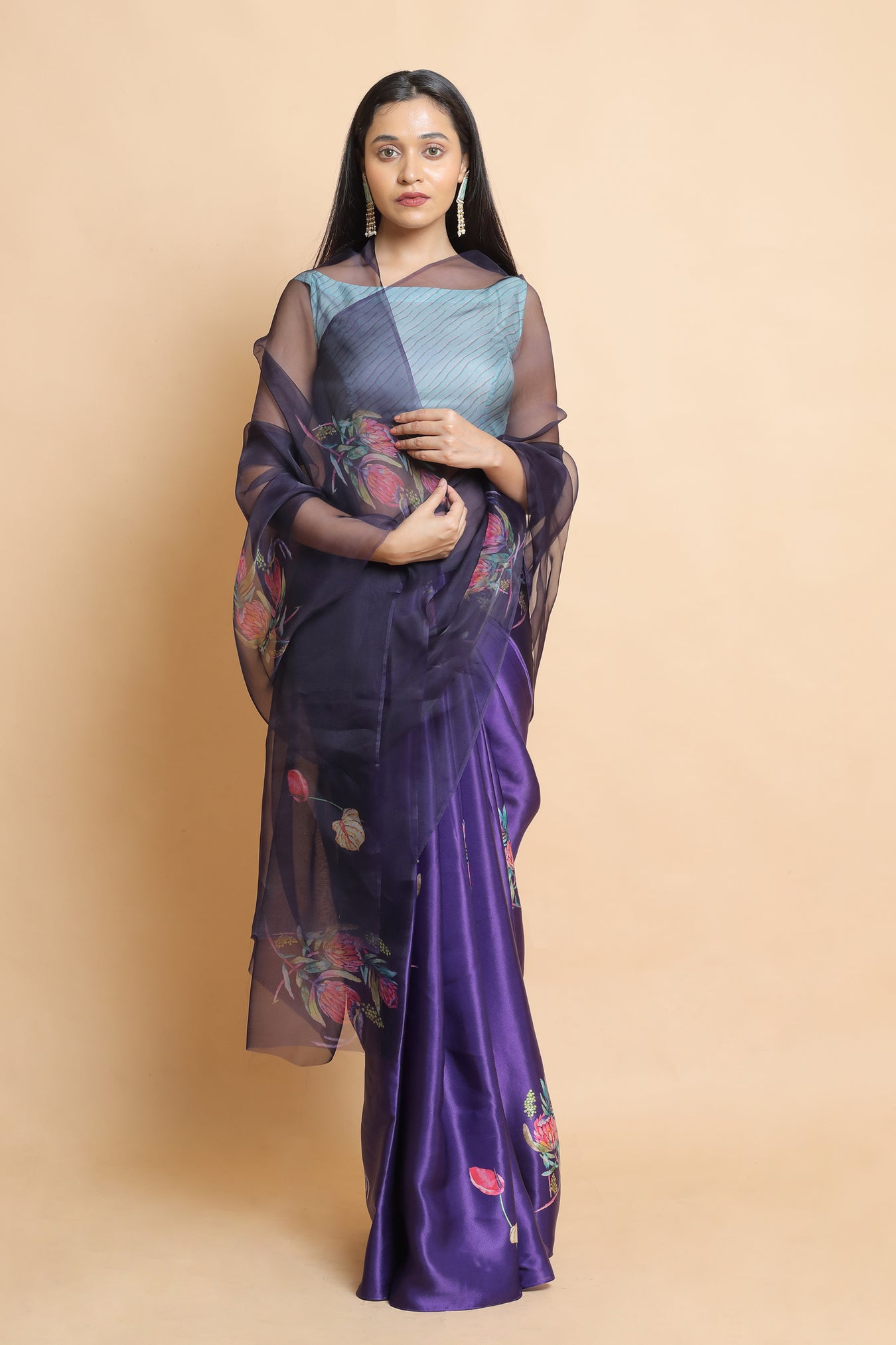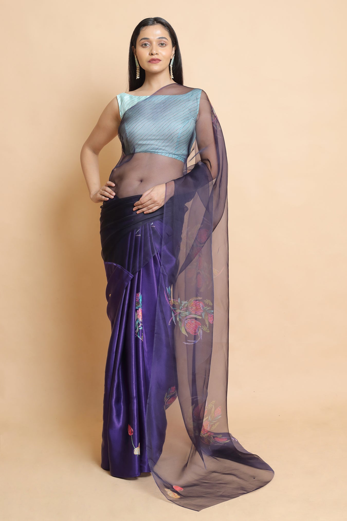 Pattern and print: Indulge in the simplicity and beauty of our half-and-half sari, where the luxurious feel of organza silk meets the smoothness of satin crepe. This saree, in a soft violet shade, is adorned with delicate hand-painted floral digital prints, embodying the essence of pure femininity.