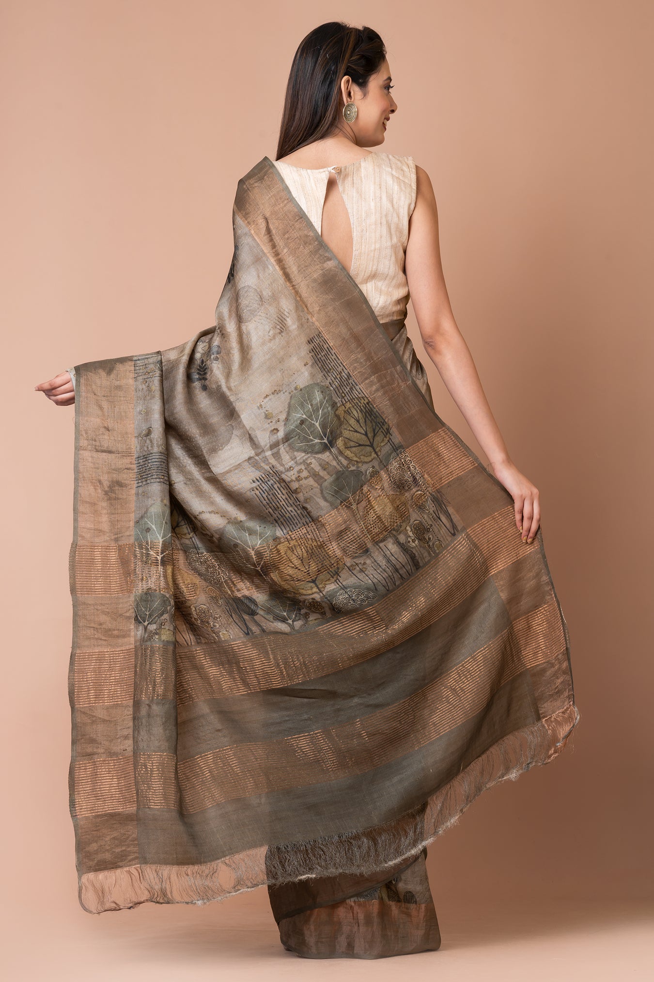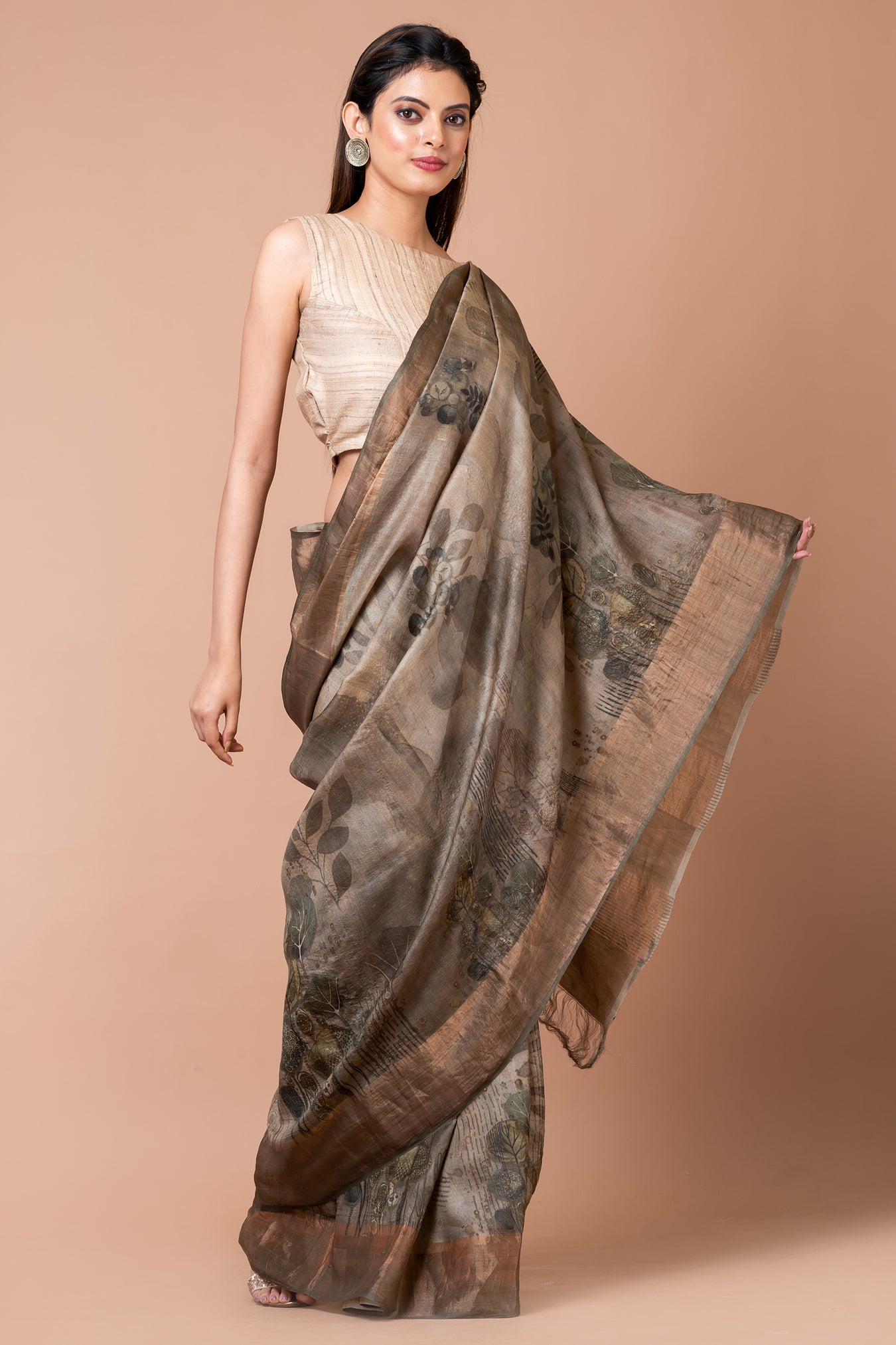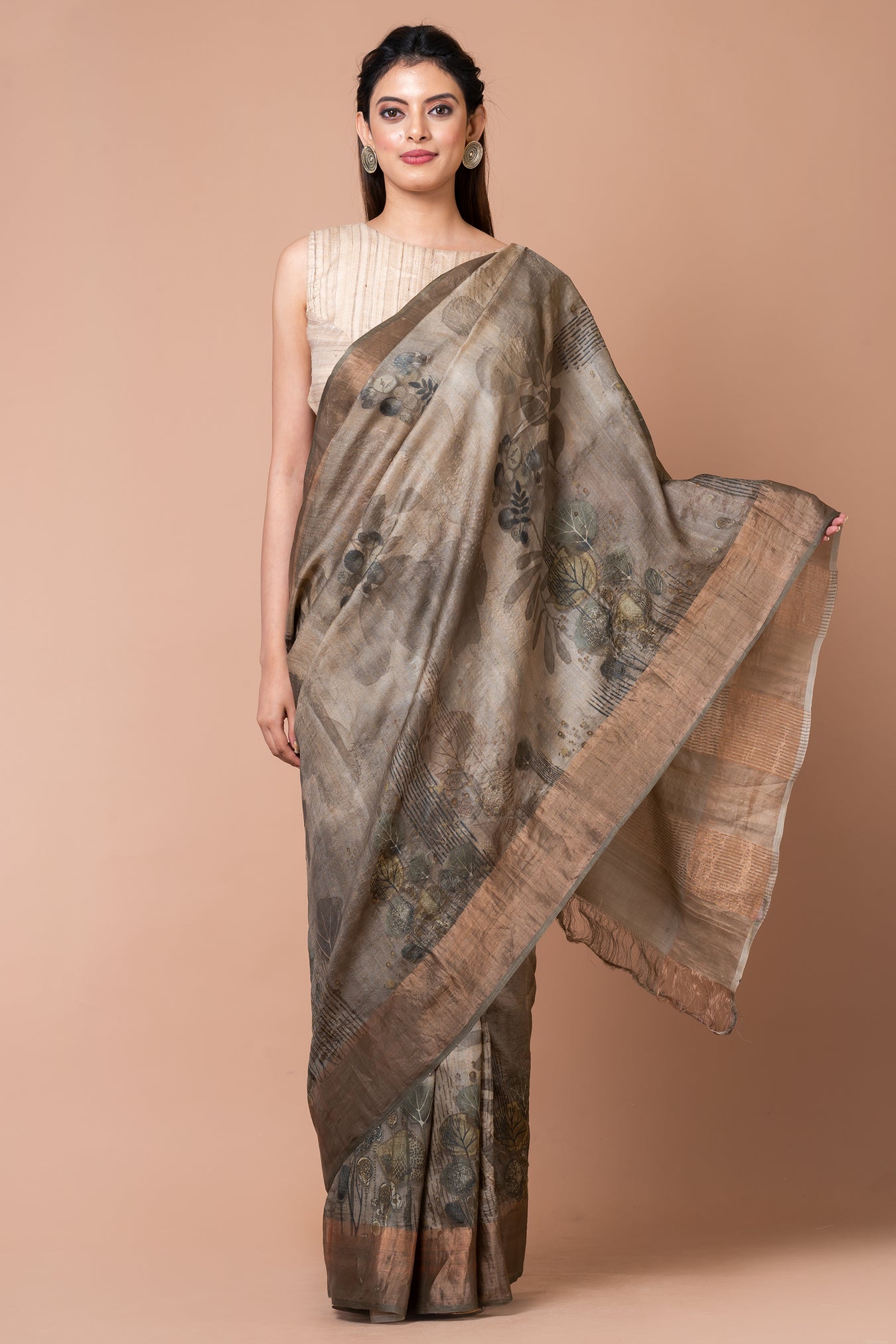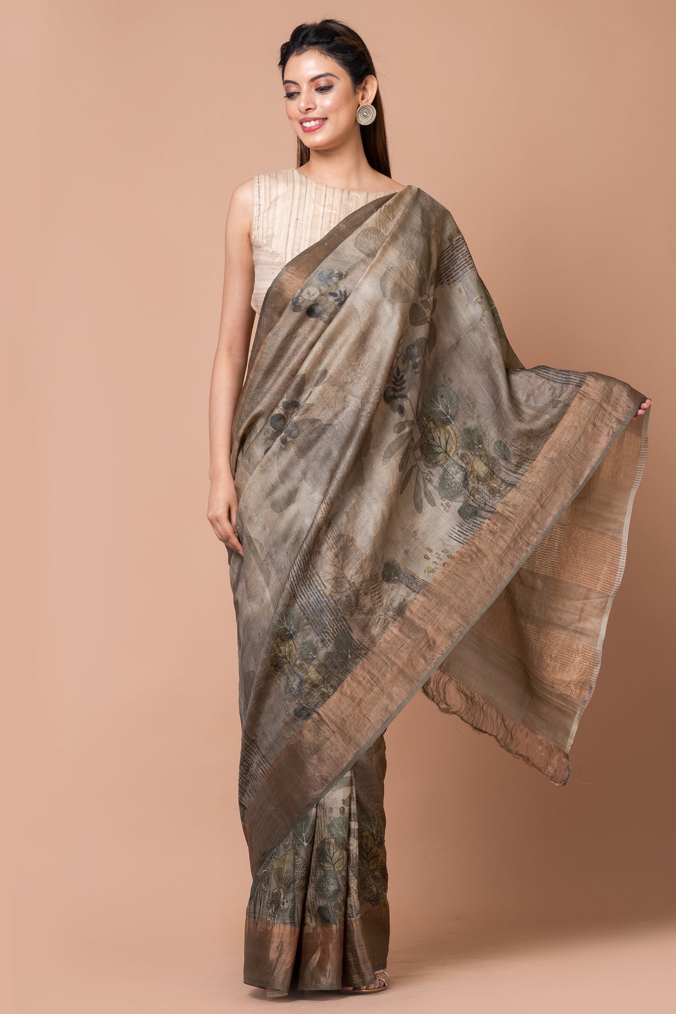 Size: S: 5.50Mtr B: 0.80MtrColour: Mehandi greyFabric: TussarPattern and print: Mehandi grey tussar silk saree adorned with a resplendent golden zari border, beautifully complemented by an abstract tropical digital print. Elevate your style with this exquisite blend of traditional elegance and contemporary flair.Silk purity: Pure Tussar Silk with zari borderPack contains: 1 Saree, 1 BlouseCare instructions: Dry wash