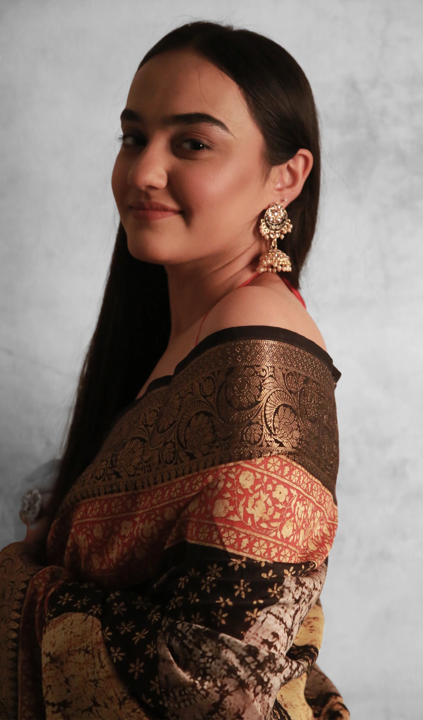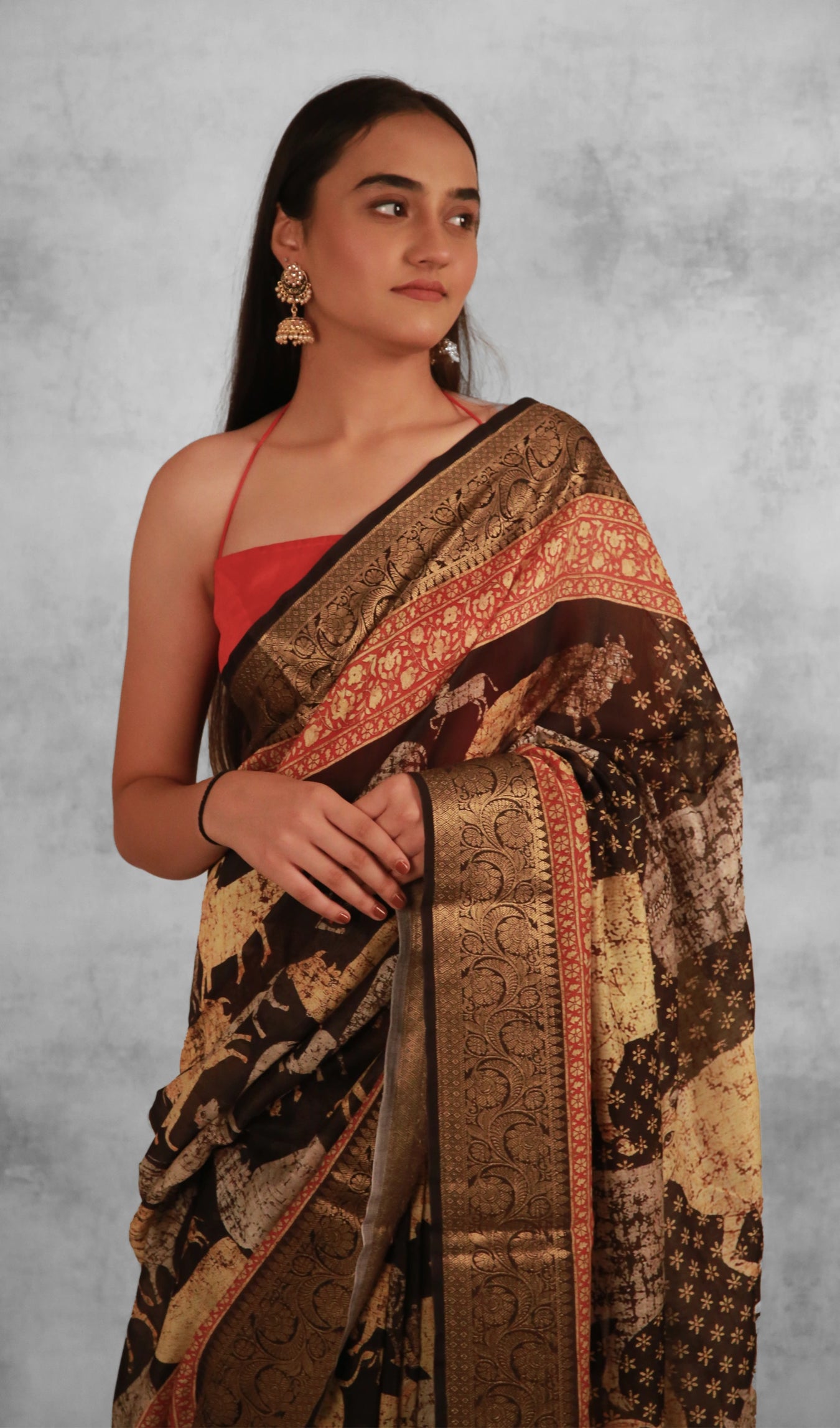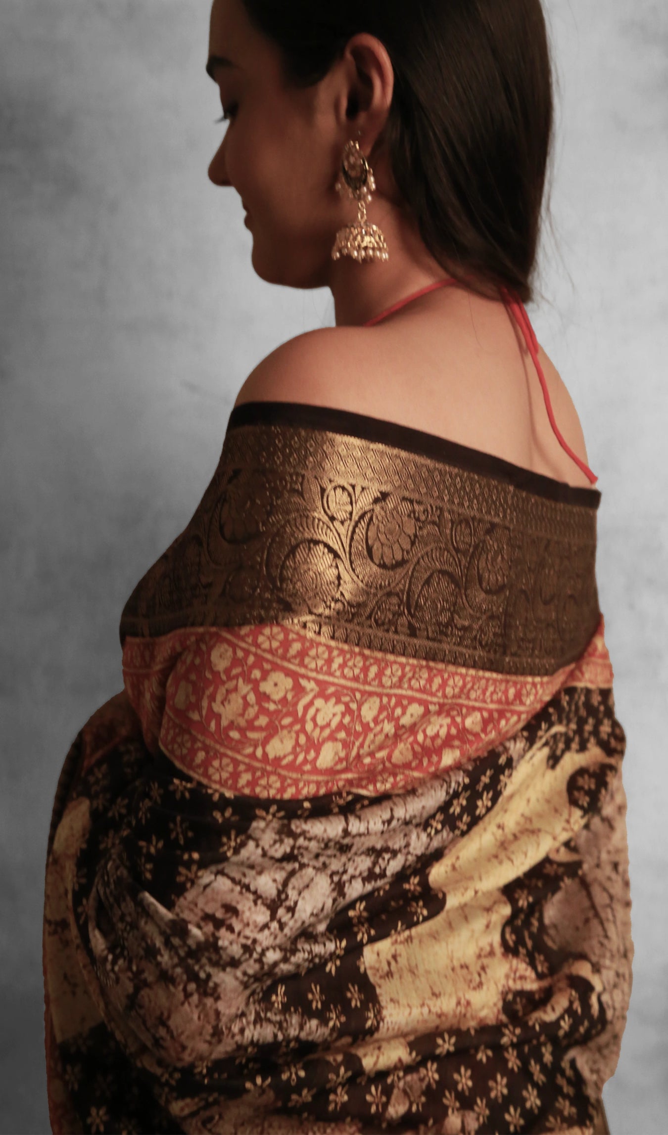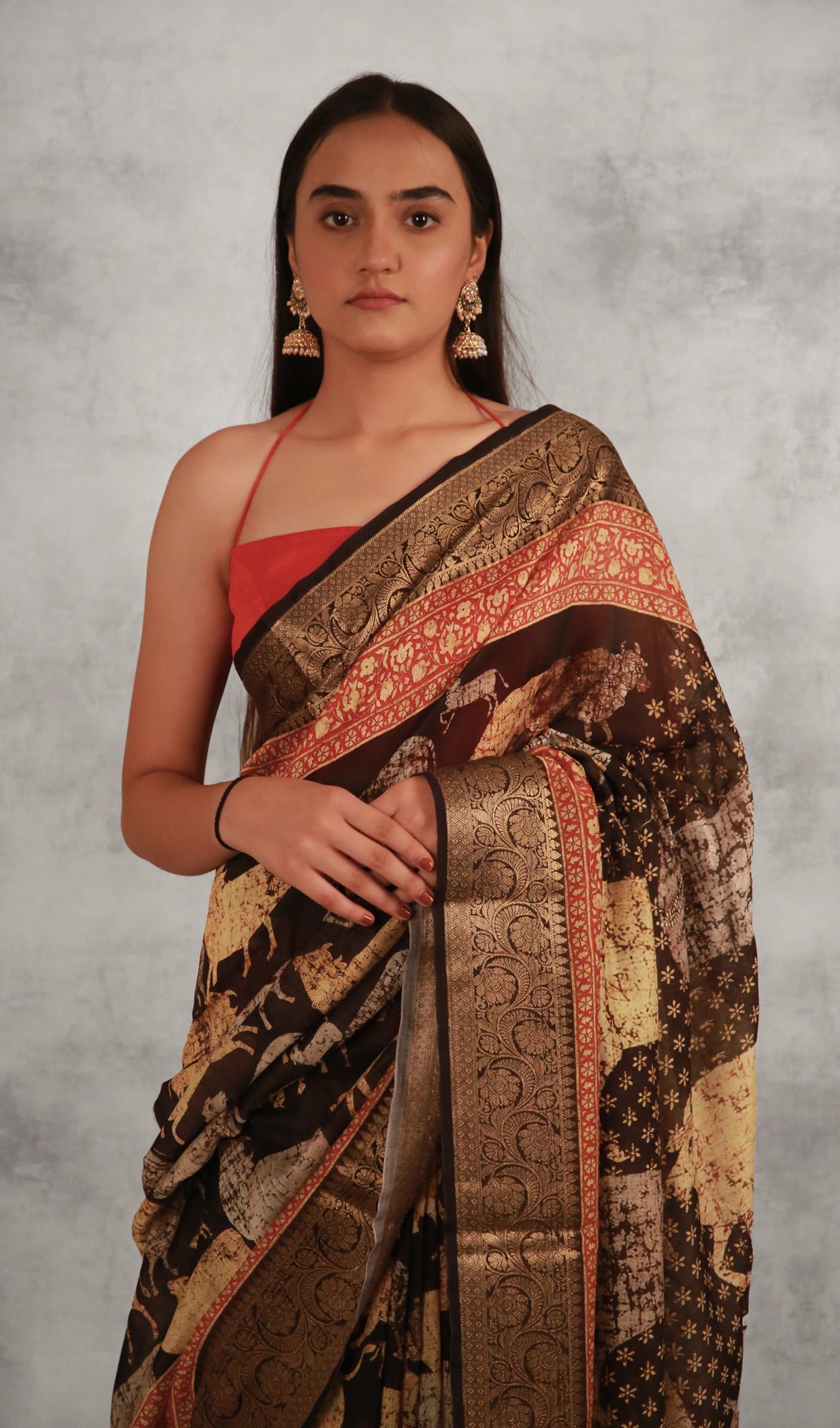 This black Chanderi saree features a captivating Cow Batik print, beautifully complemented by a black and red border with intricate golden woven details. Crafted in pure Chanderi fabric, this saree is a masterpiece of traditional craftsmanship.