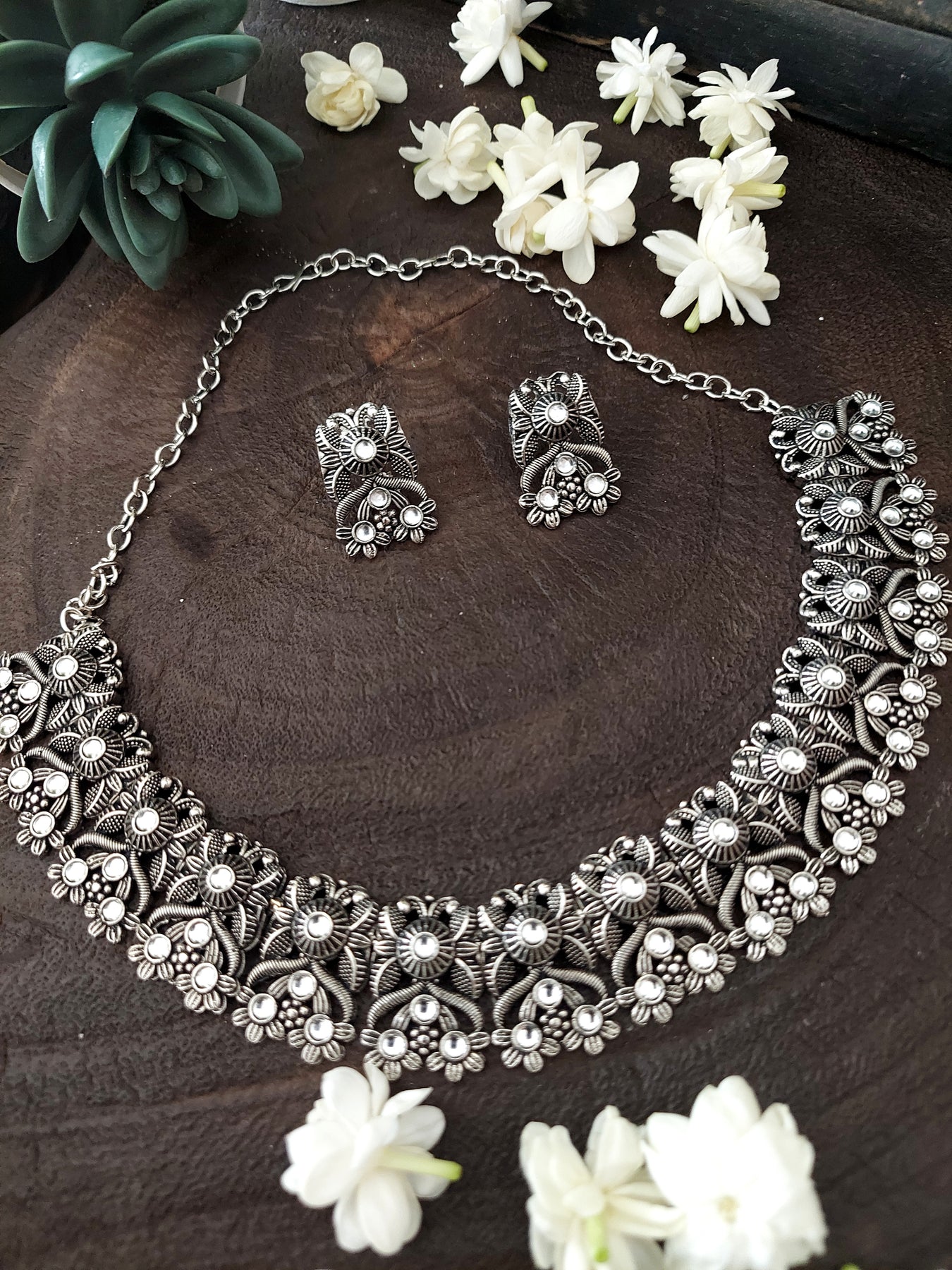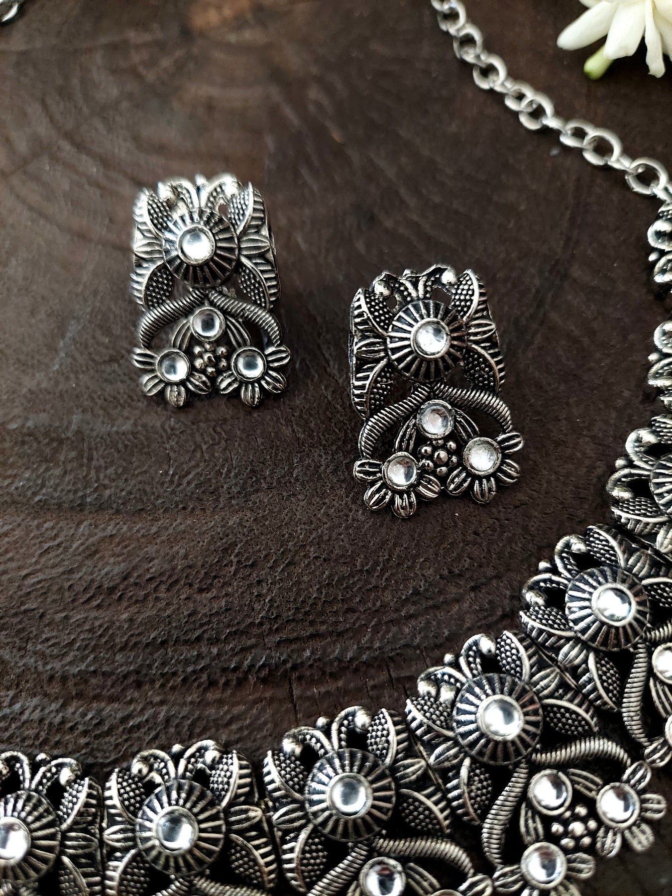 Neck-piece with an antique finish and a pair of Drop earrings. The Set is embellished with intricate decorative carvings and white stone work. Embellish your style by wearing it with any conventional or fusion outfit.