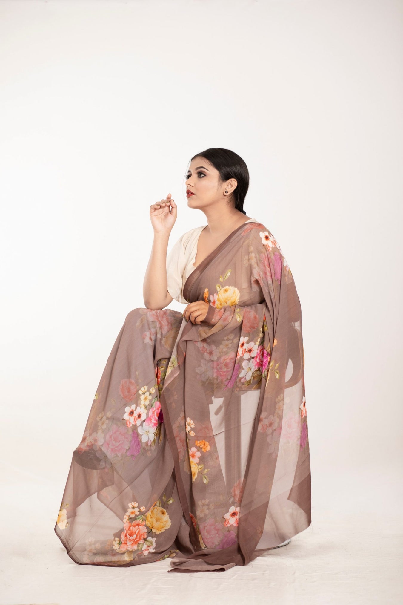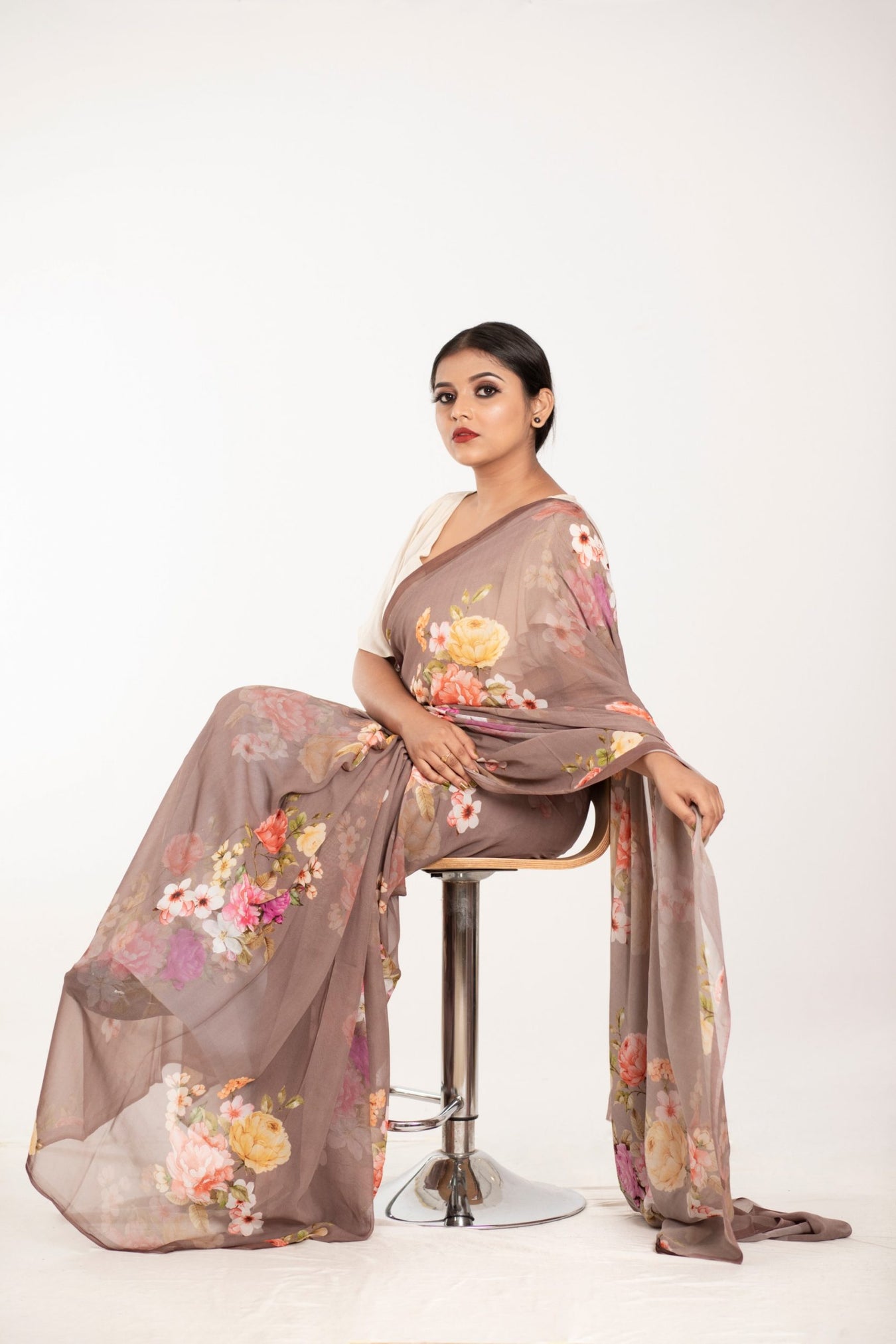 Colour: BrownFabric: GeorgettePattern and print: Beautiful scattered floral prints all over eclectic Georgette adding a sense of sophistication to the wardrobe. The soft flowing fabric accentuates the figure and brings out the elegance and beauty from within.Care instructions:Â Dry wash