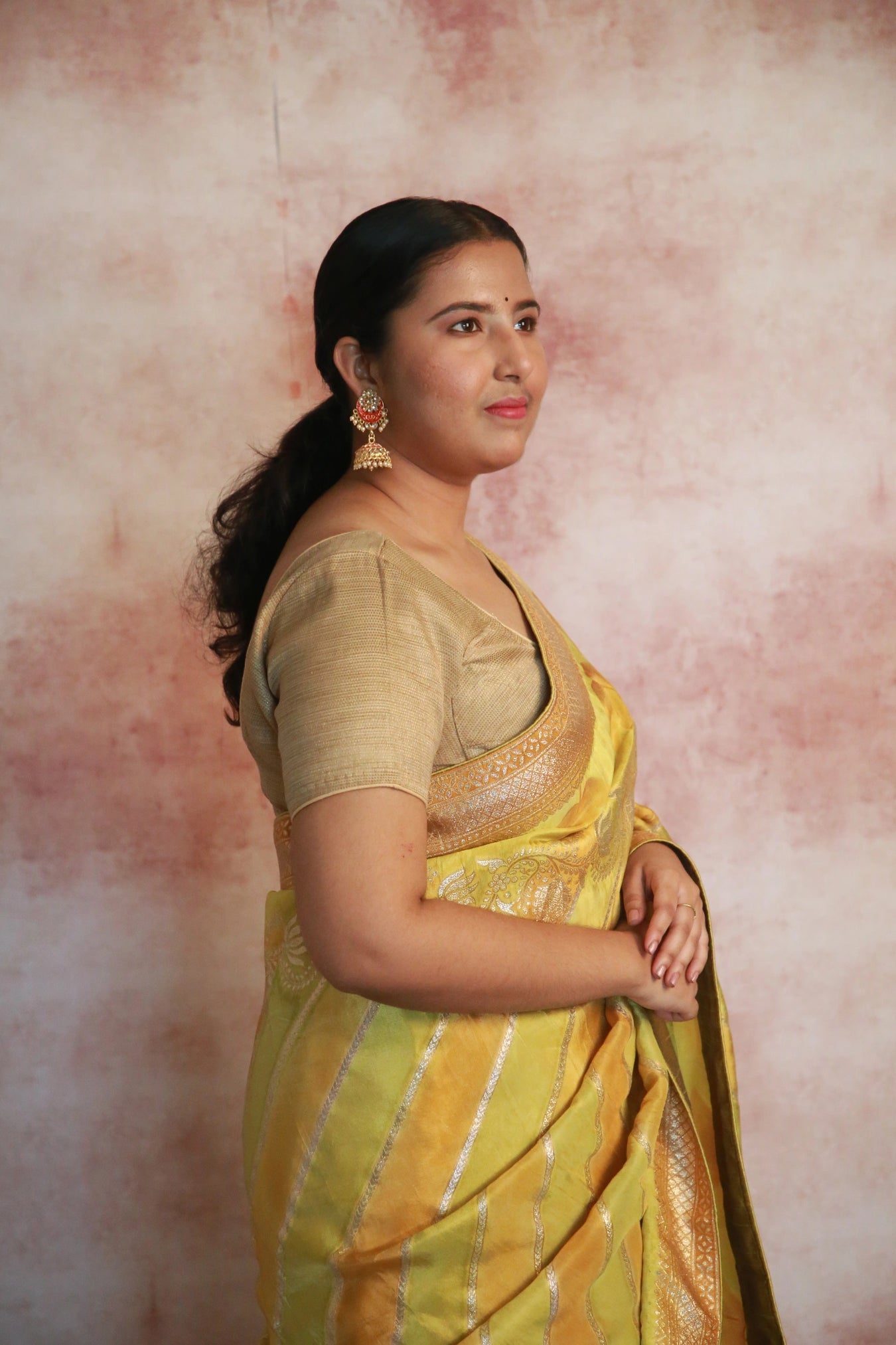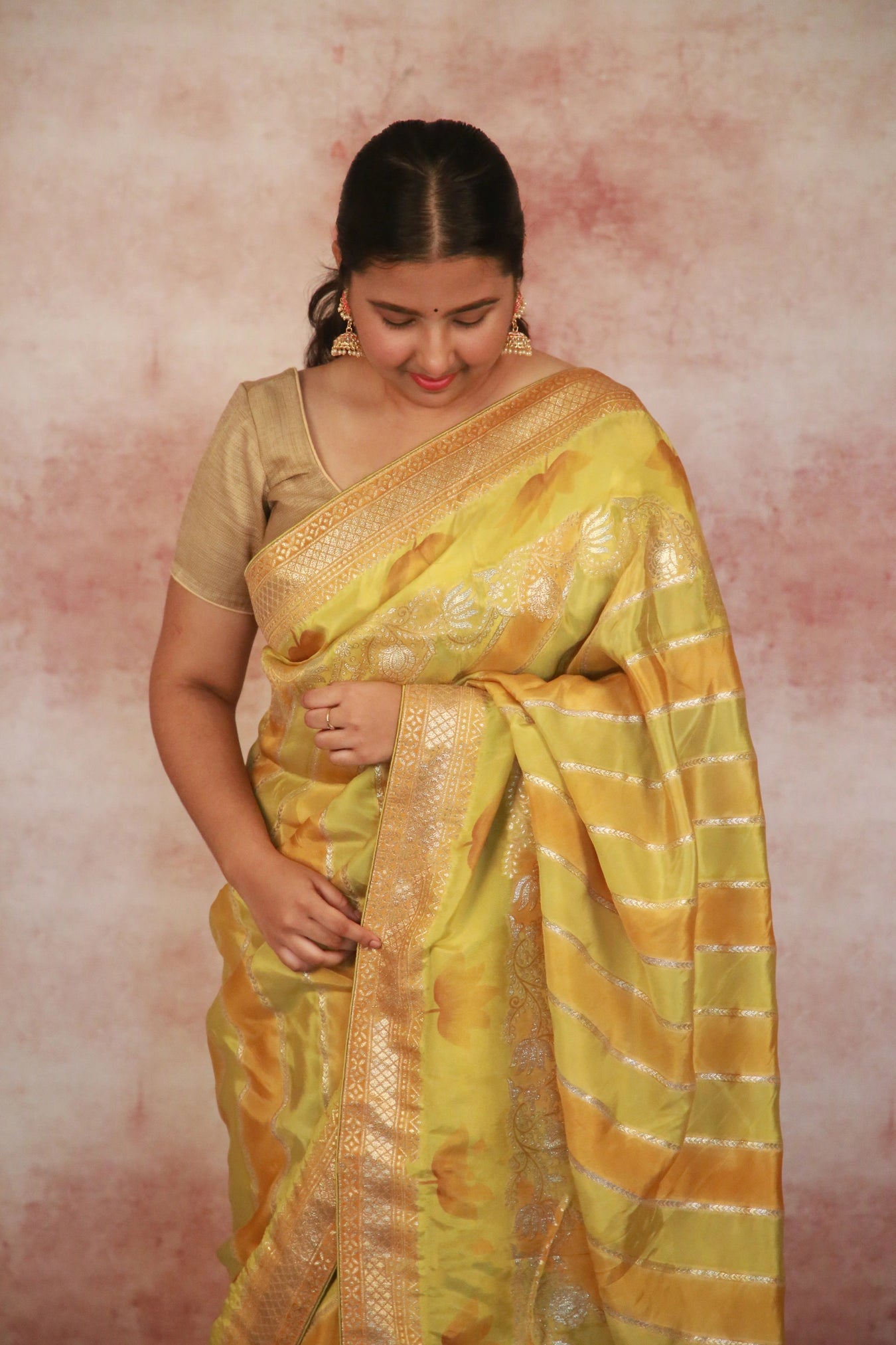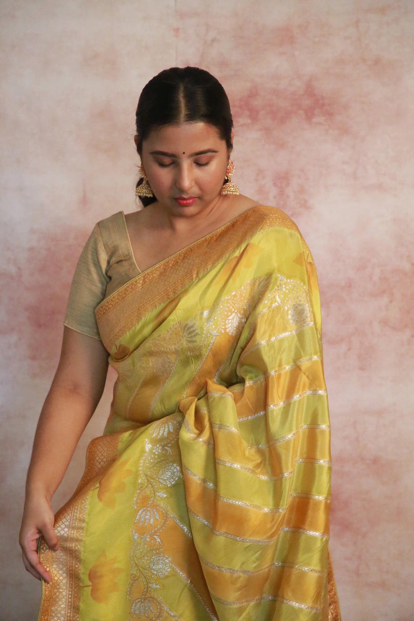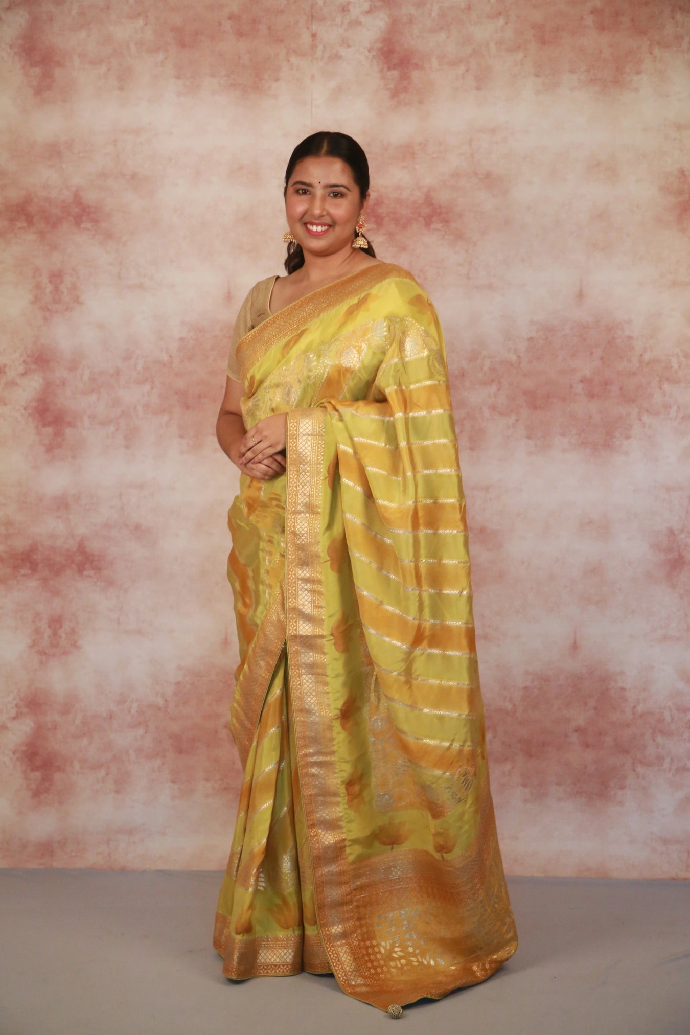 Experience the artistry of Artisanal Strokes! This lemon yellow saree features a Khaddi woven zari border and hand brush painted strokes. Elevate your style with this unique and vibrant creation.