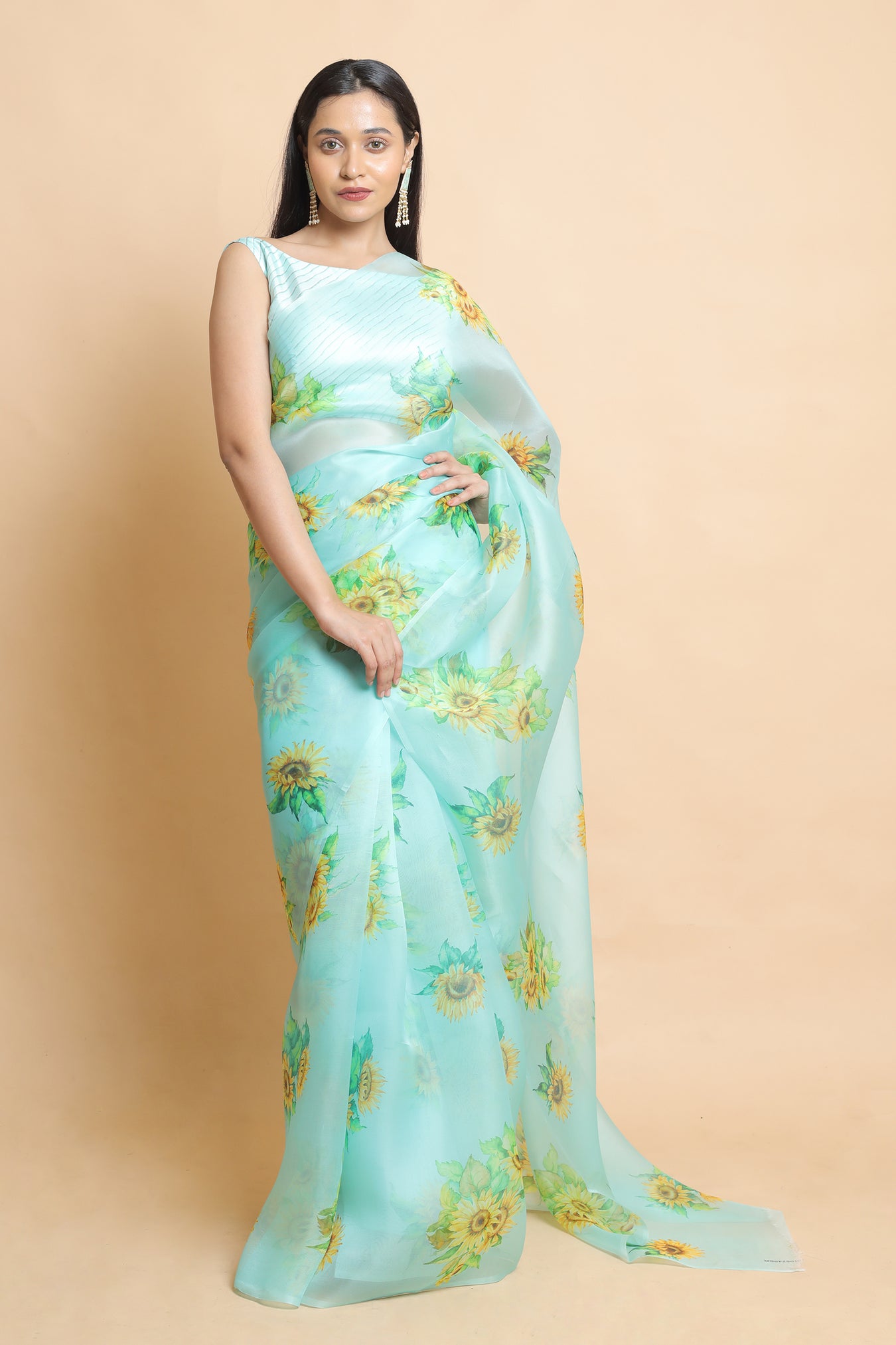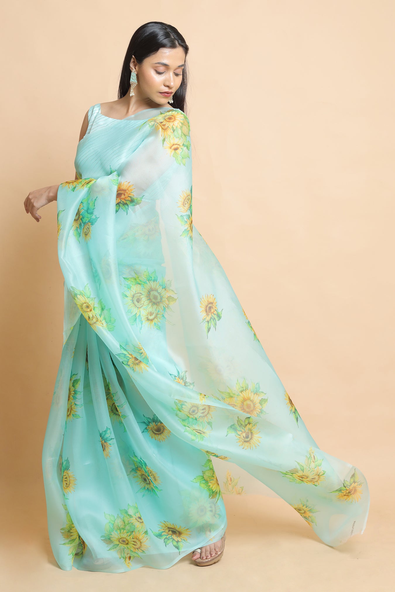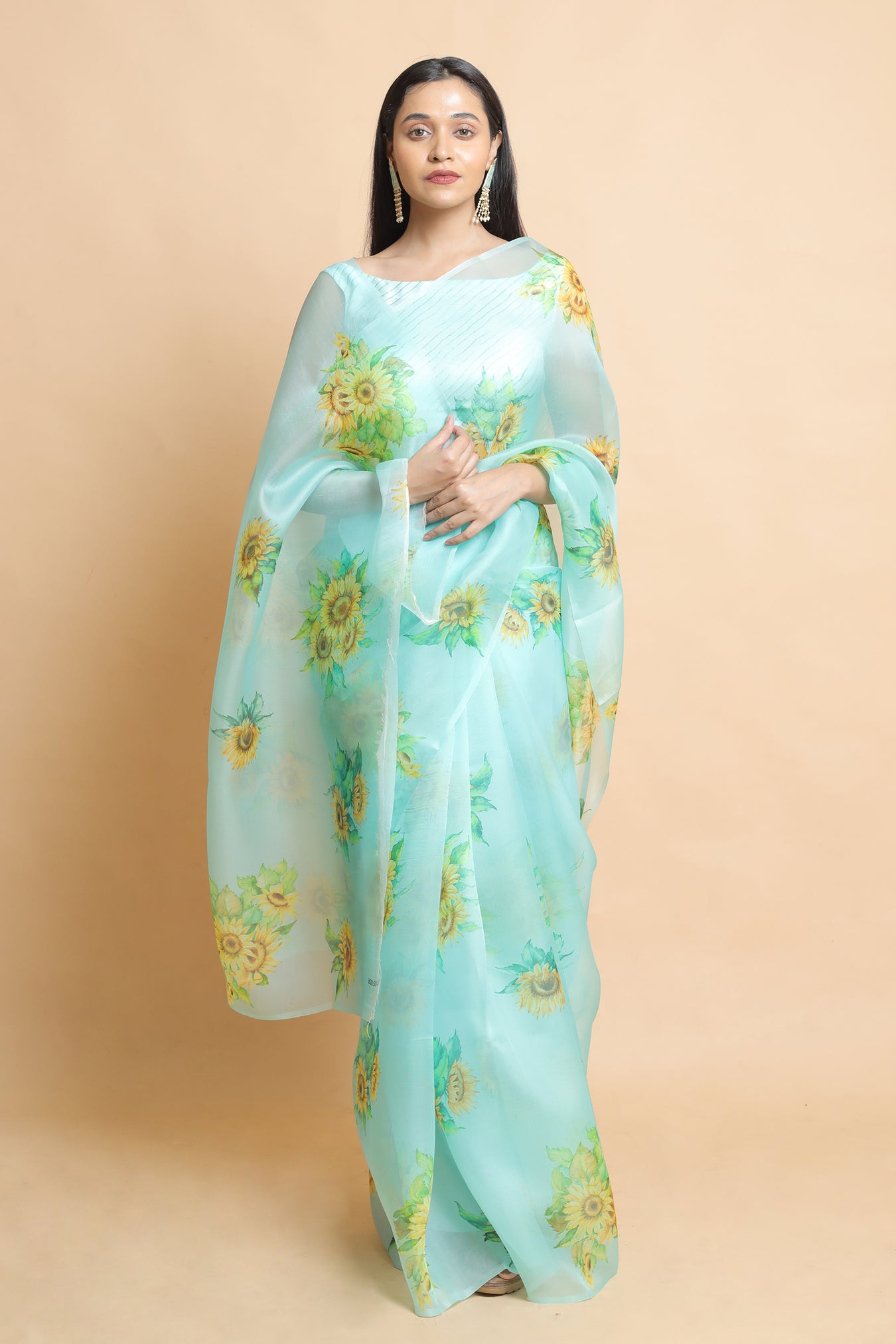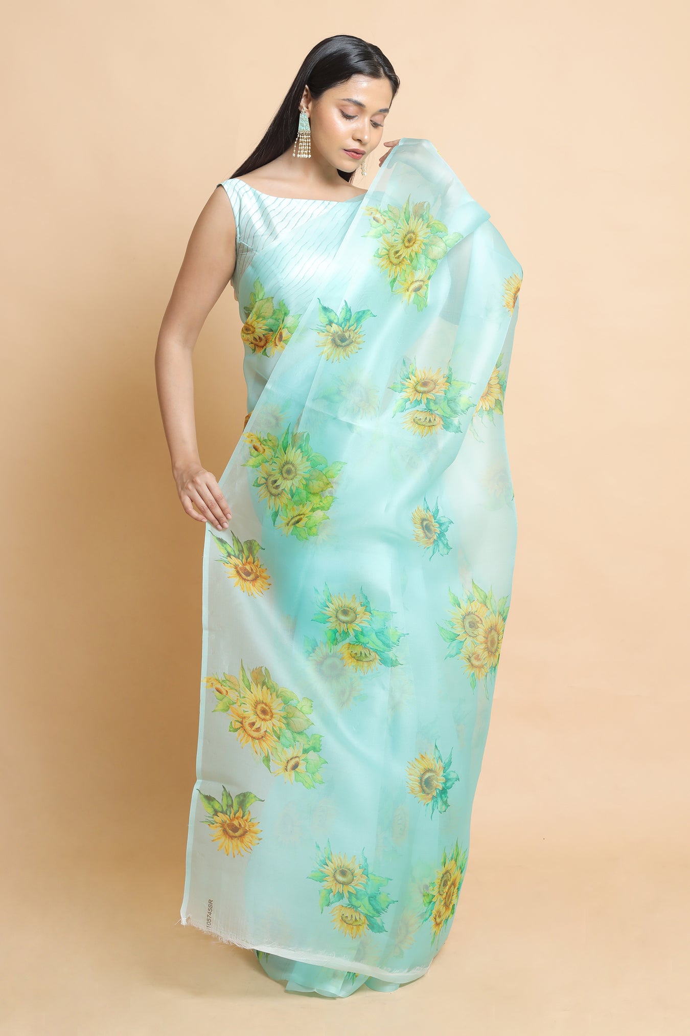 Pattern and print: Indulge in the simplicity and beauty of our half-and-half sari, where the luxurious feel of organza silk meets the smoothness of satin crepe. This saree, in a soft light sea green shade, is adorned with delicate hand-painted floral digital prints, embodying the essence of pure femininity.