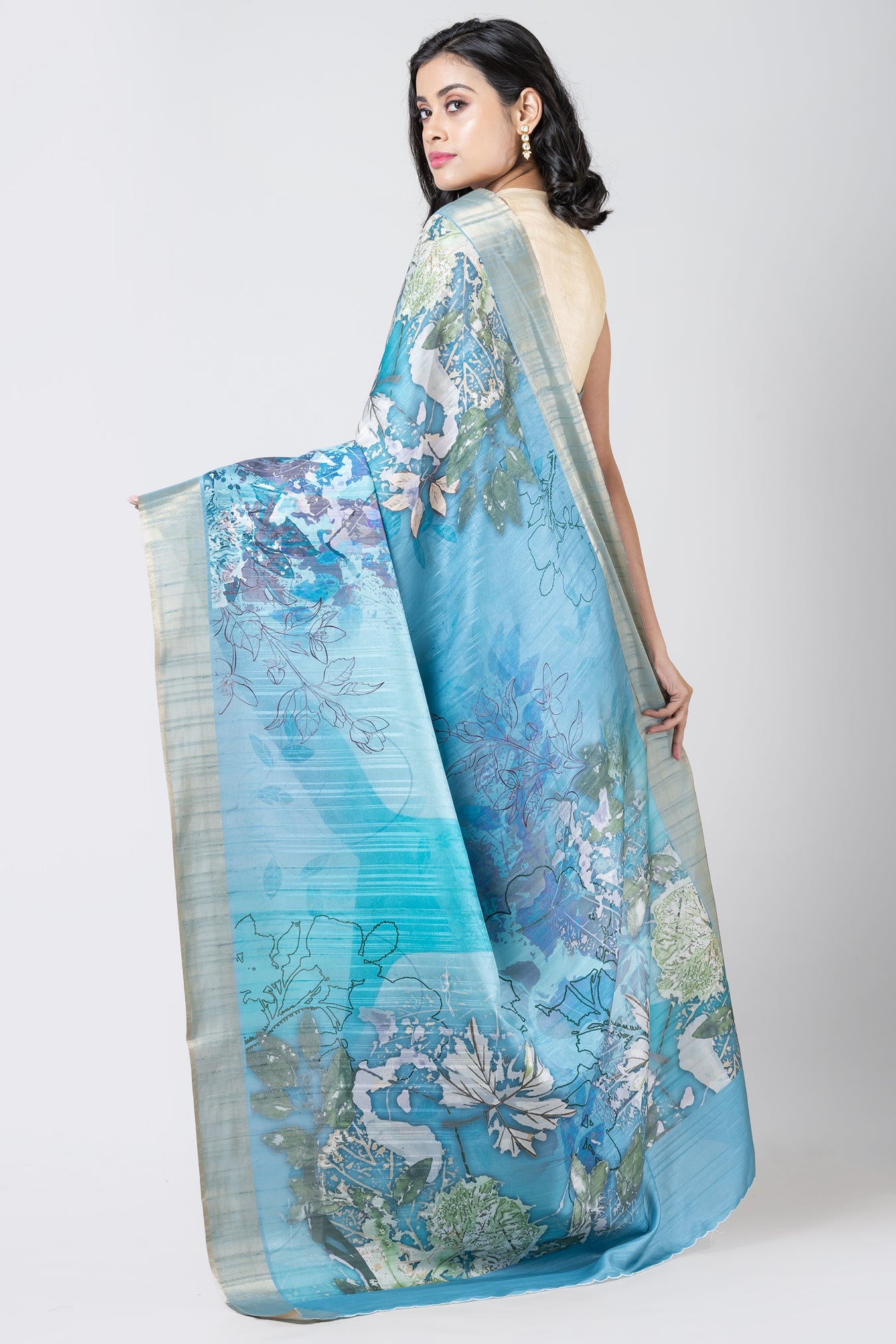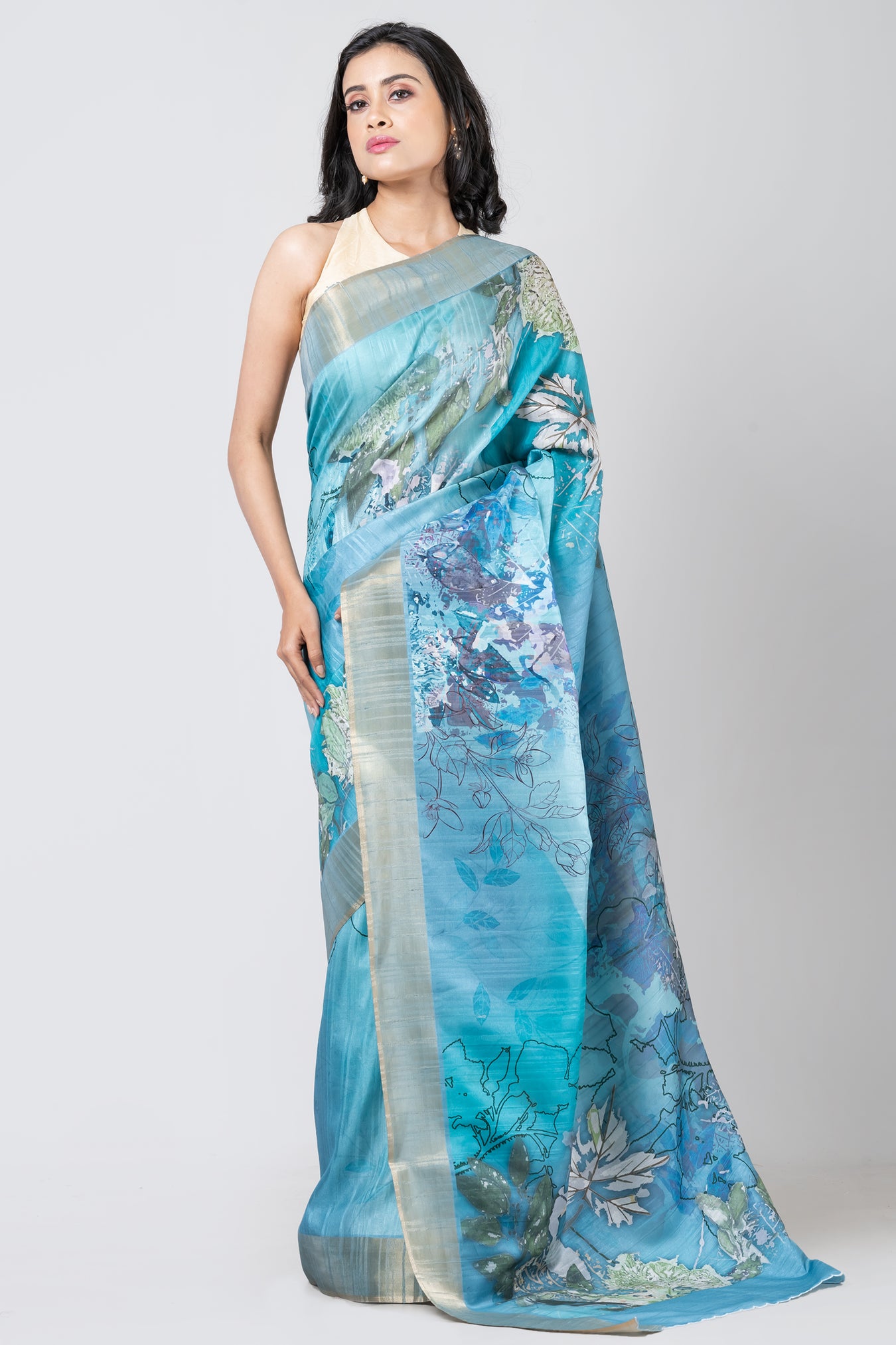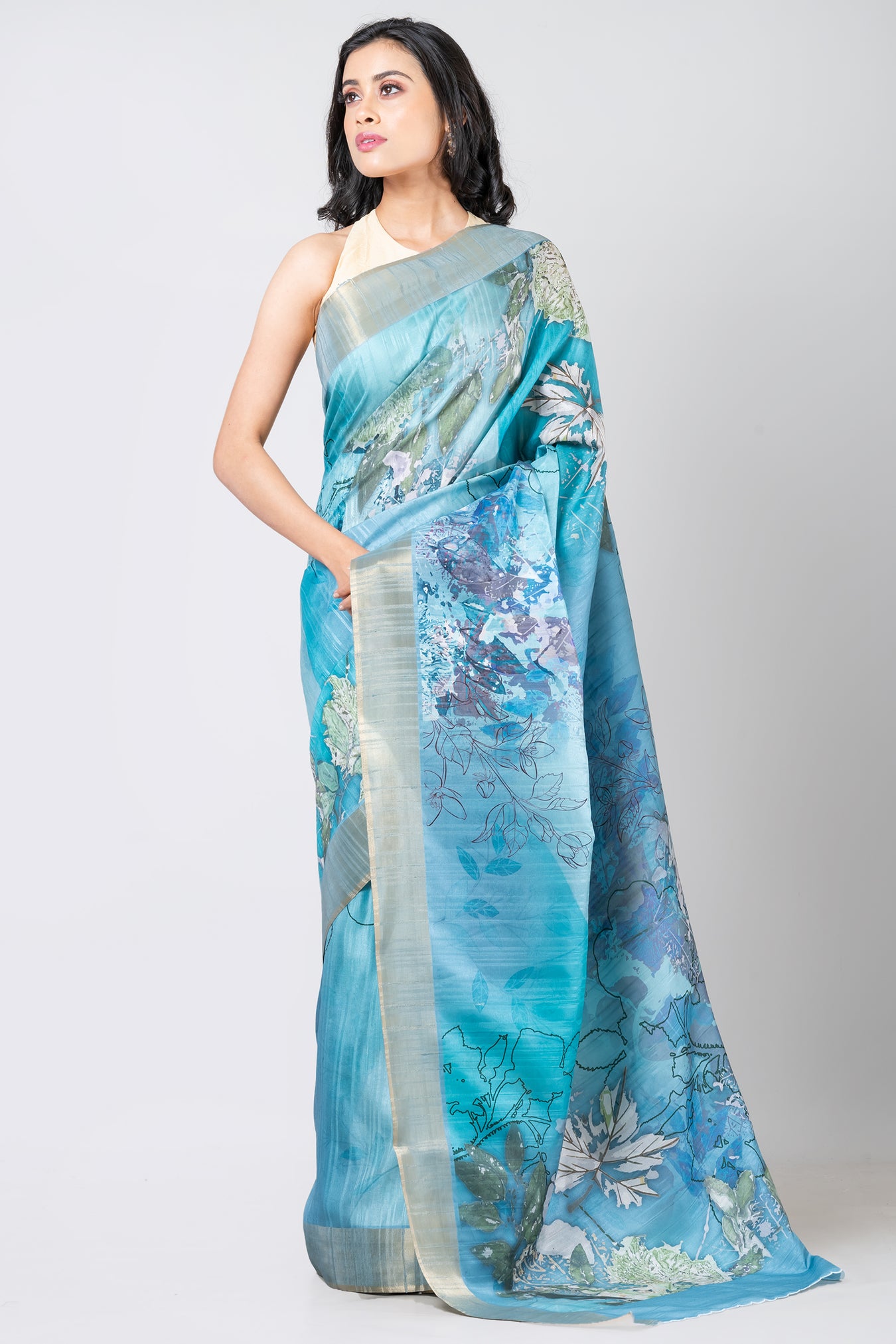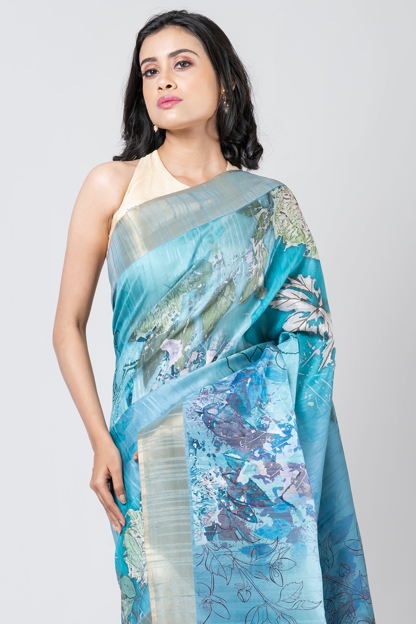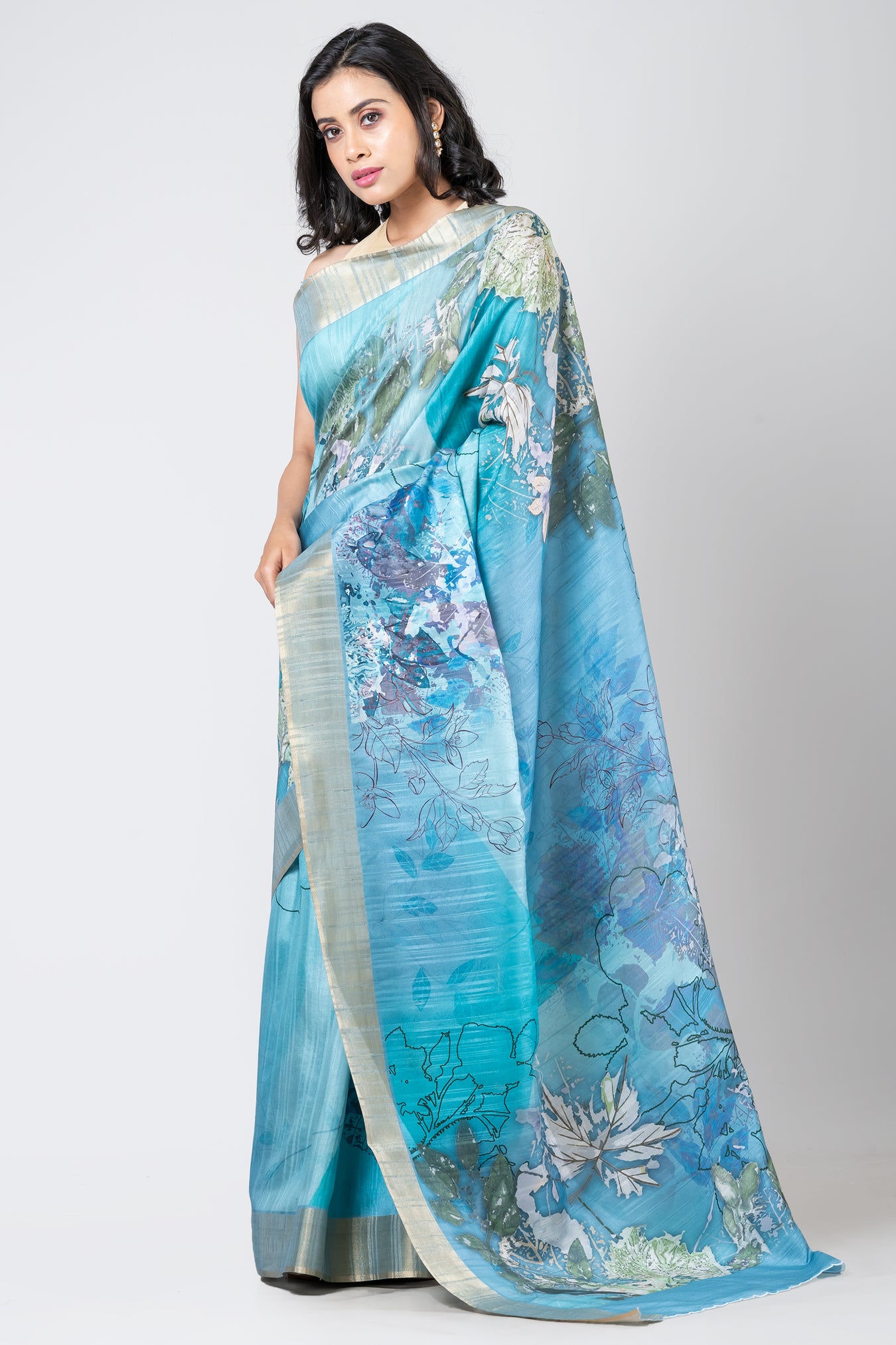 Size: S: 5.50Mtr B: 0.80MtrColour: SKY BLUEFabric: SEMI TUSSAR ZARIPattern and print: The sky blue semi-tussar saree embodies sophistication with its subtle color and refined zari border. Enhanced by a digital effect, the geometric flower and leaf patterns infuse vibrancy, creating an eye-catching ensemble that effortlessly draws attention and exudes modern elegance.Silk purity: Pack contains: 1 Saree, 1 BlouseCare instructions: Dry wash