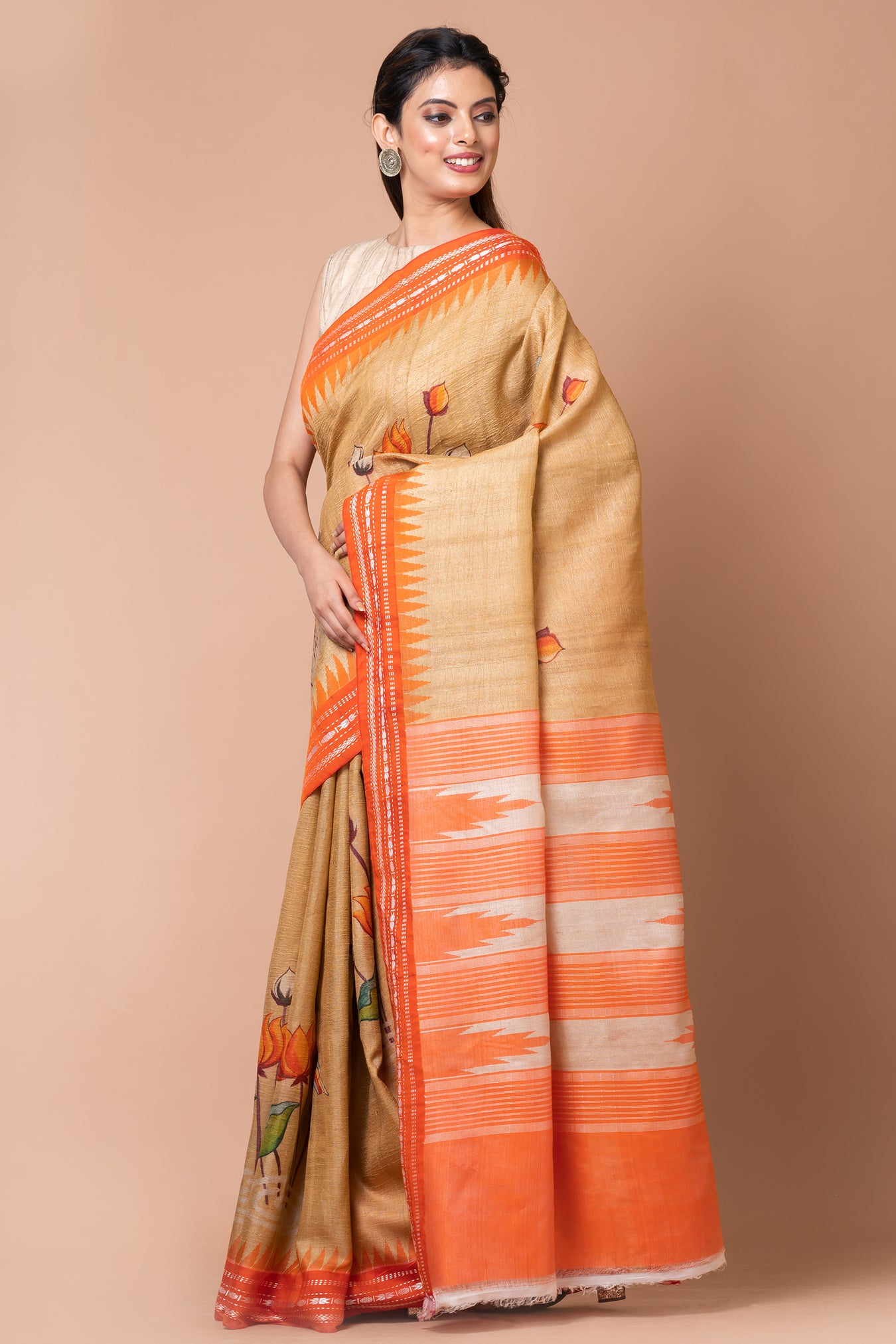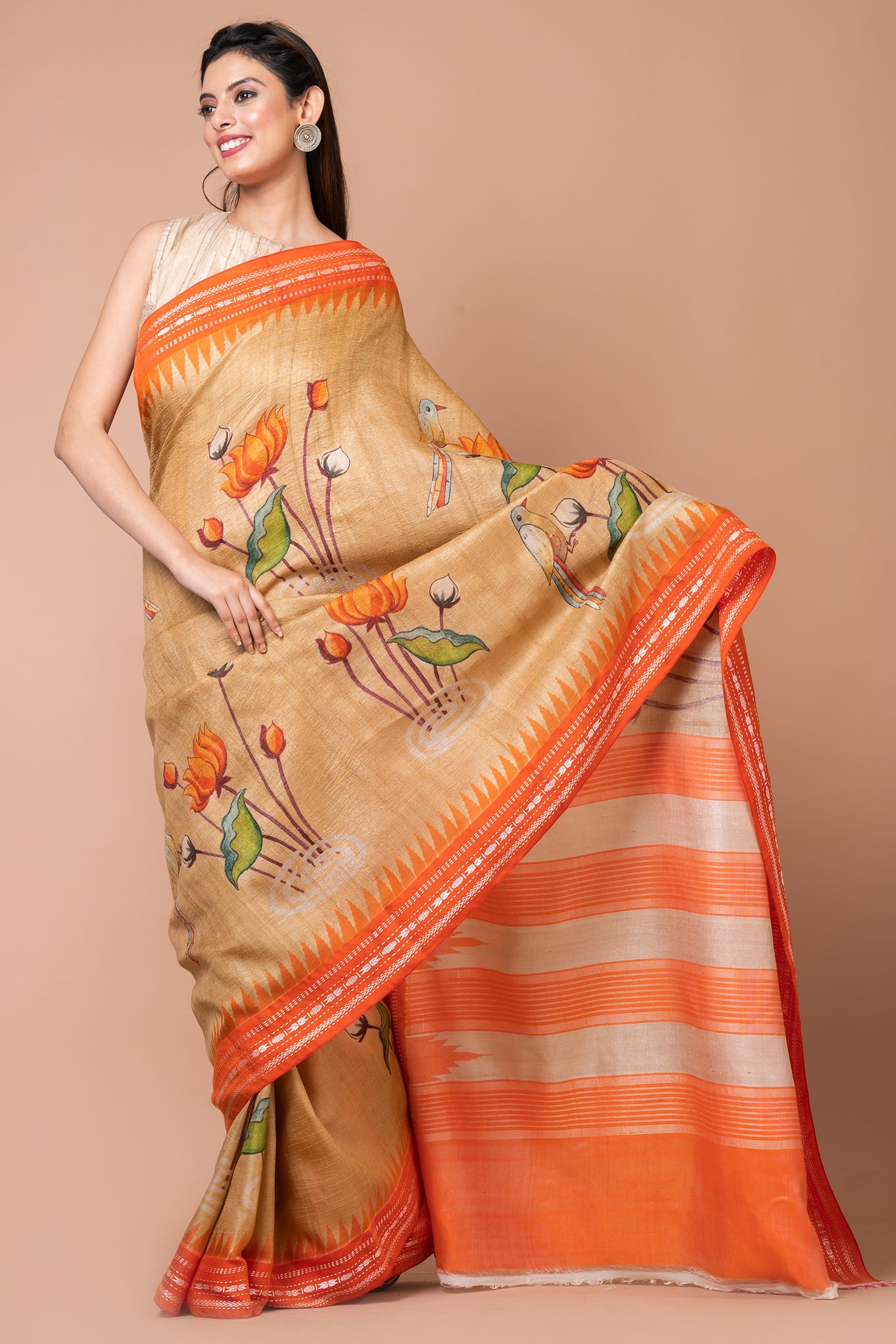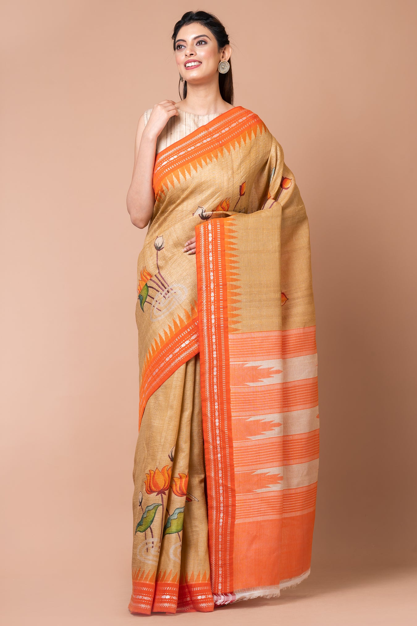 Size: 5.50Mtr B: 0.80MtrColour: Mustard Saree with Orange BorderFabric: Vidharbha Temple Handloom Tussar SareePattern and print: Embrace timeless elegance with the Vidharbha Temple Handloom Saree. Featuring a serene mustard base and a striking dark orange border, adorned with delicate lotus flowers. Perfect for any occasion, this saree embodies tradition and grace.Silk purity: Pure Tassur SilkPack contains: 1 Saree, 1 BlouseCare instructions: Dry wash
