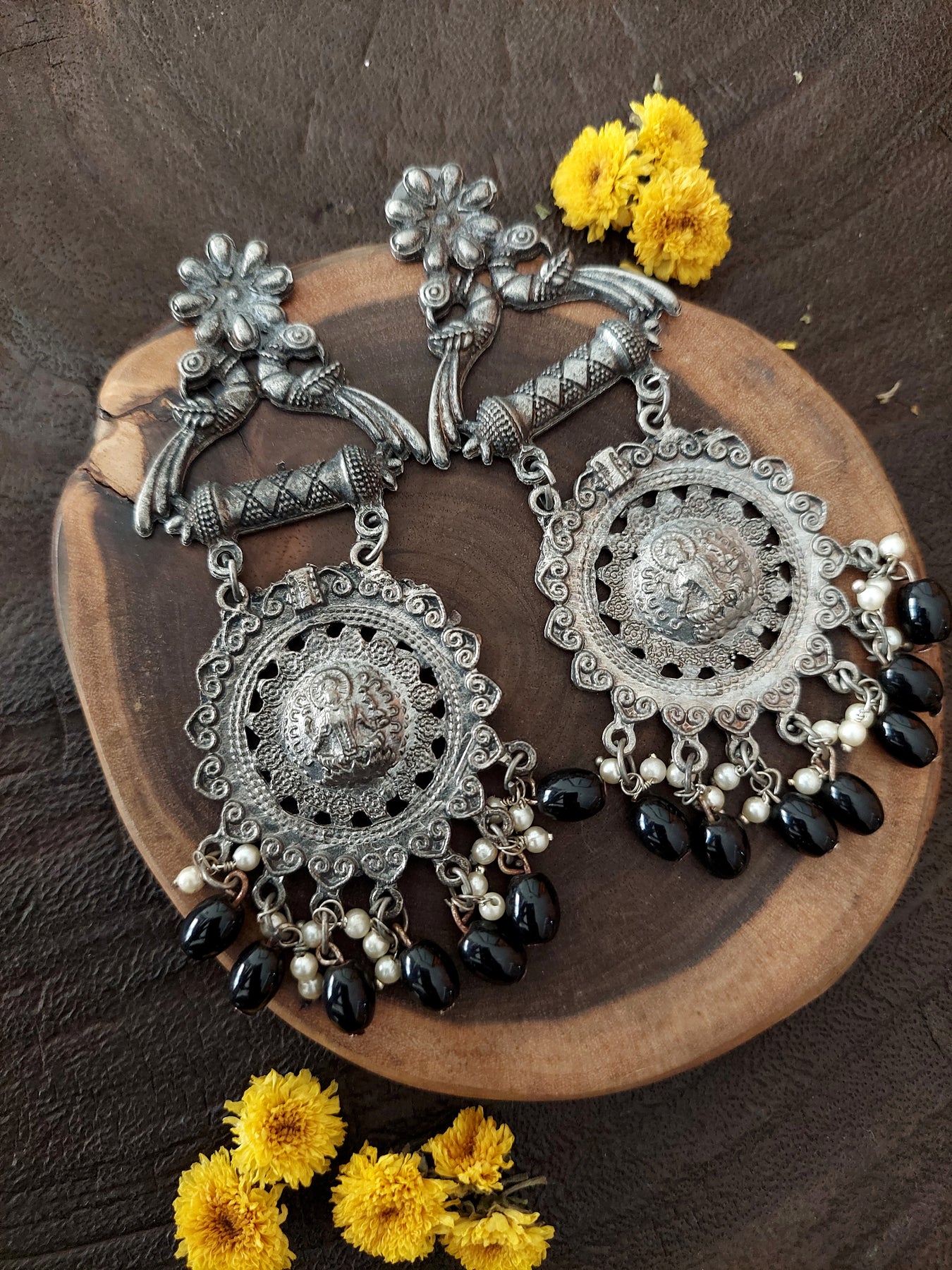 A traditional antique earring pair enhances your beauty while highlighting the essence of fashion. The piece is adorned with black and metal-like beads, which adds height to it. A fashionable yet traditional earring that may be worn and styled with a variety of outfits.