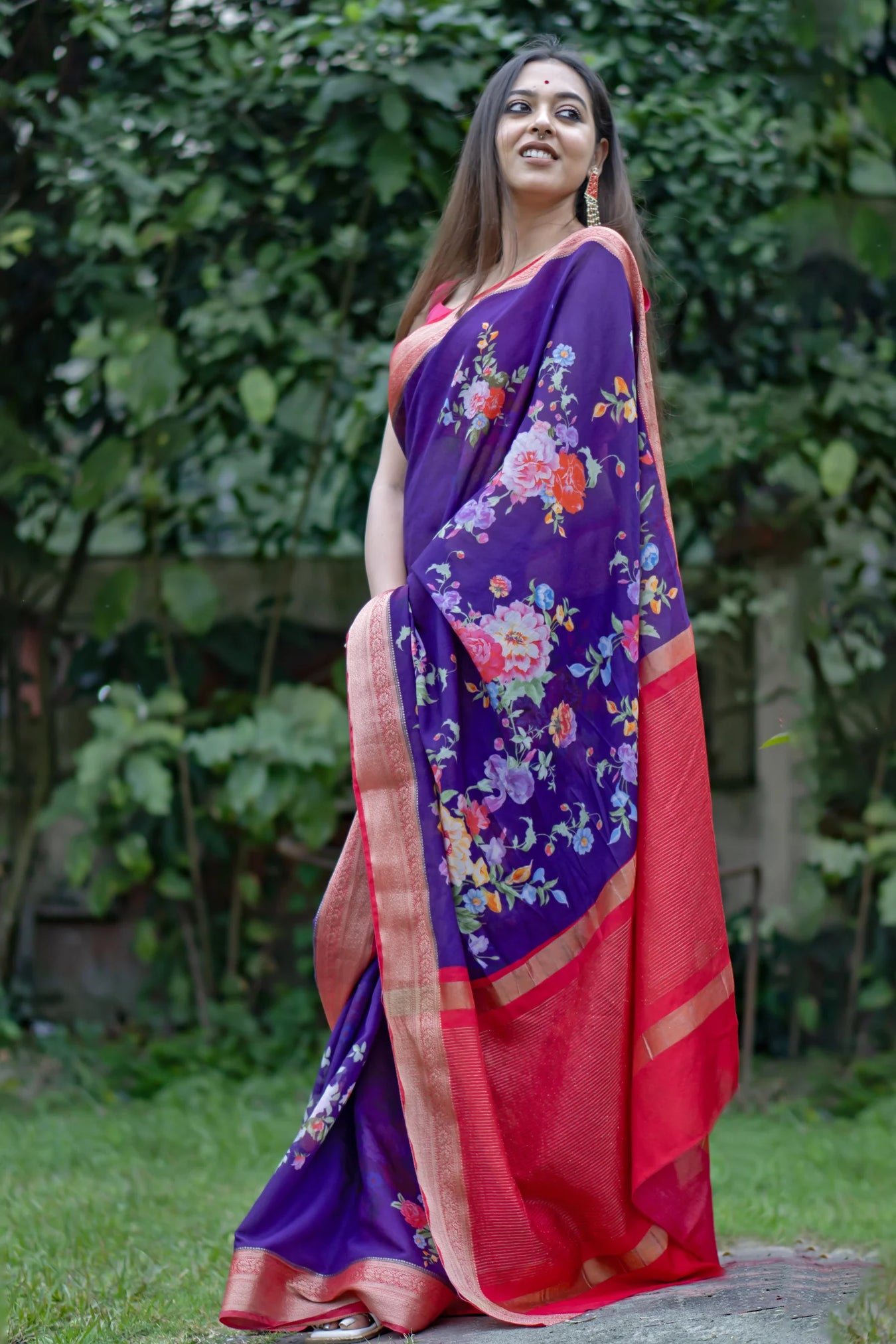 Size: 5.50Mtr B: 0.80MtrColour: VioletFabric: CHANDERIPattern and print: Drape yourself in the sheer elegance of this Violet-colored Chanderi saree, a quintessential embodiment of grace. Adorned with a bold red zari border, it exudes sophistication and timeless appeal. The allover saree boasts delicate watercolor flower designs, adding a touch of ethereal beauty to this classic ensemble. Perfect for any occasion.Pack contains:Â 1 Saree, 1 BlouseCare instructions:Â Dry wash