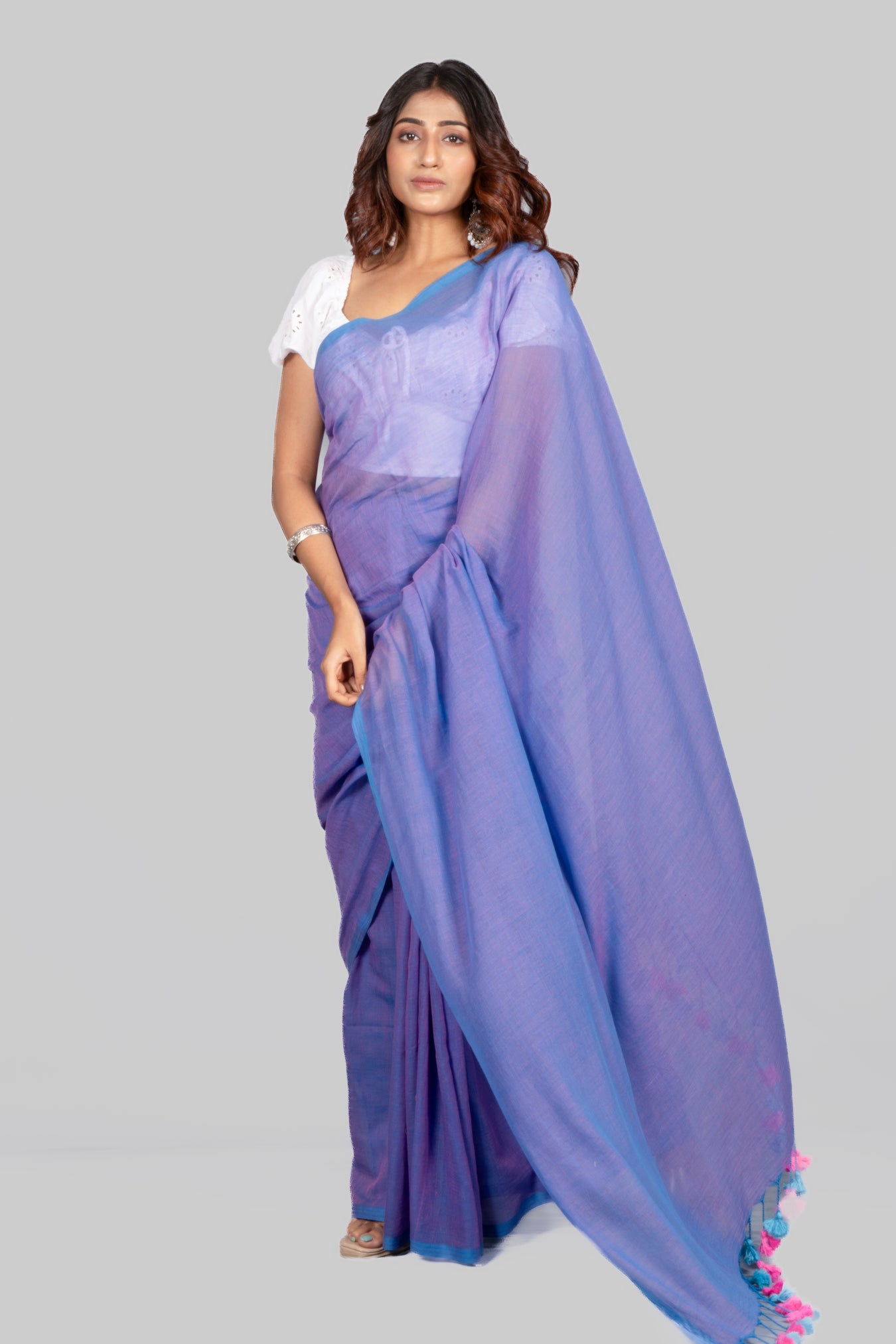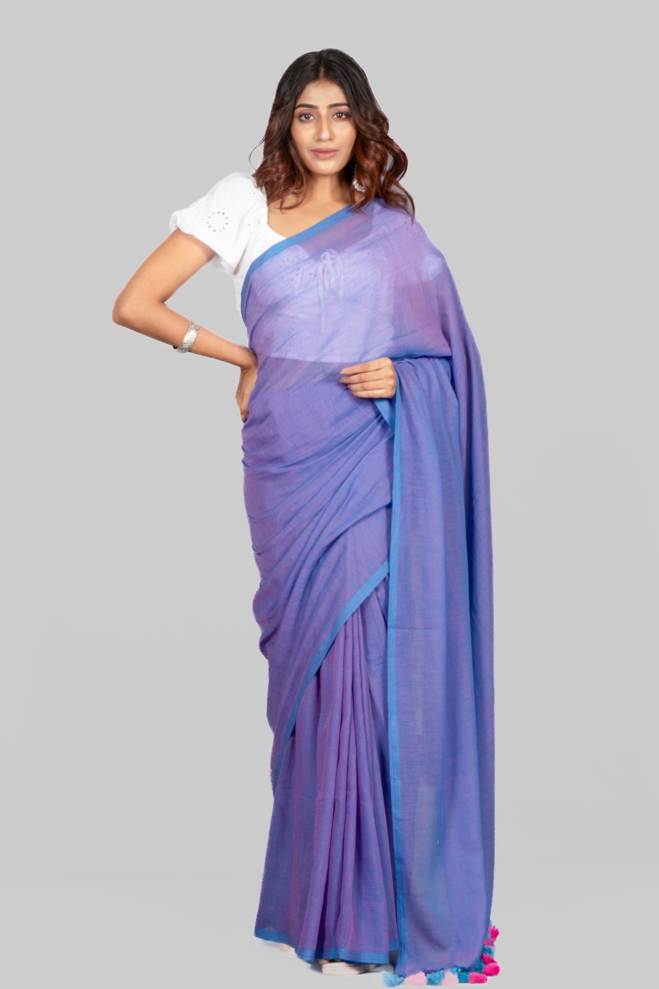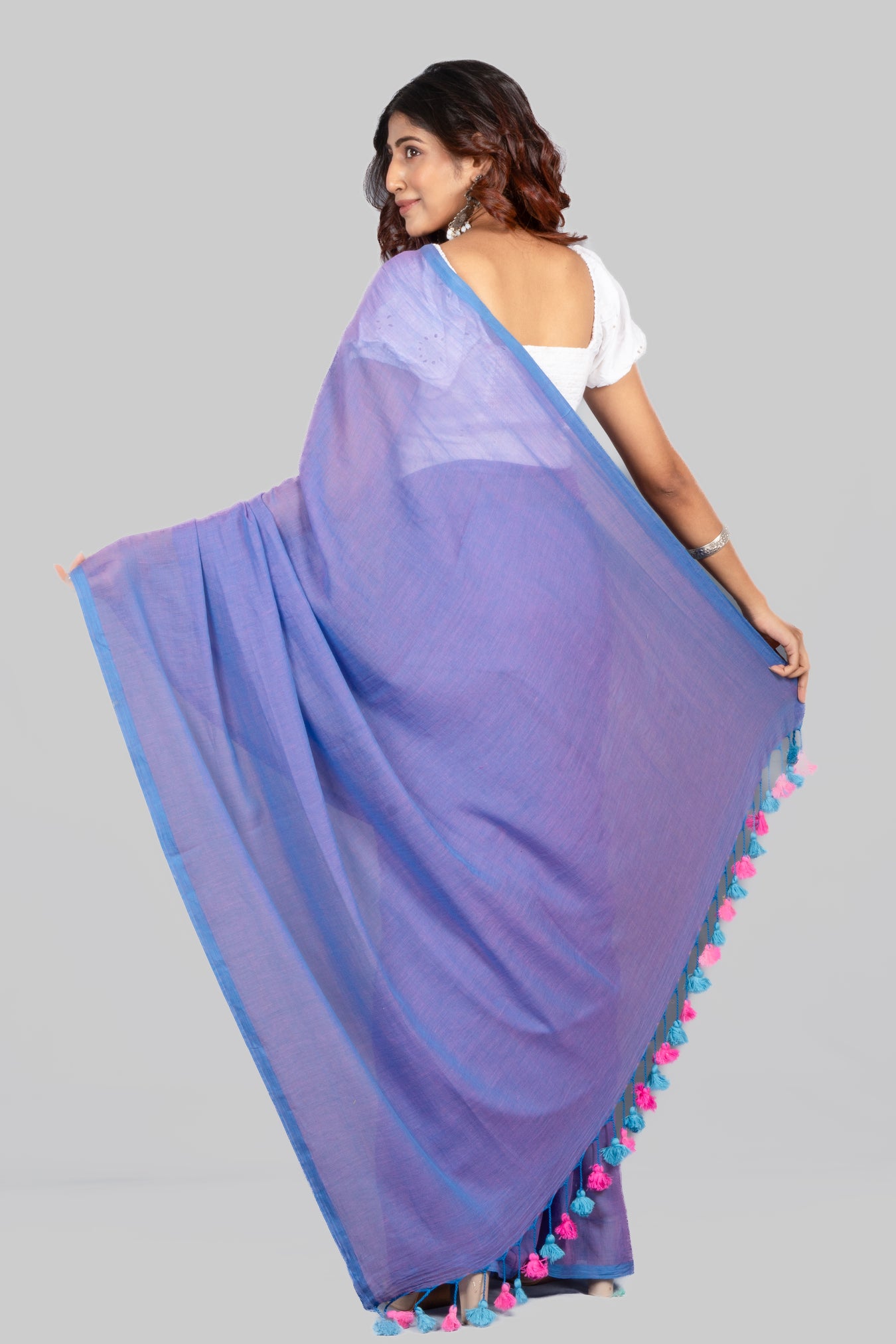 Color: Dual tone Fabric: MulmulPattern and print: This soft mulmul saree in dual tone is one of a kind with multi-color tassels. The saree brings out the softness from within and making it a statement look.