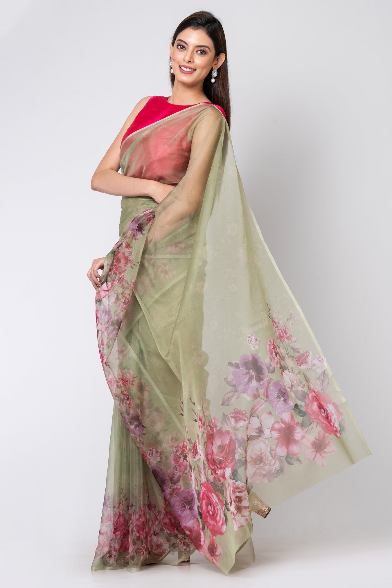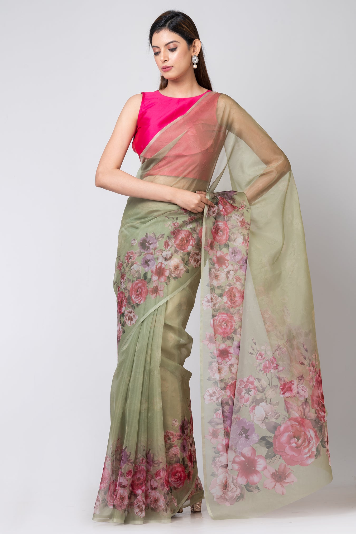 Size: 5.50Mtr B: 0.80MtrColour: MEHANDIFabric: OrganzaPattern and print: Â The mehandi organza saree is made of a delicate, lightweight fabric that drapes elegantly. Its calming color is enhanced by a lively Colorful flowers design.Pack contains:Â 1 Saree, 1 BlouseCare instructions:Â Dry wash
