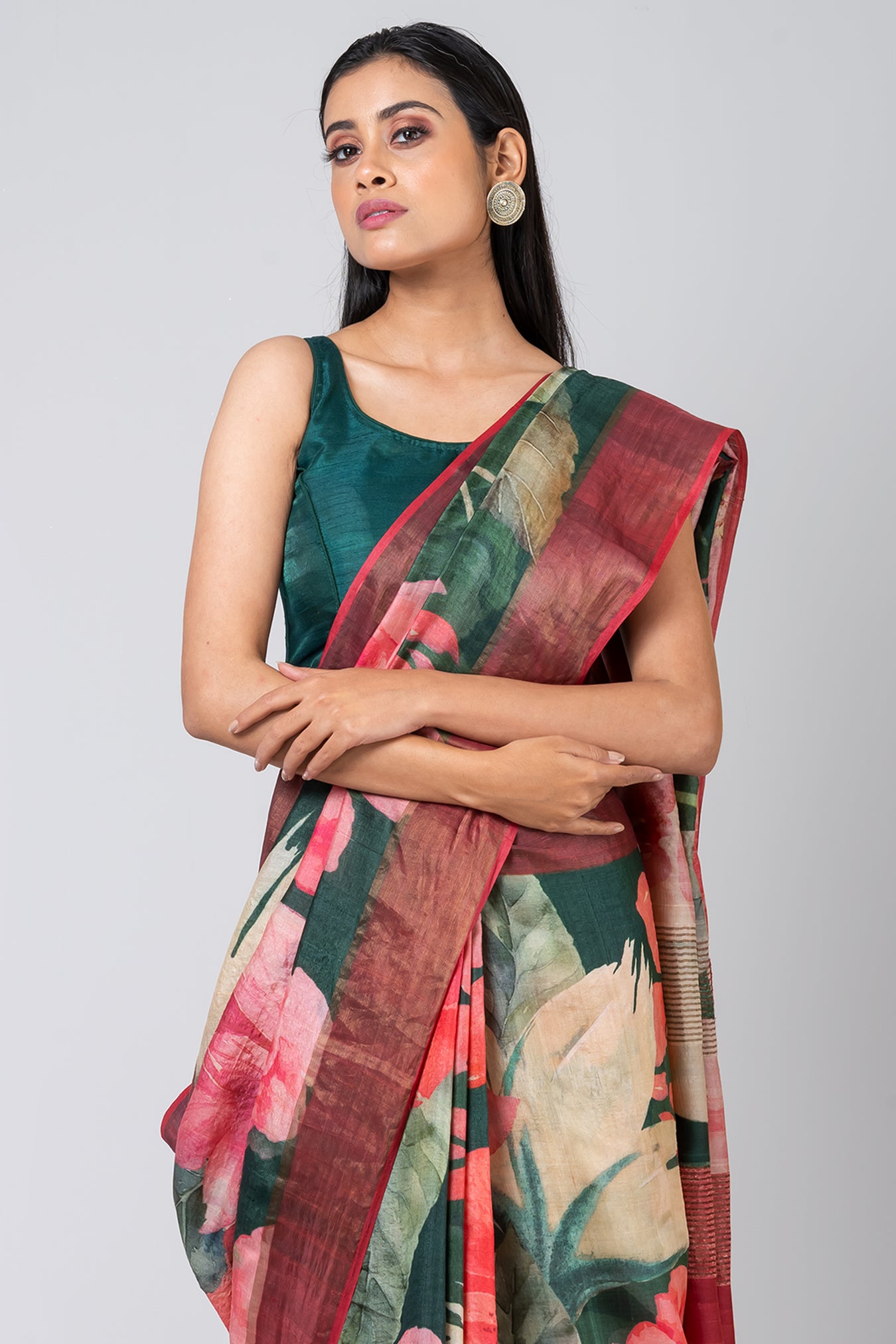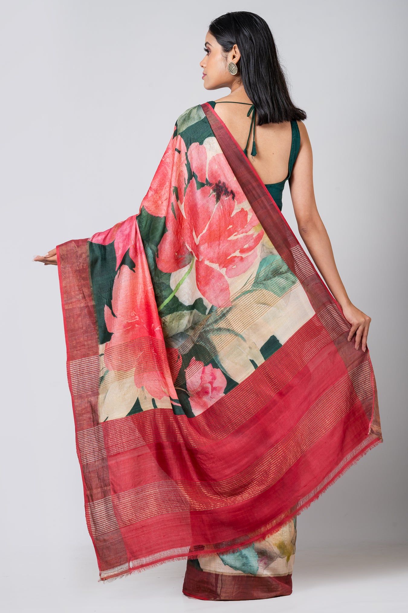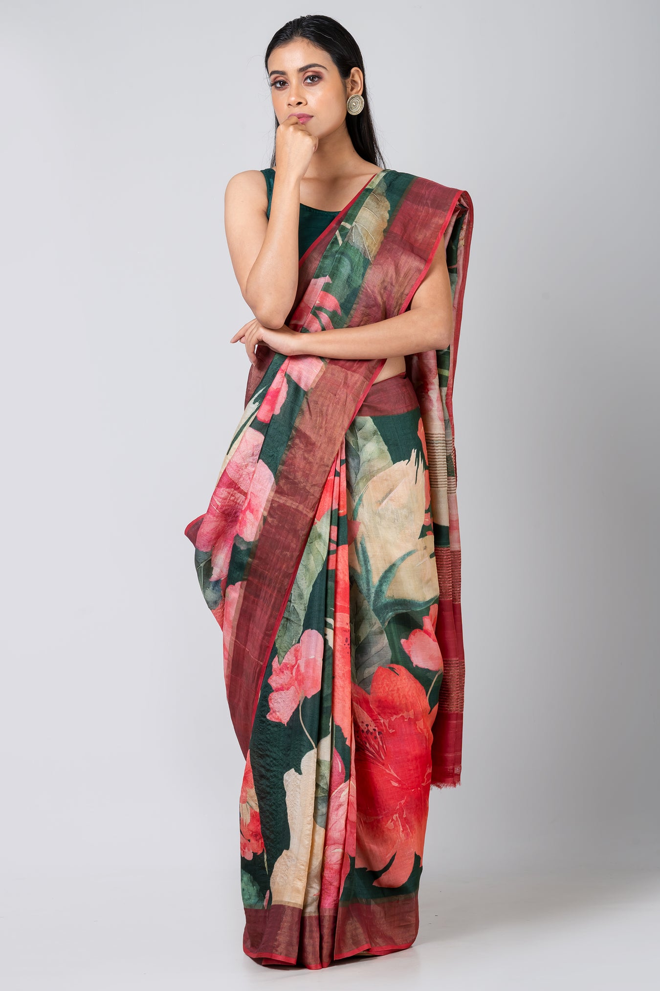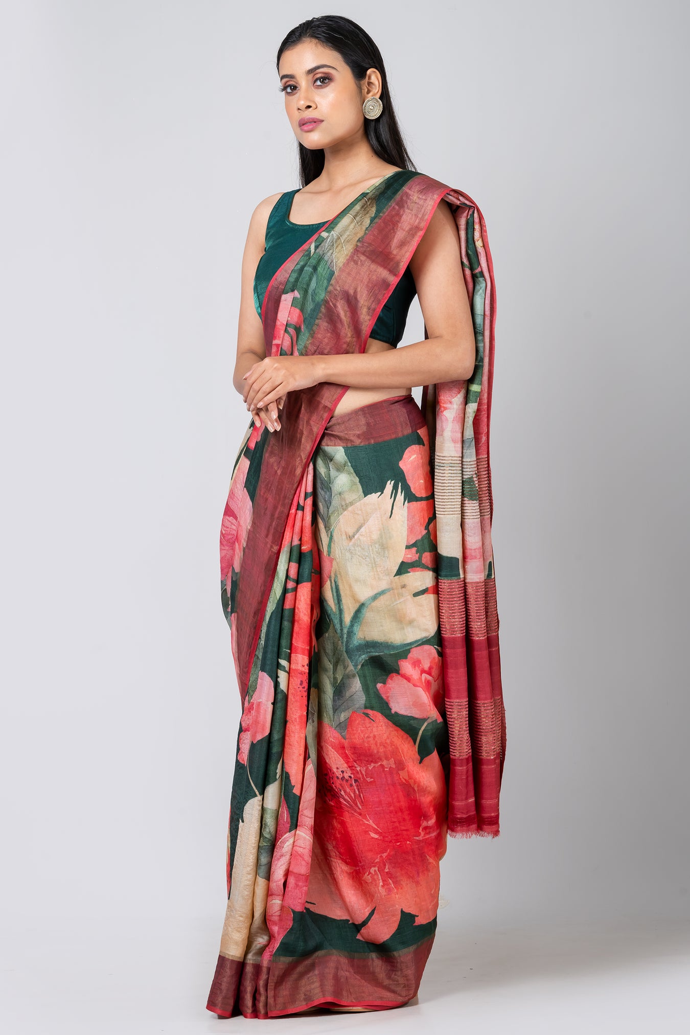 Size: S: 5.50Mtr B: 0.80MtrColour: BOTTLE GREENFabric: TUSSAR ZARIPattern and print: Make a bold statement with our green saree showcasing a rich red zari border and captivating big digital flower print throughout. This eye-catching ensemble effortlessly combines tradition with contemporary flair."Silk purity: Pack contains: 1 Saree, 1 BlouseCare instructions: Dry wash