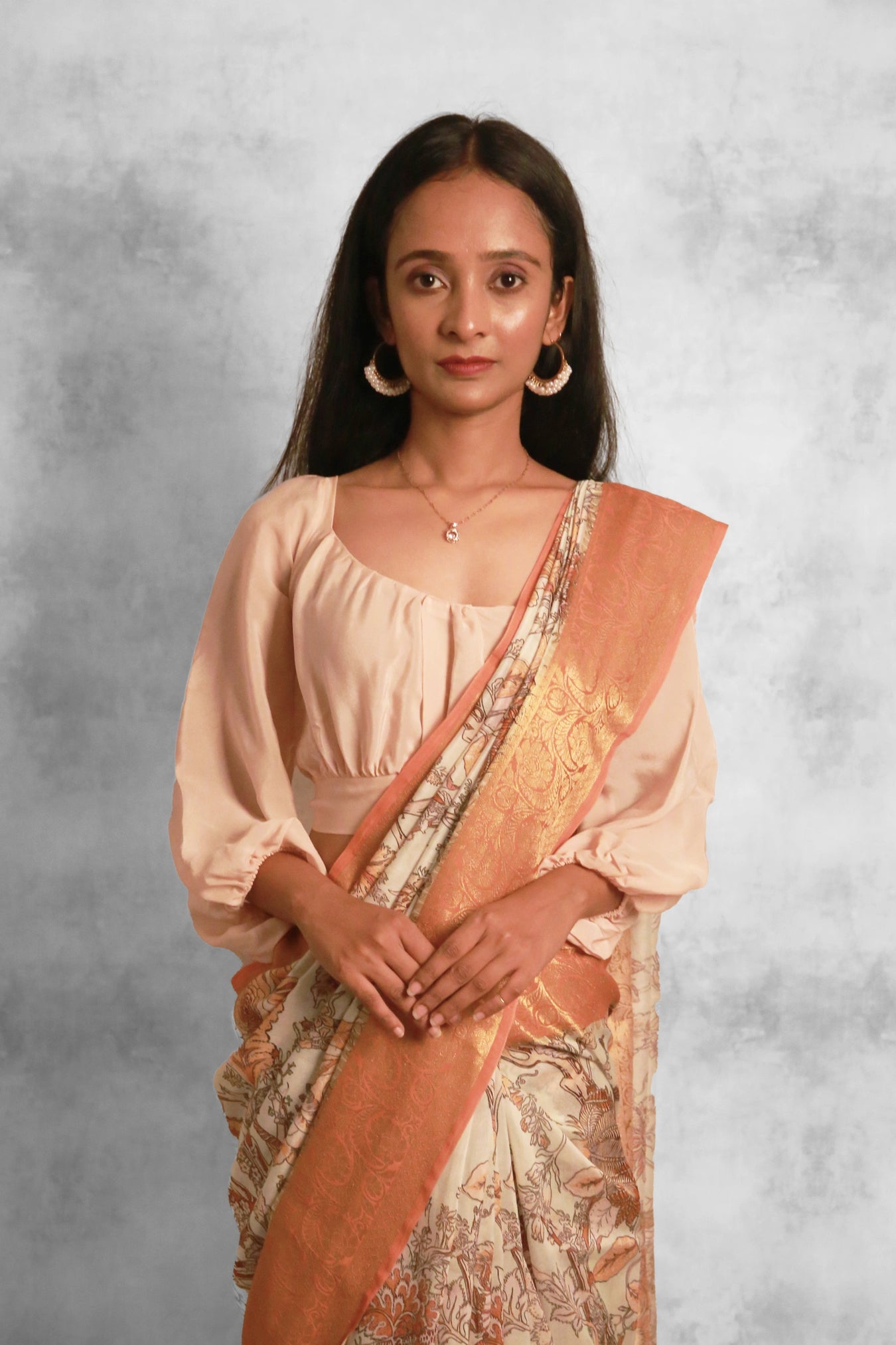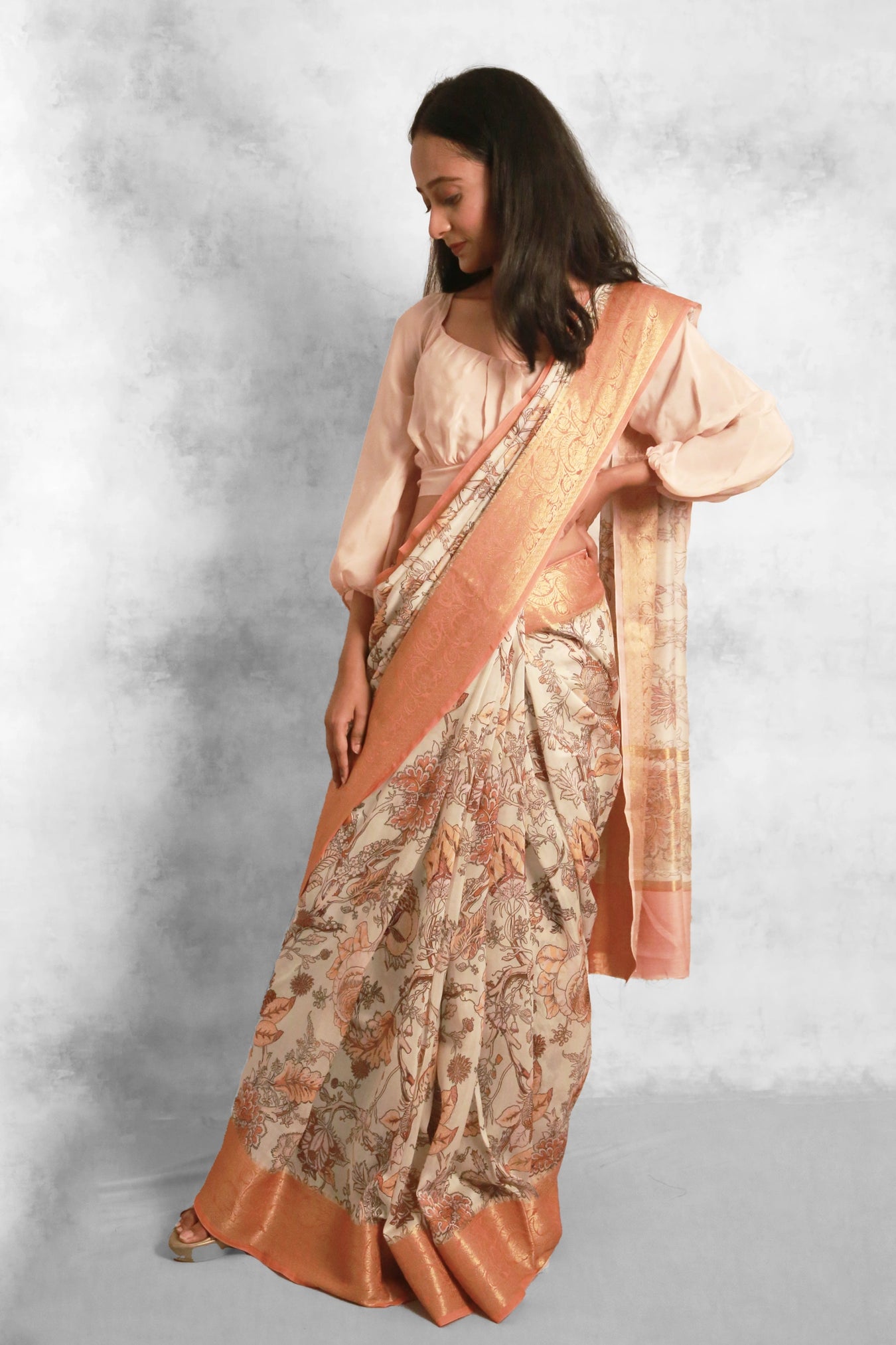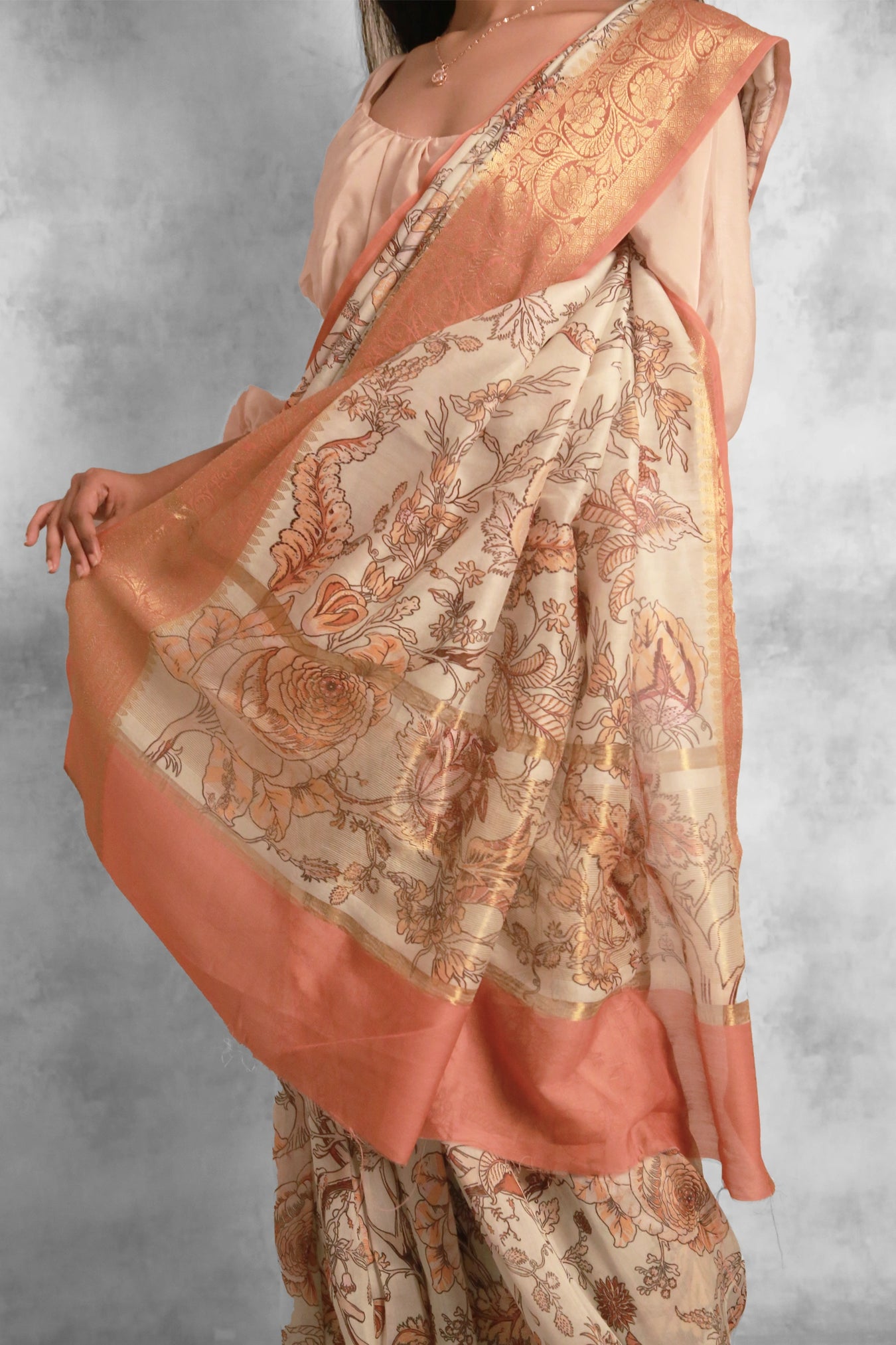 Fabric: Chanderi Zari Woven sareeColor: Sage with orange borderPattern and Print: Drape yourself in the sheer elegance of this Sage-colored Chanderi saree, a quintessential embodiment of grace. Adorned with a bold orange zari border, it exudes sophistication and timeless appeal. The allover saree boasts delicate watercolor flower designs, adding a touch of ethereal beauty to this classic ensemble. Perfect for any occasion.Silk Purity: Pure ChanderiPack Contains: 1 Saree, 1 BlouseCare Instructions: Dry wash                  Â