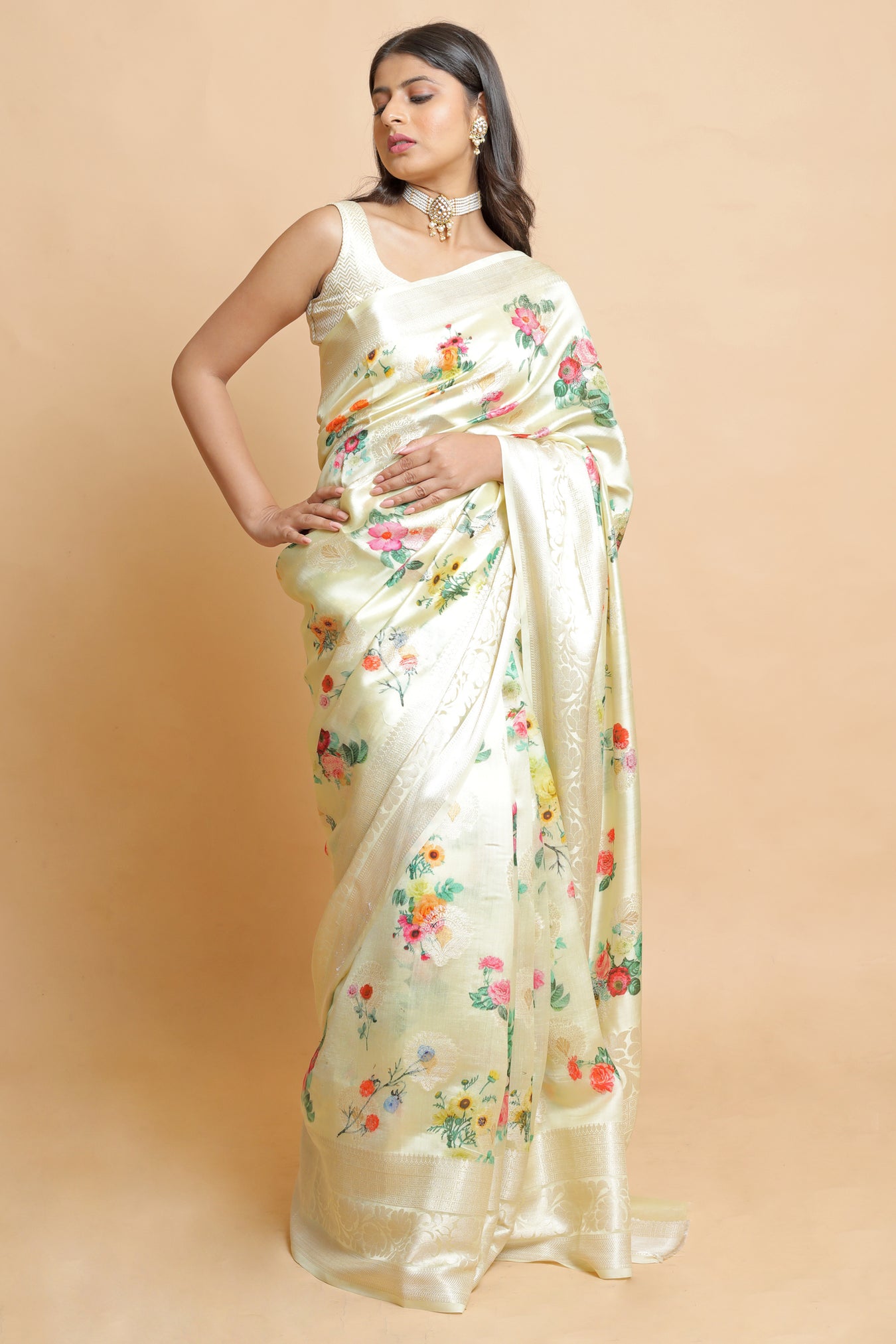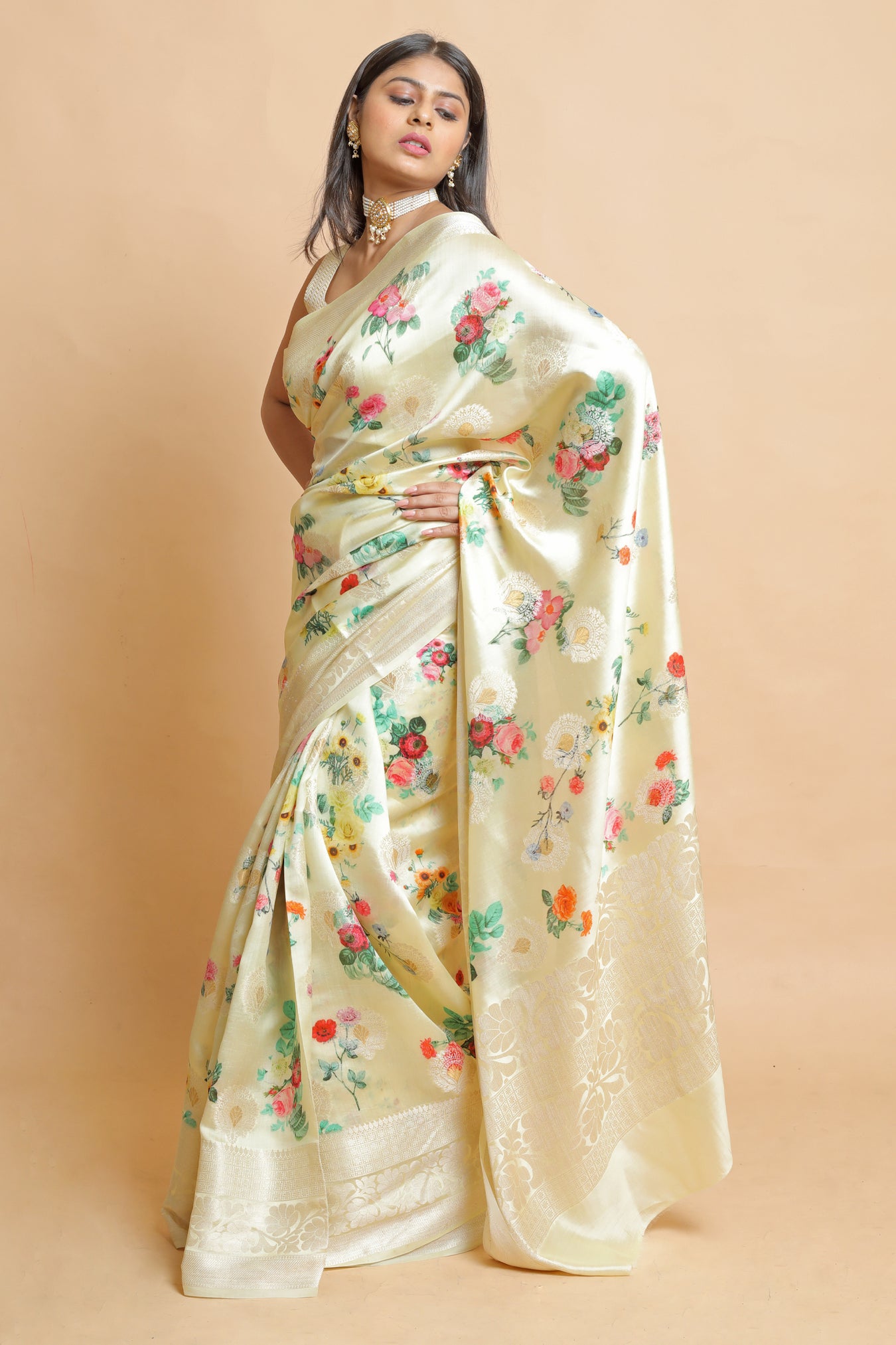 Colour: LIGHT YELLOWFabric: TUSSAR BENARASIPattern and print: Chinyia silk draped with delicate falls about feminine curves, releasing gloss and lustre. . The saree is embellished with digitally printed floral prints all over it. A lavishly done zari border, as well as a delicate pastel tint, complement the exuberance of the floral bunches. The saree is a one-of-a-kind combination of modernism, history, and feminine elegance.
