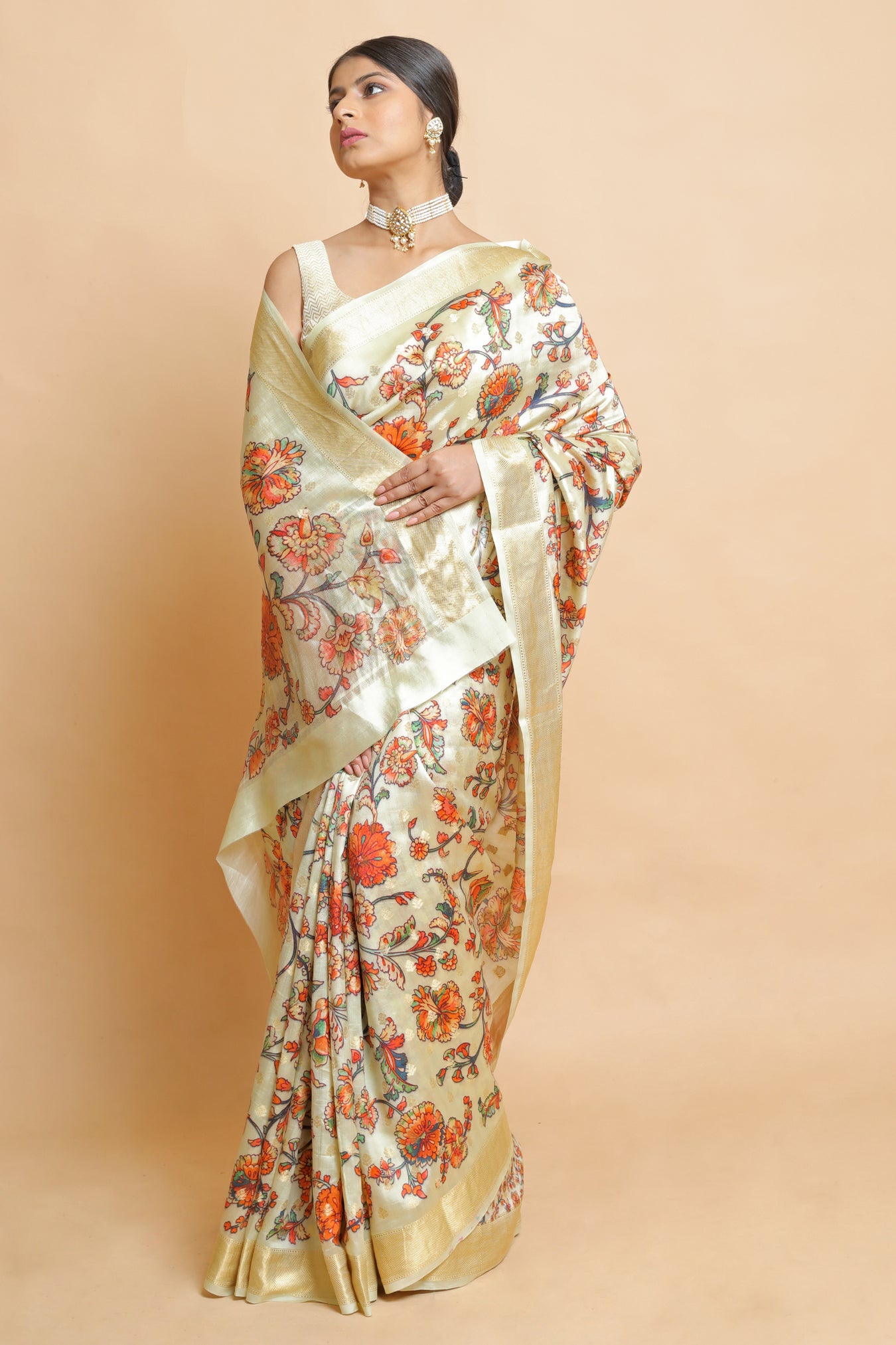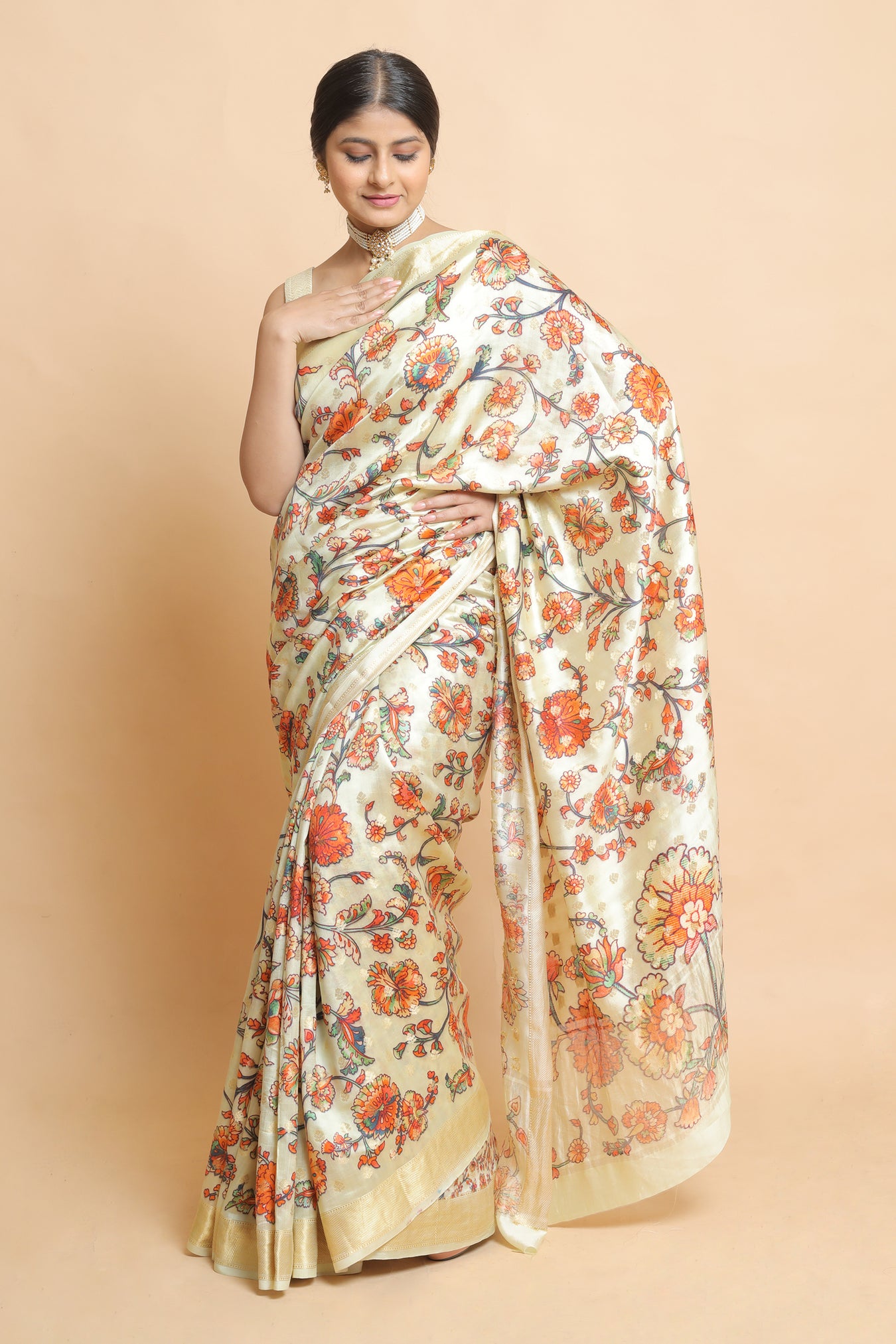 Colour: BEIGEFabric: Chinyia silkPattern and print: Chinyia silk is woven into a beautiful saree that emits shine and luster while draping smoothly with soft falls around feminine curves. Beautiful detailed stylized Kalamkari motifs complements and adds value to the saree. The saree is embellished with colourful decorative jaal floral prints that have been digitally done all over. A soft pastel shade complements the shine and vibrancy of the floral bunches, as does a richly done wide zari border. The saree is a one-of-a-kind expression of modernity, heritage, and feminine beauty. The piece accentuates your softness, beauty, and elegance.Silk purity: Pack contains: 1 Saree, 1 BlouseCare instructions: Dry wash