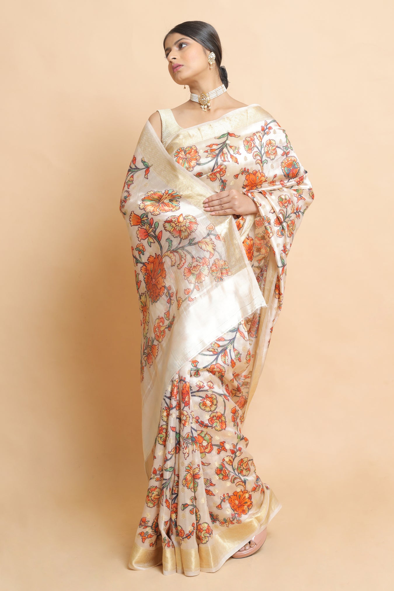 Colour: CREAMFabric: Chinyia silkPattern and print: Chinyia silk woven into a lovely saree with a lustrous sheen, draping gently and softly around feminine curves. Colorful ornamental floral prints have been digitally applied all over the saree. A light pastel tint, paired with a finely done contrasting large zari border, complements the luster and vitality of the floral bunches. The saree is a one-of-a-kind combination of modernism, heritage, and feminine beauty. The garment brings out your inner softness, attractiveness, and grace.Silk purity: Pack contains: 1 Saree, 1 BlouseCare instructions: Dry wash