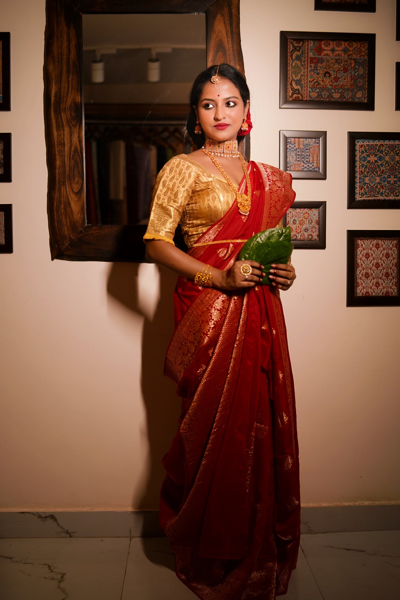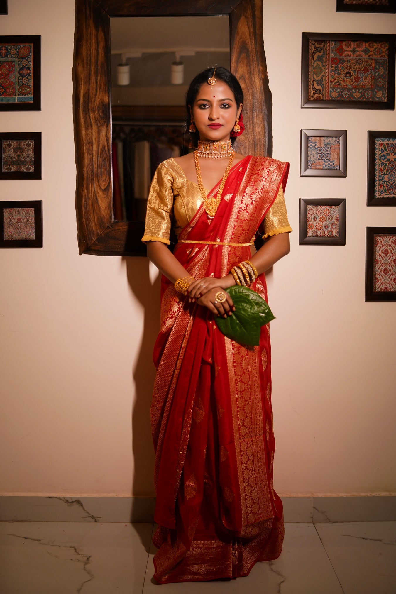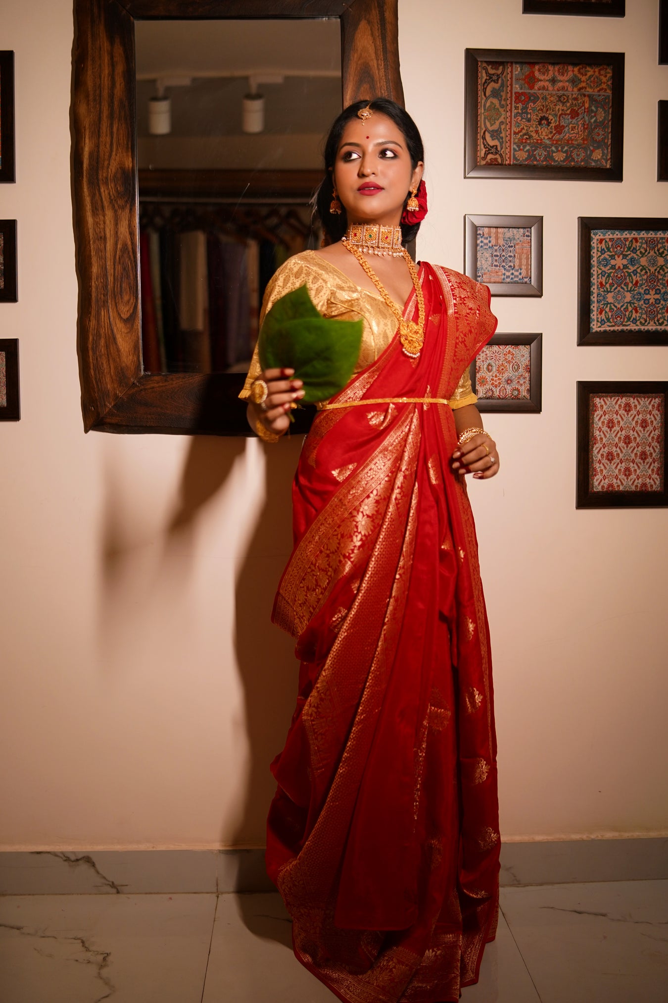 Color: Red & Golden zariFabric: KHADDI BENARASI Pattern and print: This Red Khaddi Benarasi saree is a gorgeous piece for any special occasion. The exquisite zari work all over the body enhances the beauty of the floral patterns making it look traditional and classy. Embrace your femininity and exude elegance with must have in your wardrobe.Care instructions: Dry wash