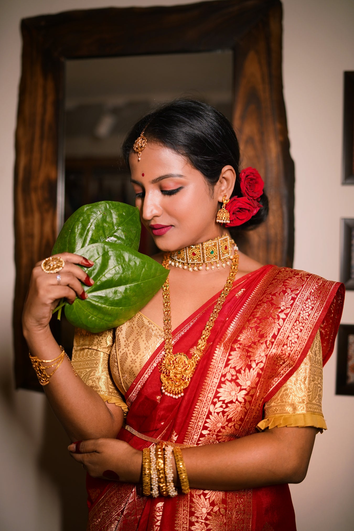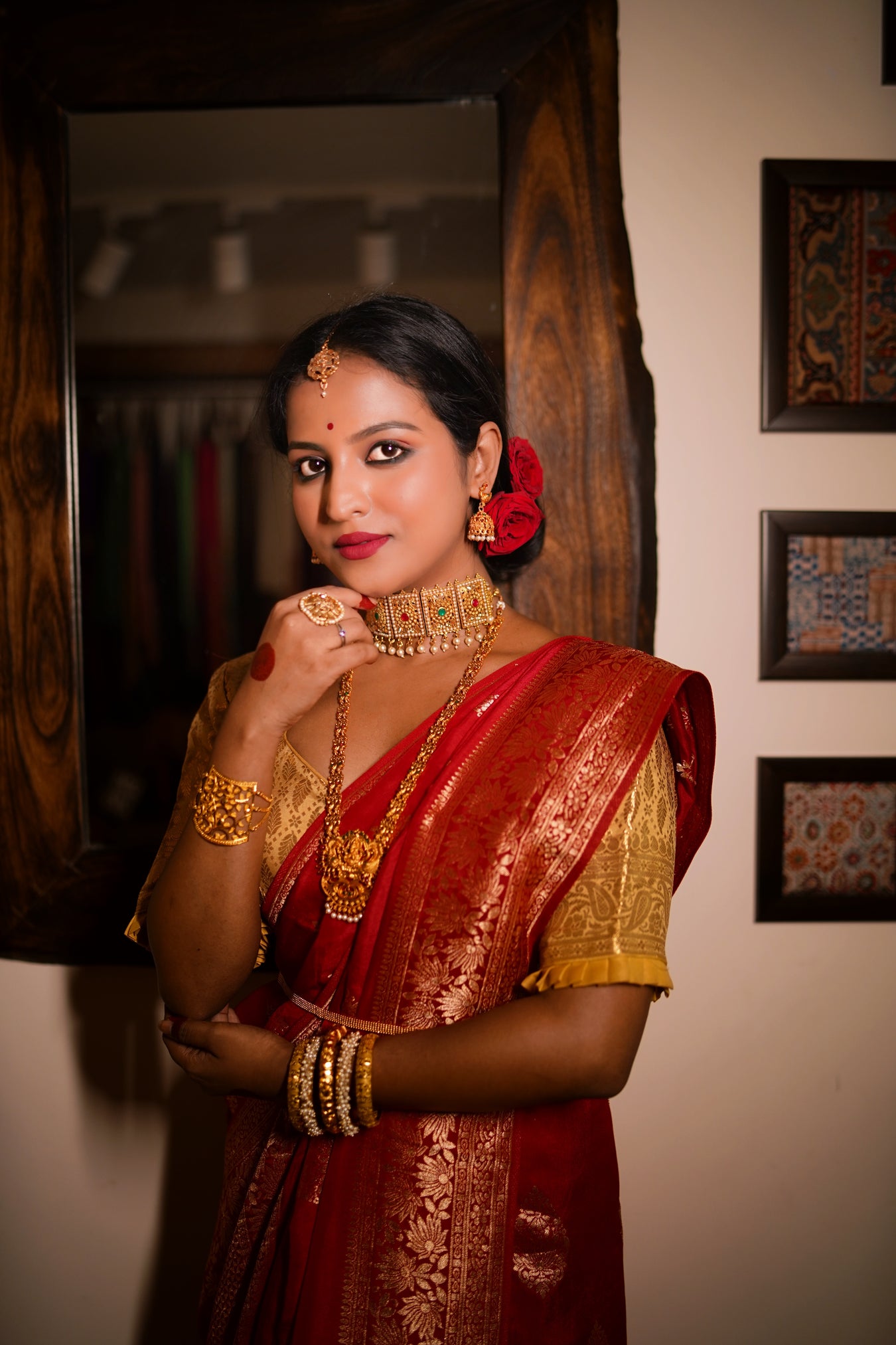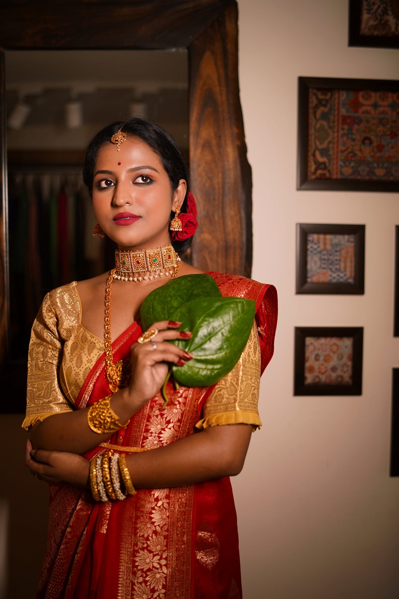 Color: Red & Golden zariFabric: KHADDI BENARASI Pattern and print: This Red Khaddi Benarasi saree is a gorgeous piece for any special occasion. The exquisite zari work all over the body enhances the beauty of the floral patterns making it look traditional and classy. Embrace your femininity and exude elegance with must have in your wardrobe.Care instructions: Dry wash