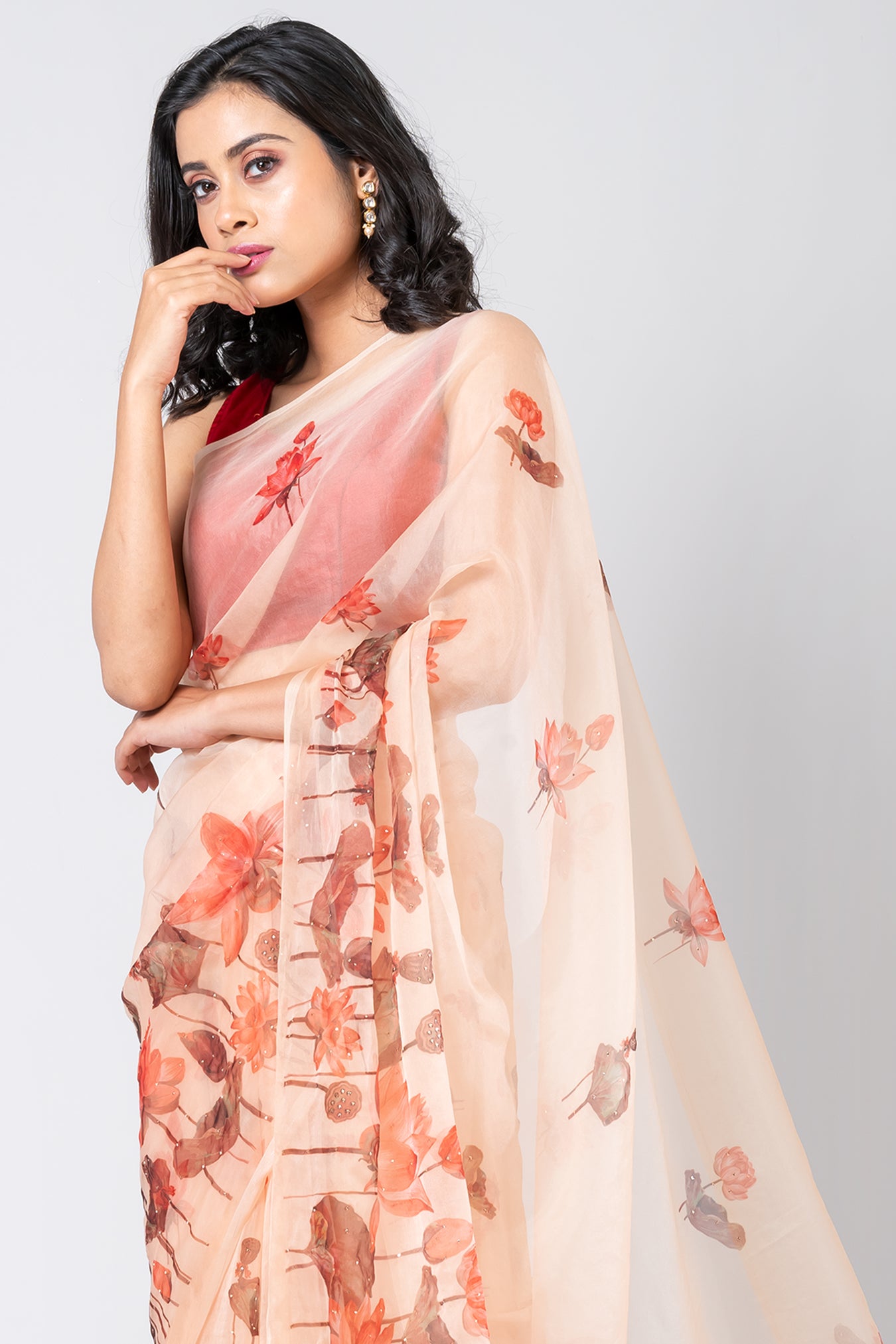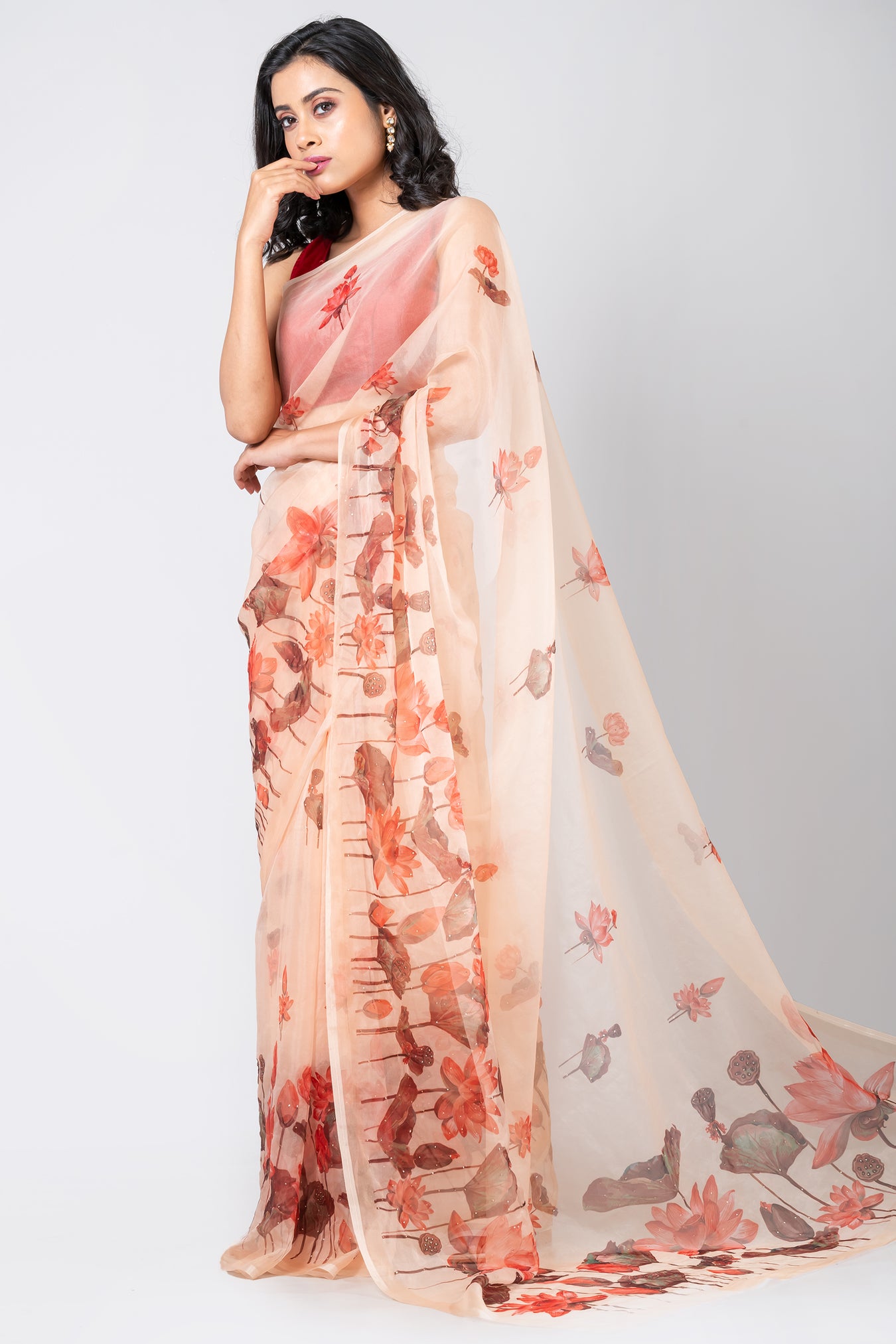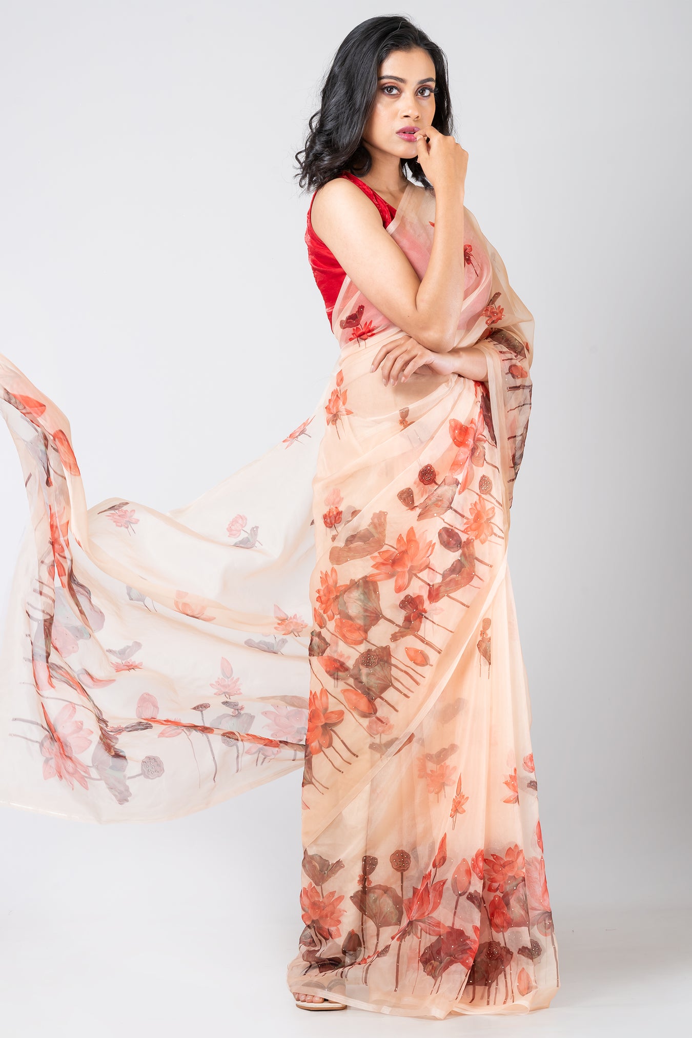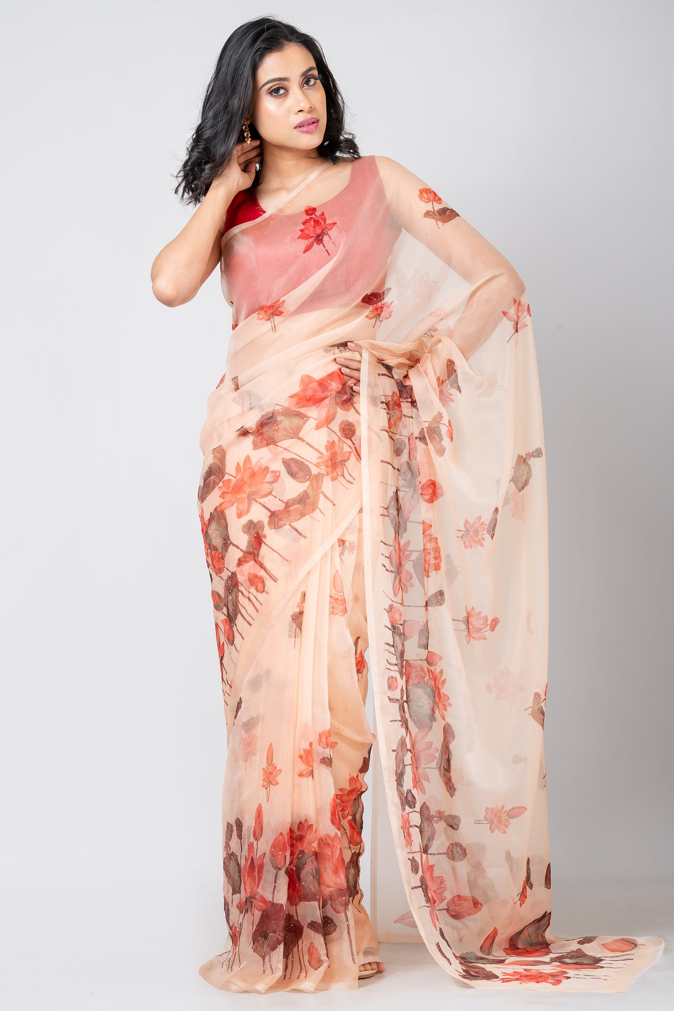Size: S: 5.50Mtr B: 0.80MtrColour: PEACHFabric: ORGANZAPattern and print: The light orange organza saree exudes grace with its delicate and lightweight fabric, ensuring an elegant drape. Its vibrant hue is accentuated by the orange Lotus flower design and intricate muqaish works, elevating it to a stunning choice for any special occasion.Pack contains: 1 Saree, 1 BlouseCare instructions: Dry wash