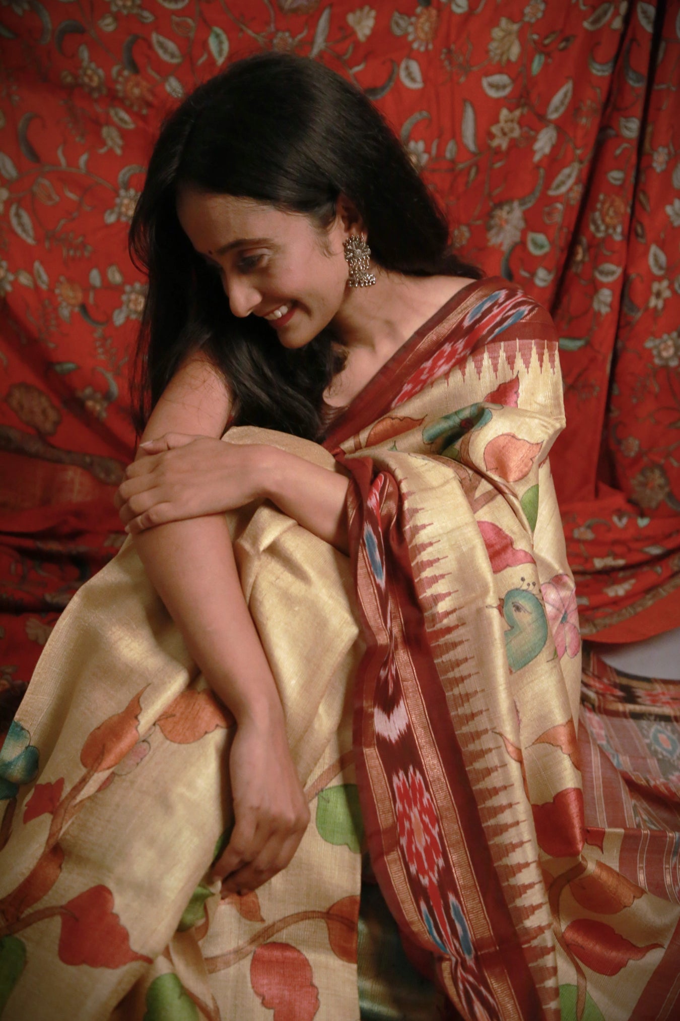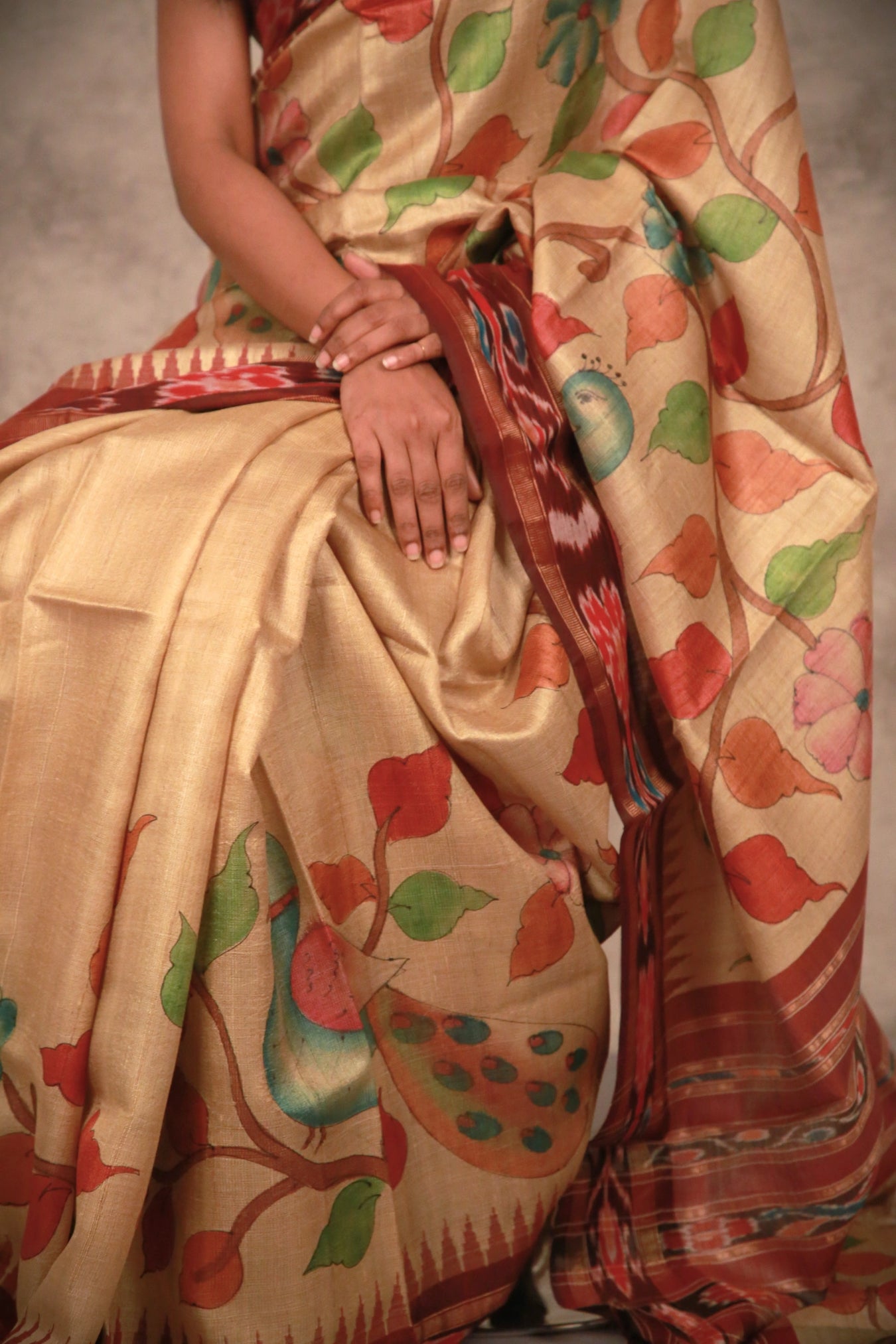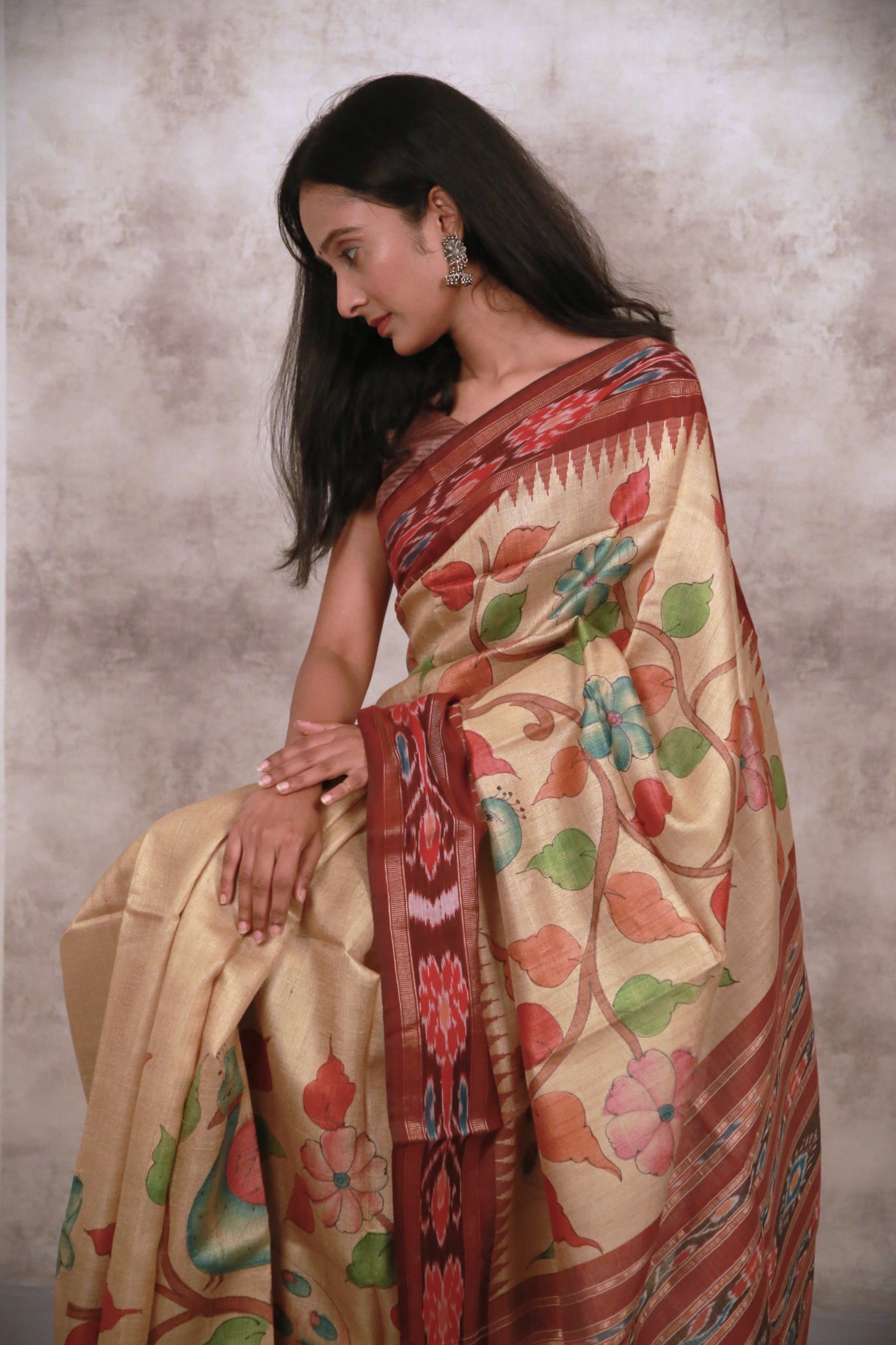 Made from pure Tussar silk, it showcases hand-painted floral designs, including a graceful peacock motif. With its luxurious feel and stunning drape, this saree embodies Indian craftsmanship and sophistication.