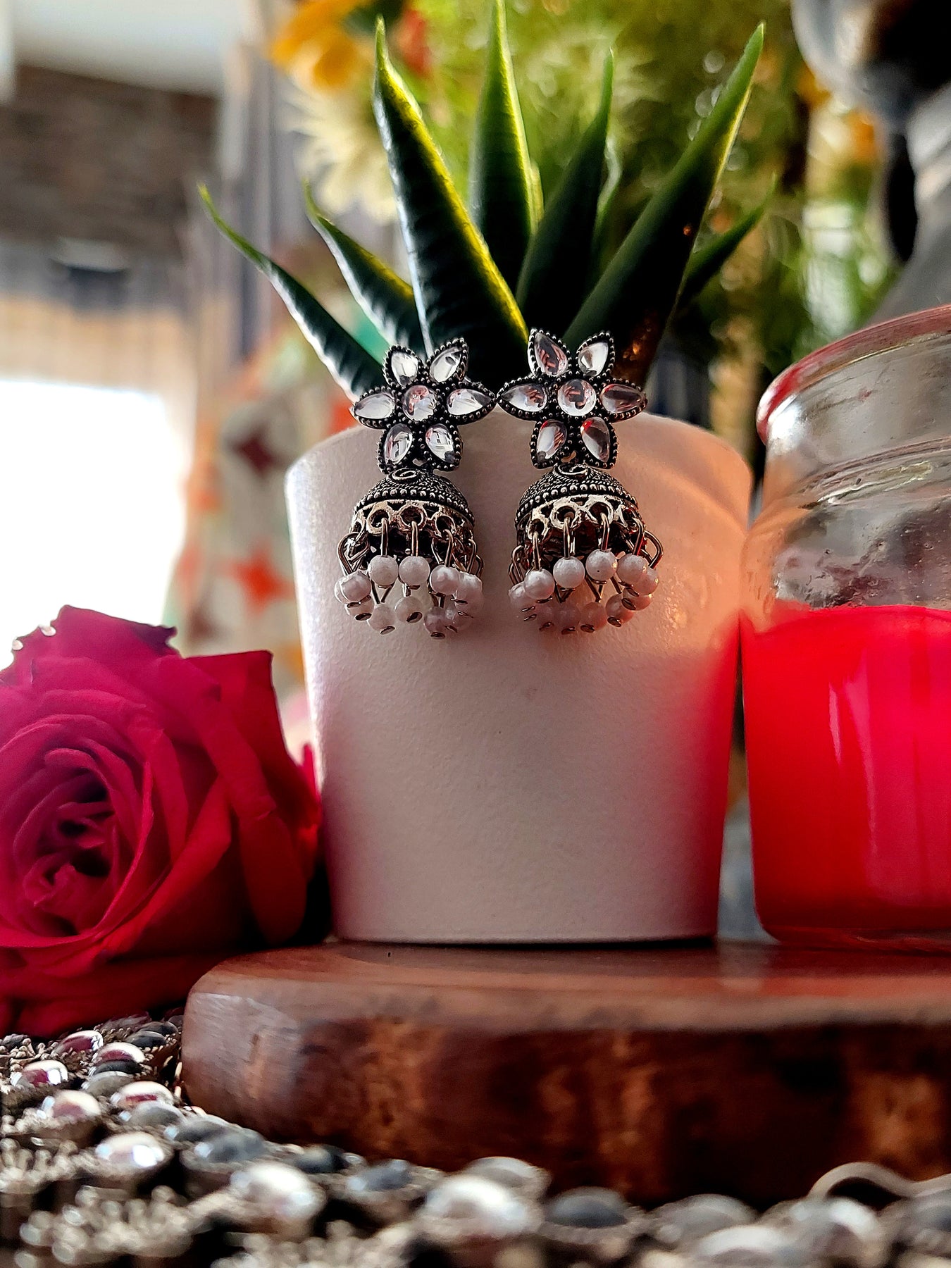 Set of white colored stone, silver, antique finish paired with a round neck-piece and a drop jhumka earring. The neck-piece is adorned with intricate designs, with a classic design running along your delicate neck. Make a statement with this piece paired with a garment.