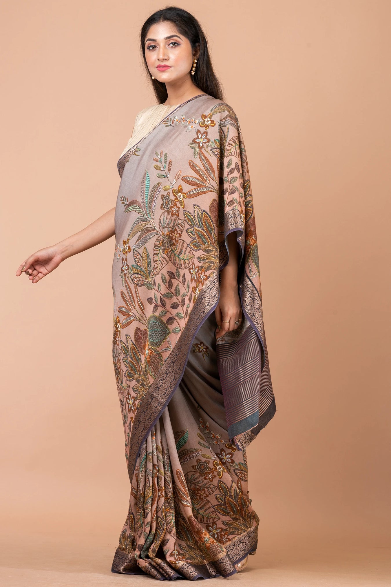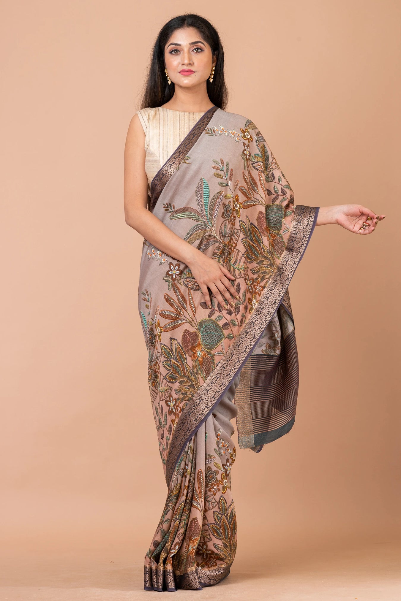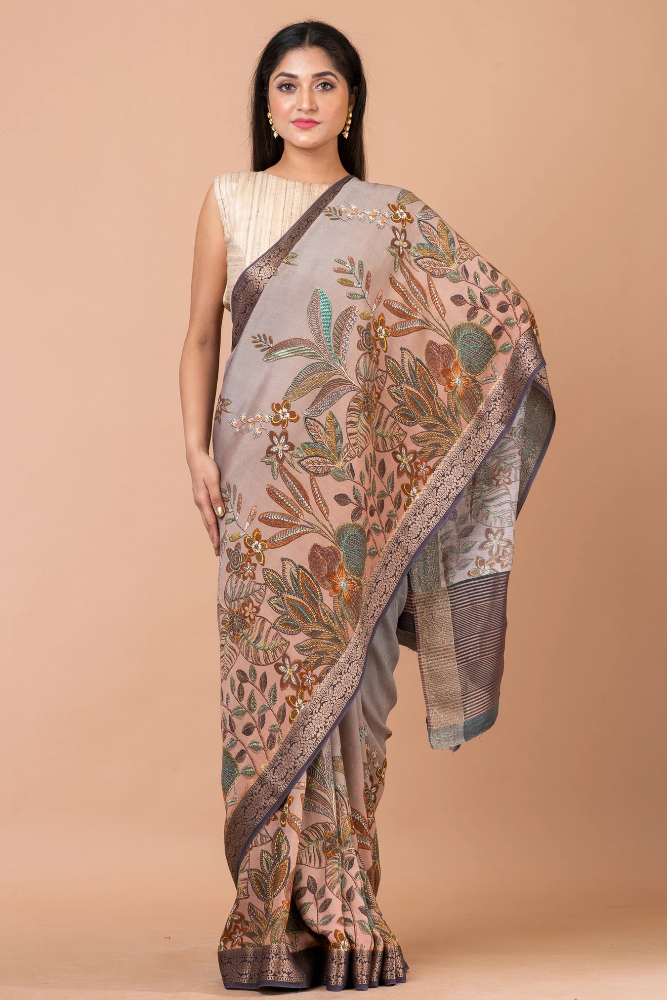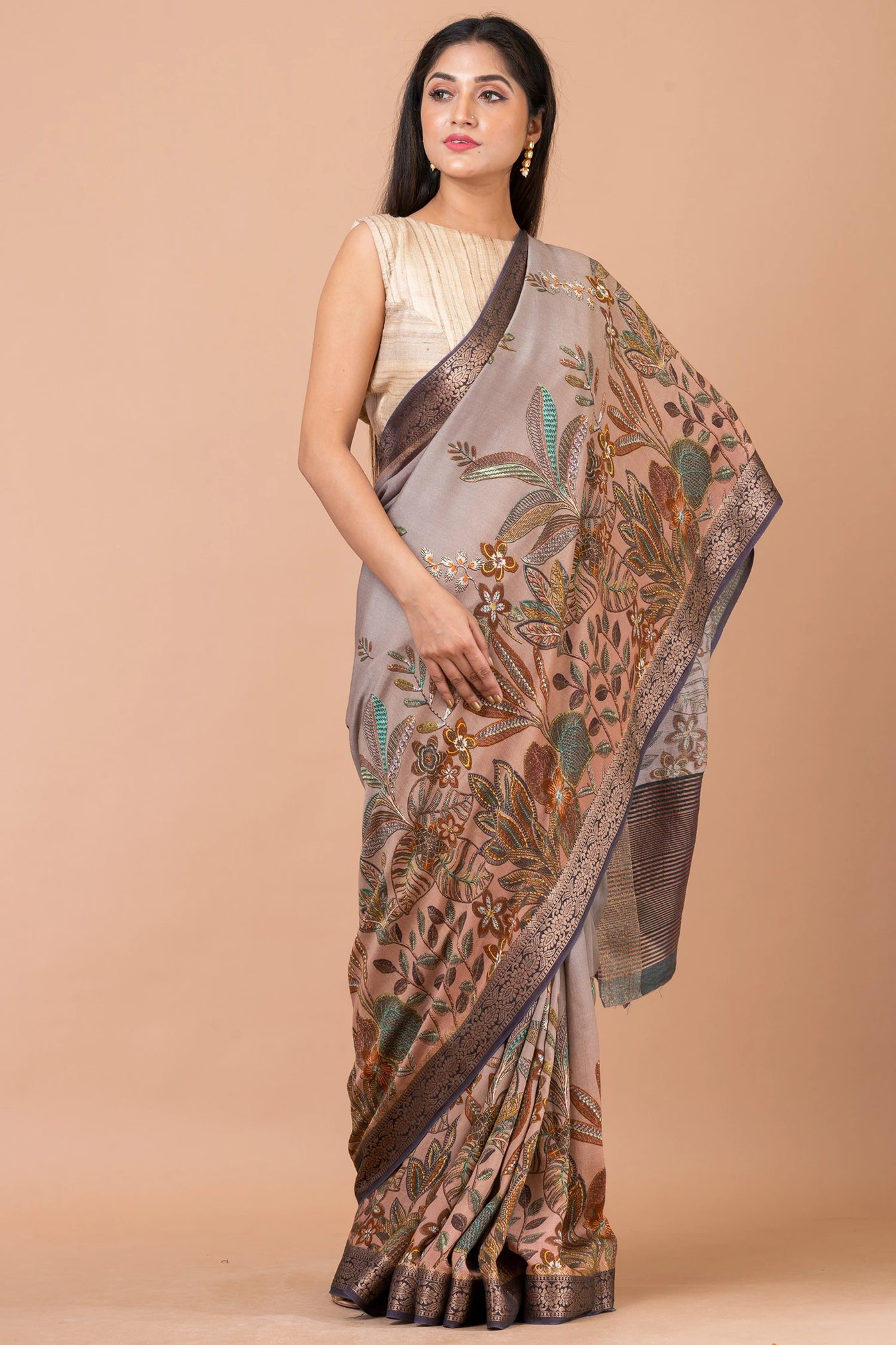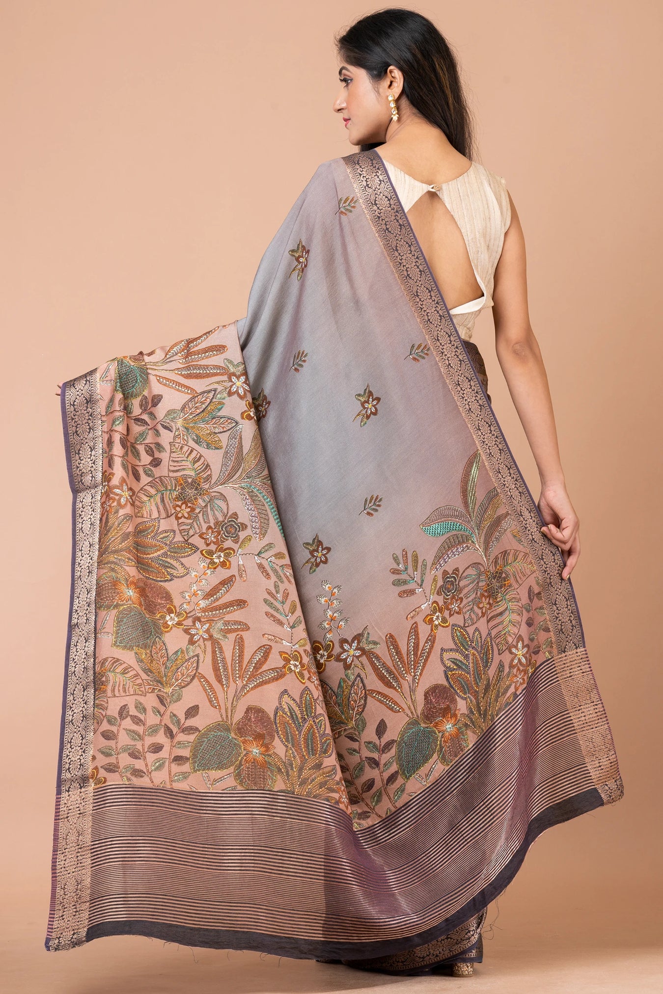 Size: 5.50Mtr B: 0.80MtrColour: Grey ombre and VioletFabric: Chanderi Zari Woven SareePattern and print: Celebrate the untamed beauty of our saree featuring a big wild flower bunch, where nature's exuberance blooms freely, creating a captivating and enchanting ensemble that embraces the charm and grace of wild flora.Pack contains:Â 1 Saree, 1 BlouseCare instructions:Â Dry wash