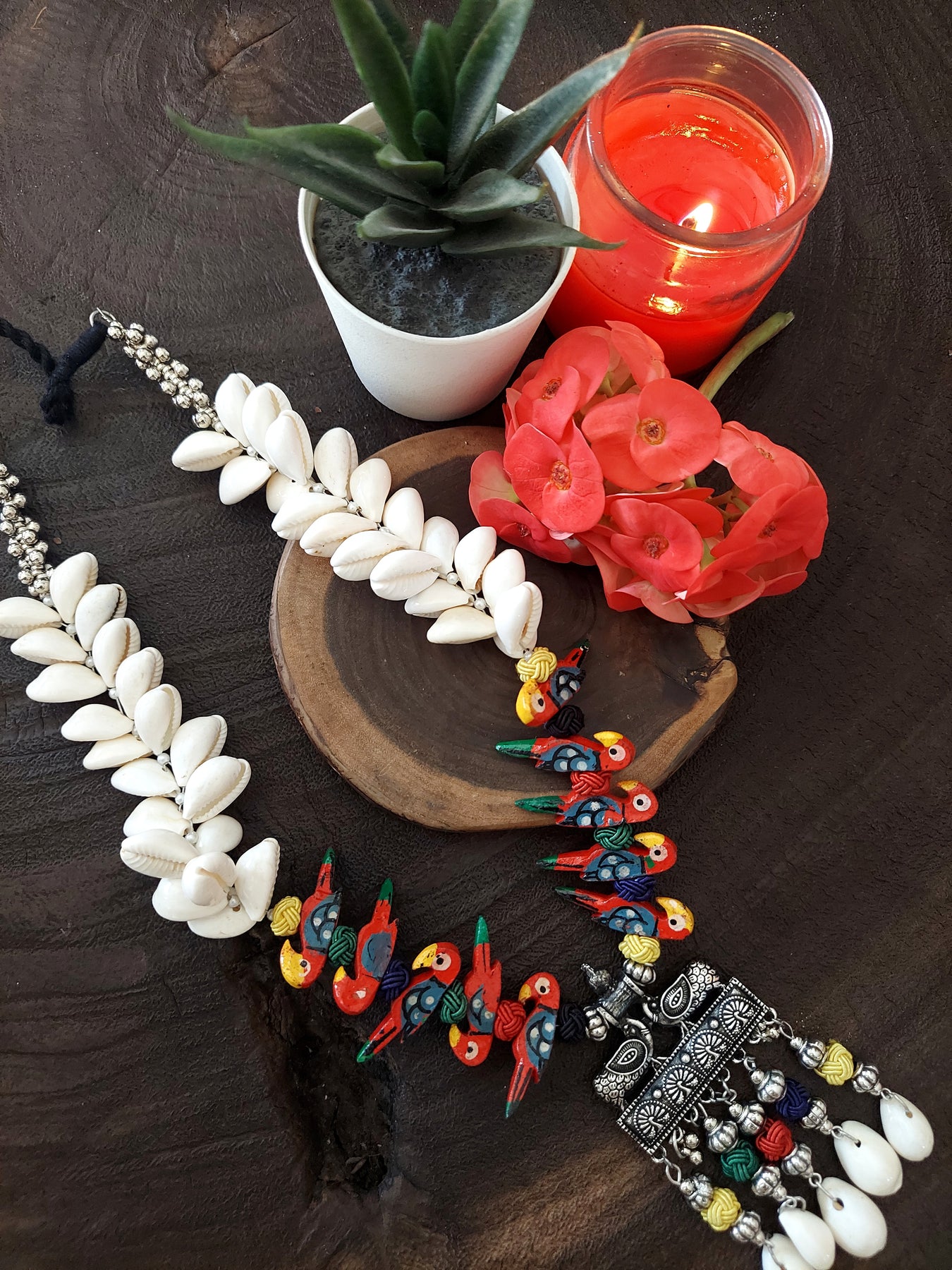 The neck-piece is embellished with an antique finish pendant, lovely white Cori shells, and wooden cut designs. Because it is simple and light to wear, it is contemporary and unique. Wear it with any traditional or fusion attire to complete your look.