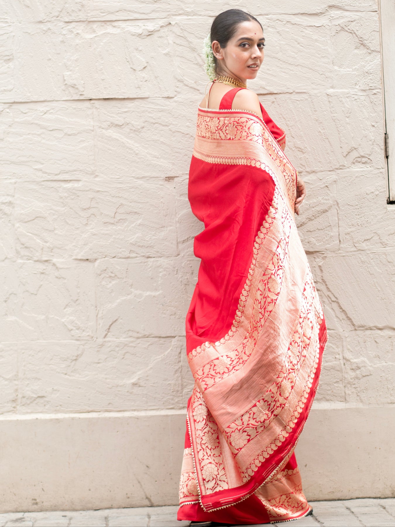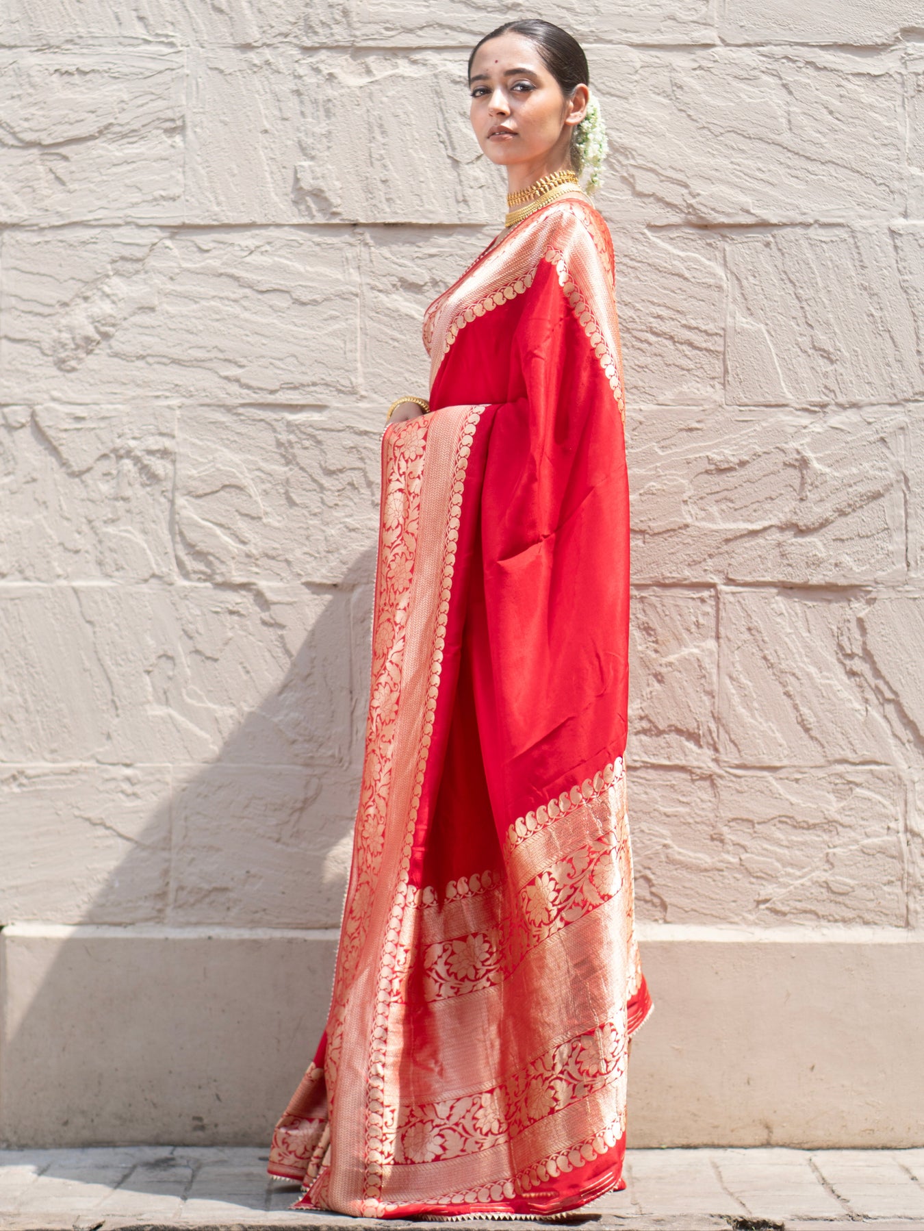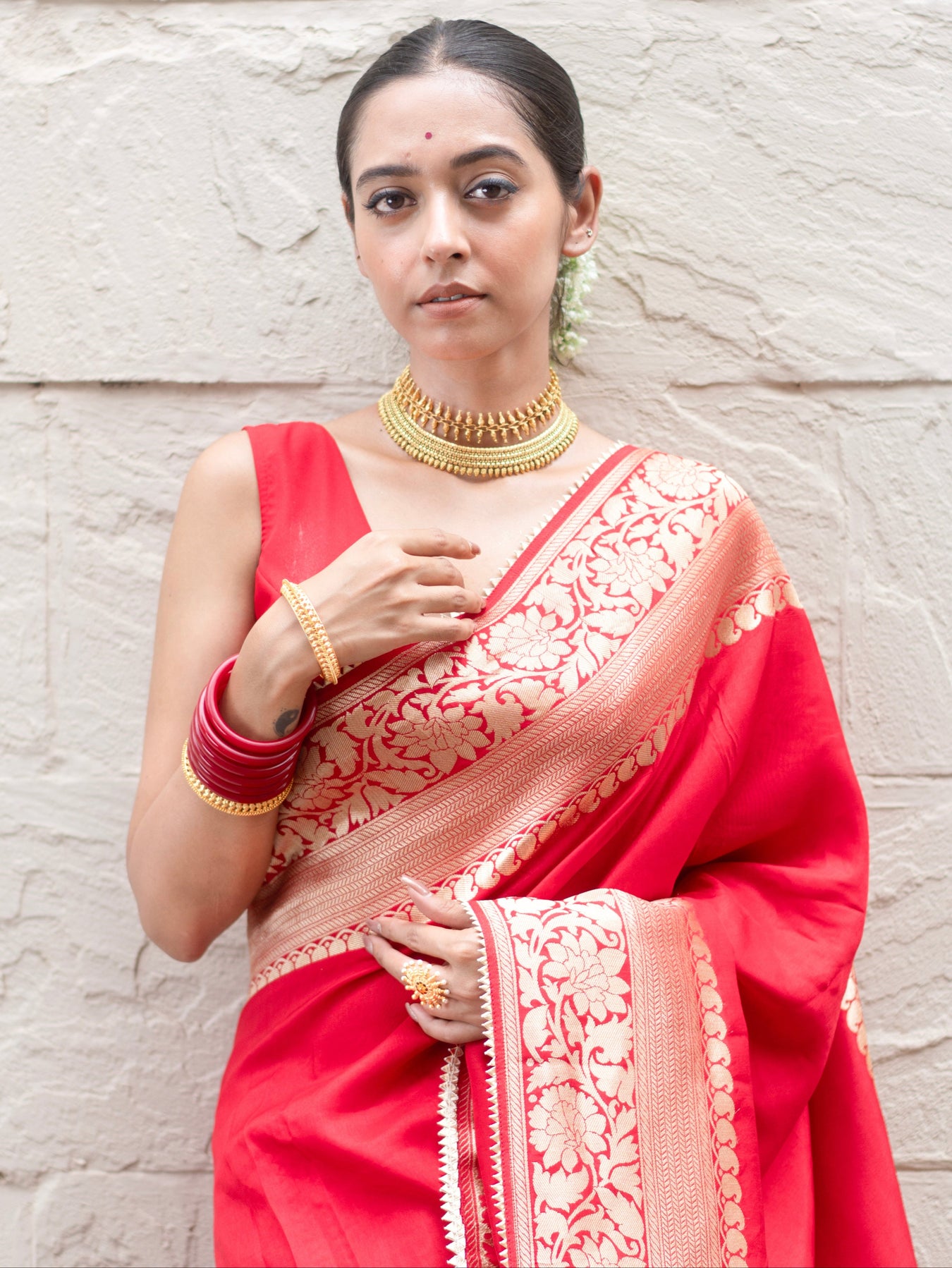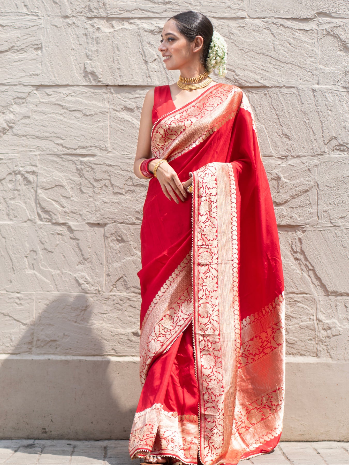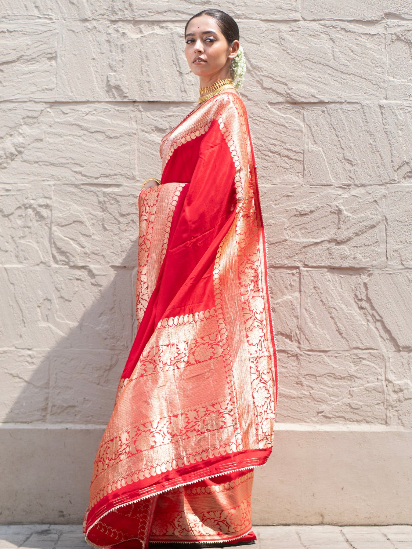 A timeless crimson Banarasi saree adorned with intricate gold zari work, exuding regal elegance and traditional charm.