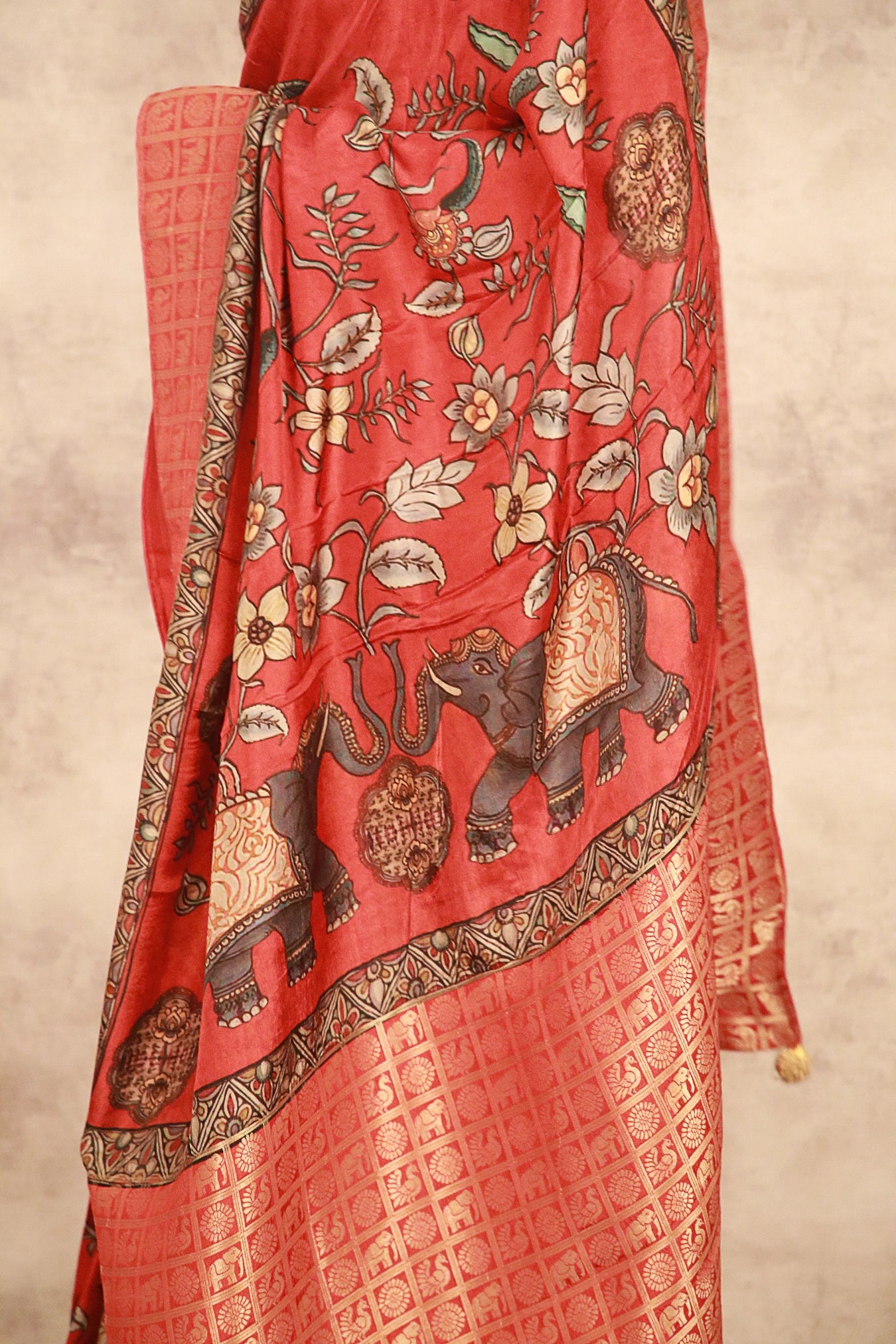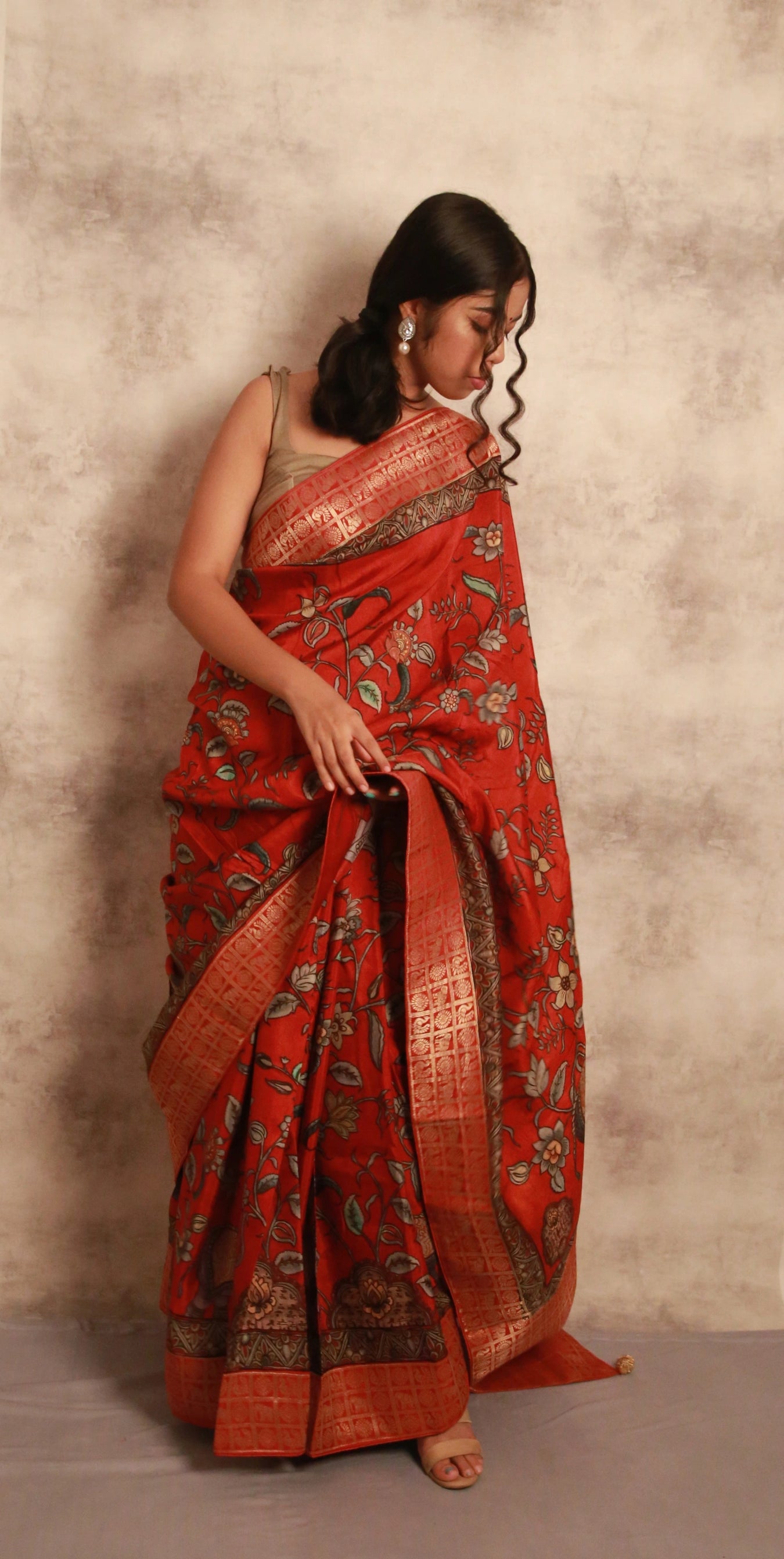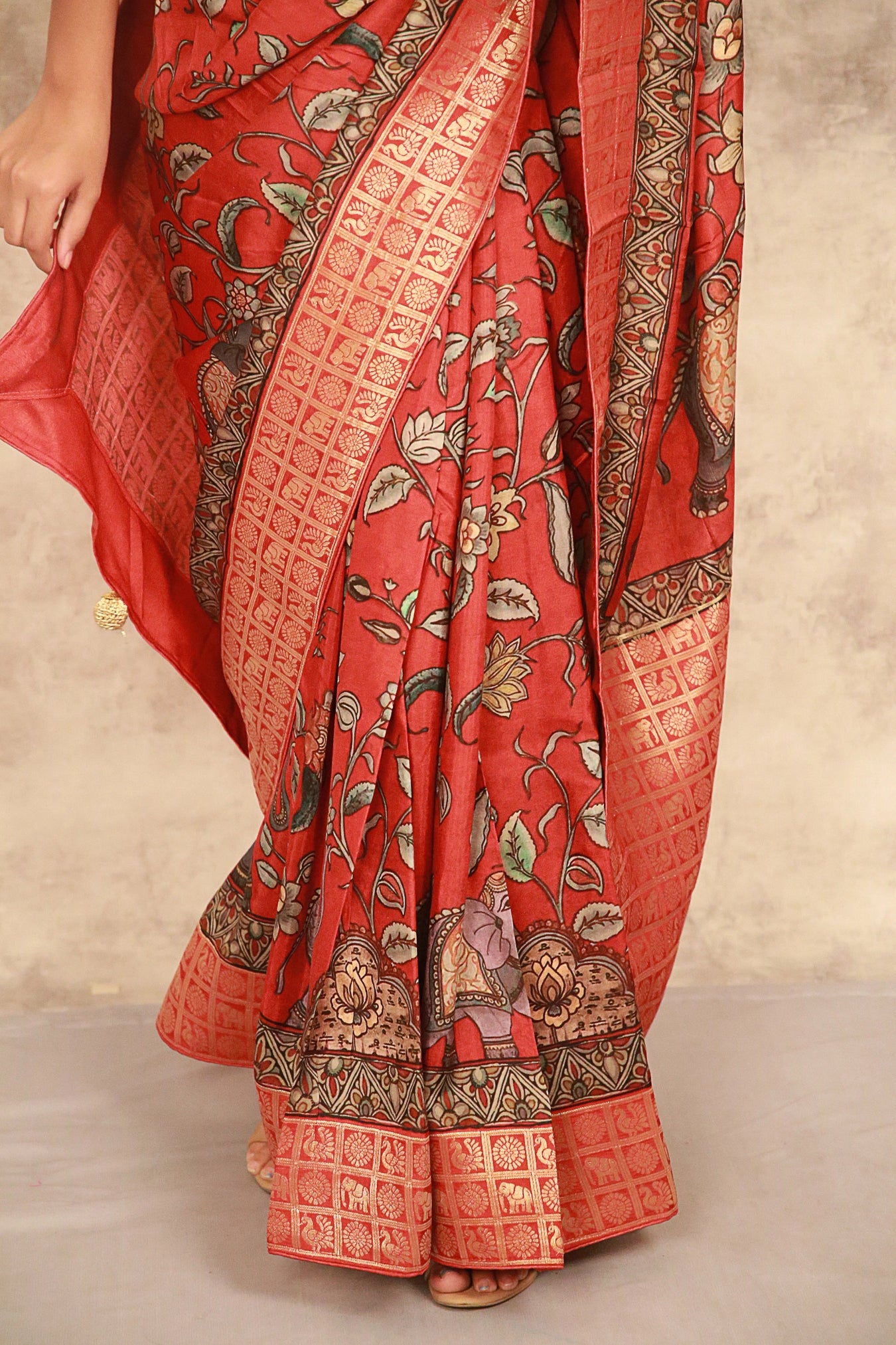 Discover the Cultural Delight saree! With a vibrant red hue and a Khaddi woven zari border, it showcases the beauty of traditional Kalamkari floral print. Elevate your style with this timeless piece.