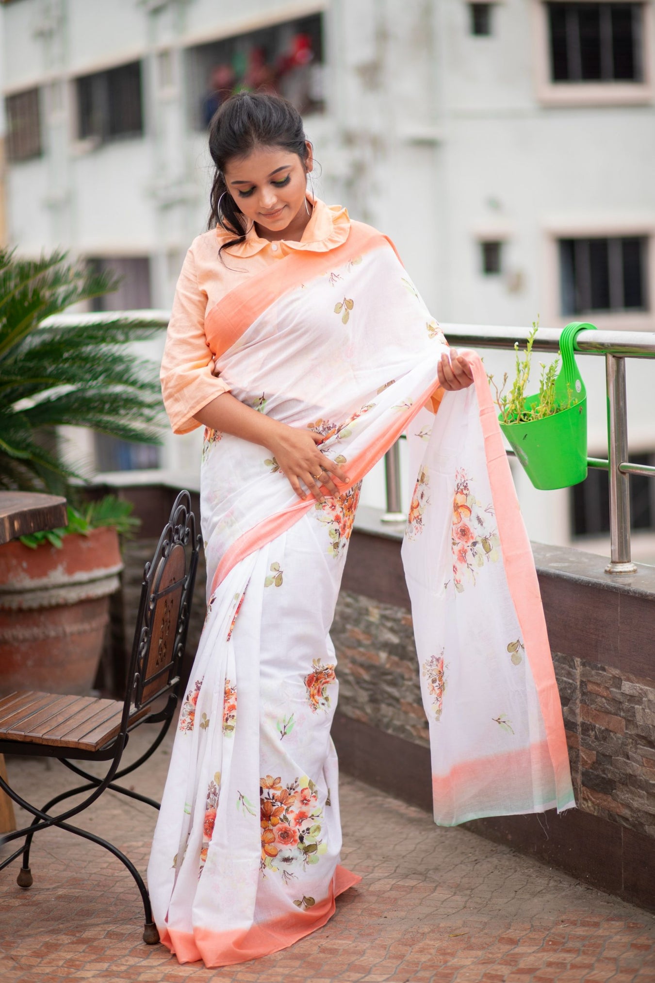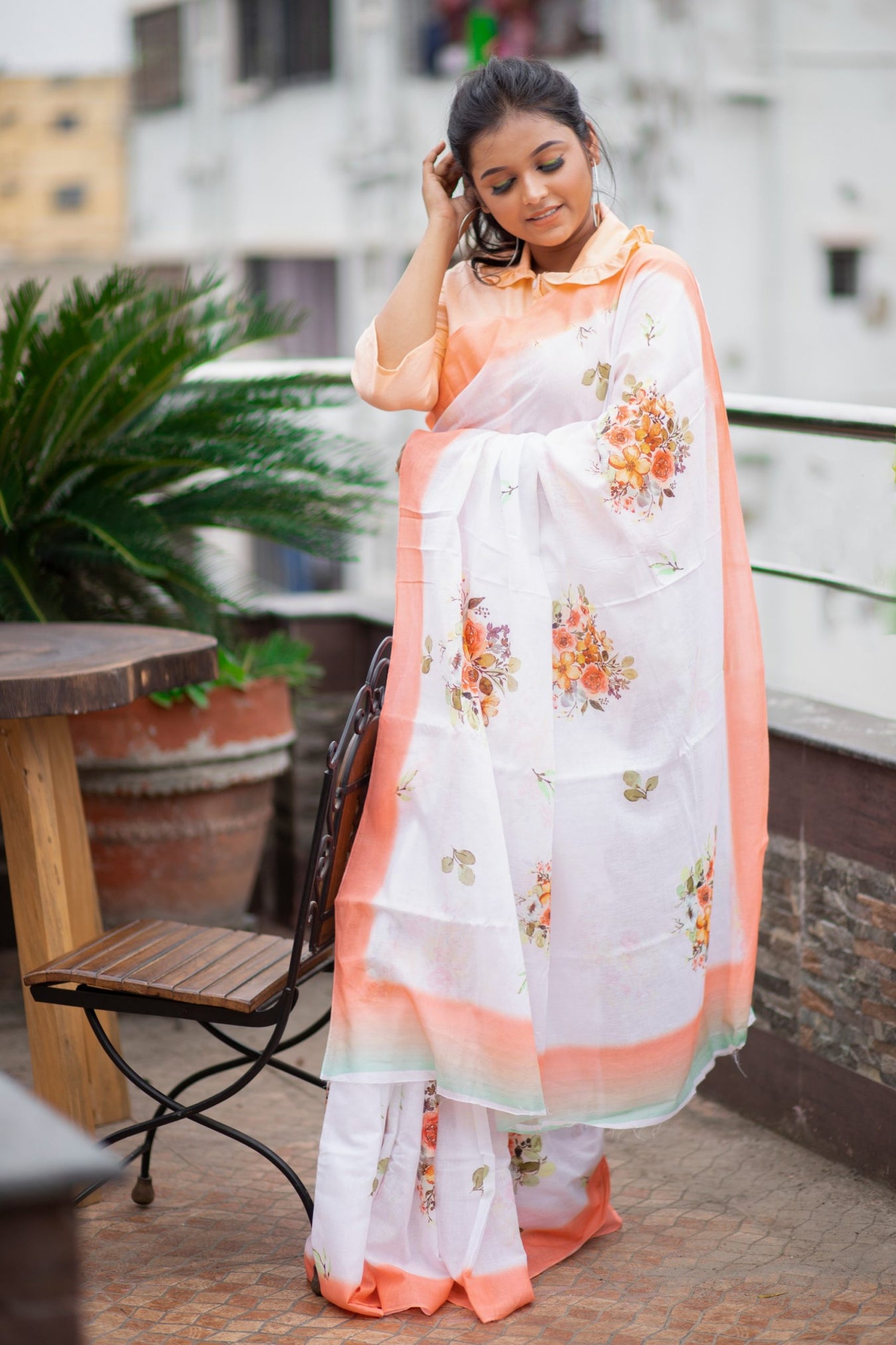Colour: whiteFabric: MulmulPattern and print: Peach Floral designs printed on natural mulmul saree with an ivory base. The classic attire is one unique piece making it stand out among others. The saree brings out the softness from within and natural beauty, making it a statement look.