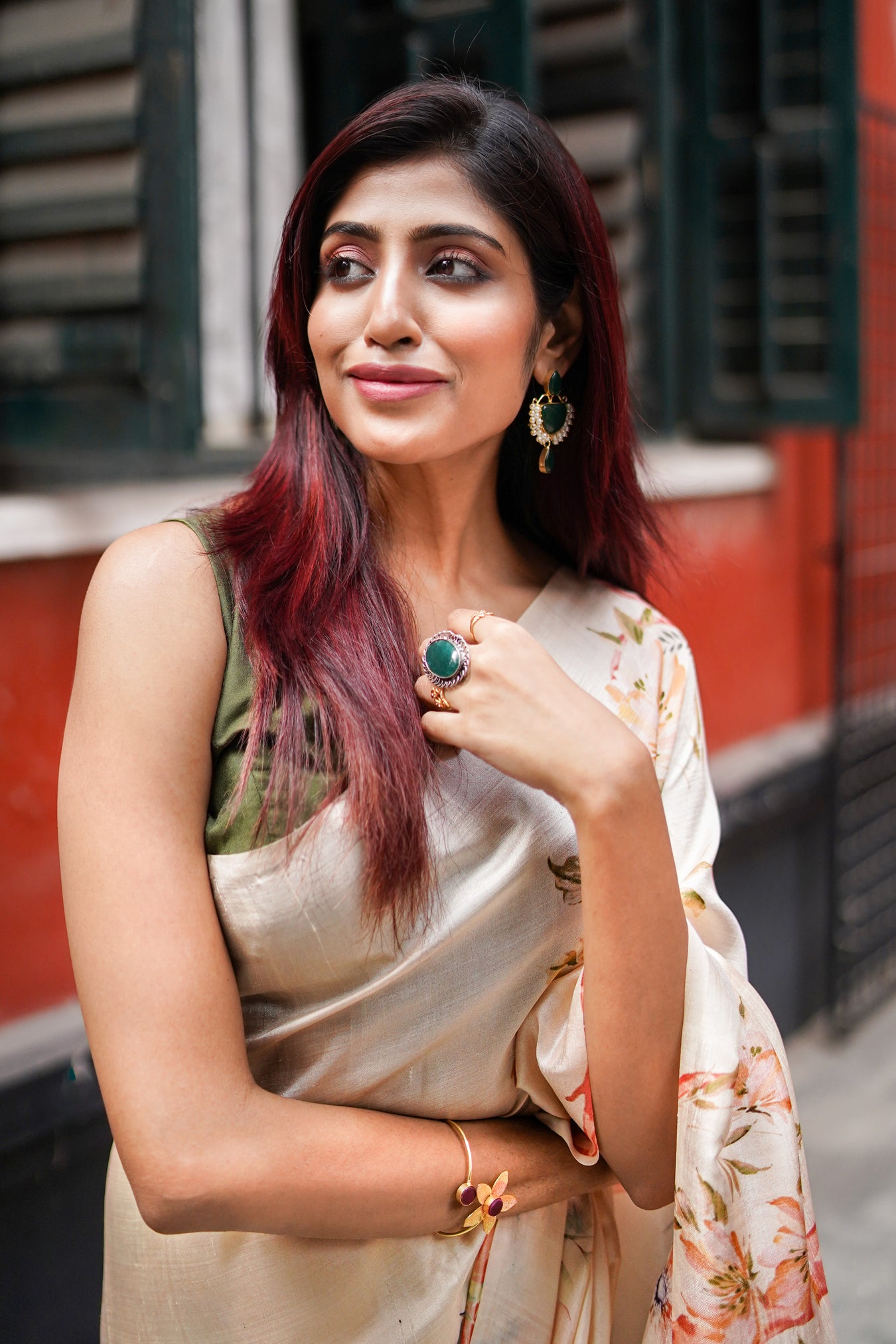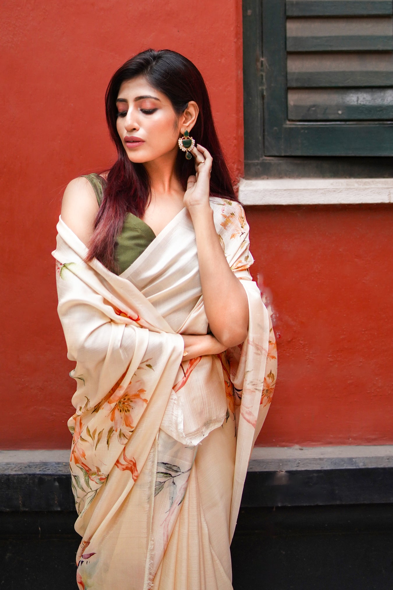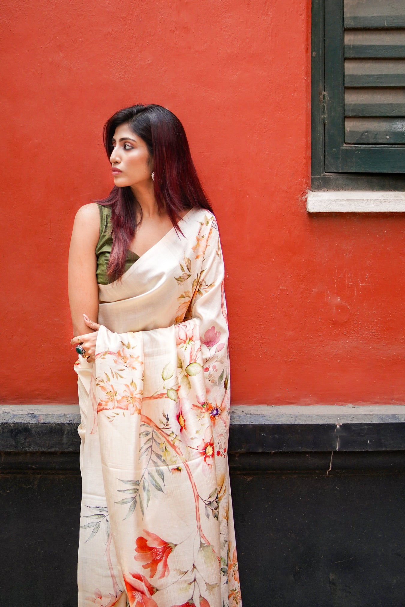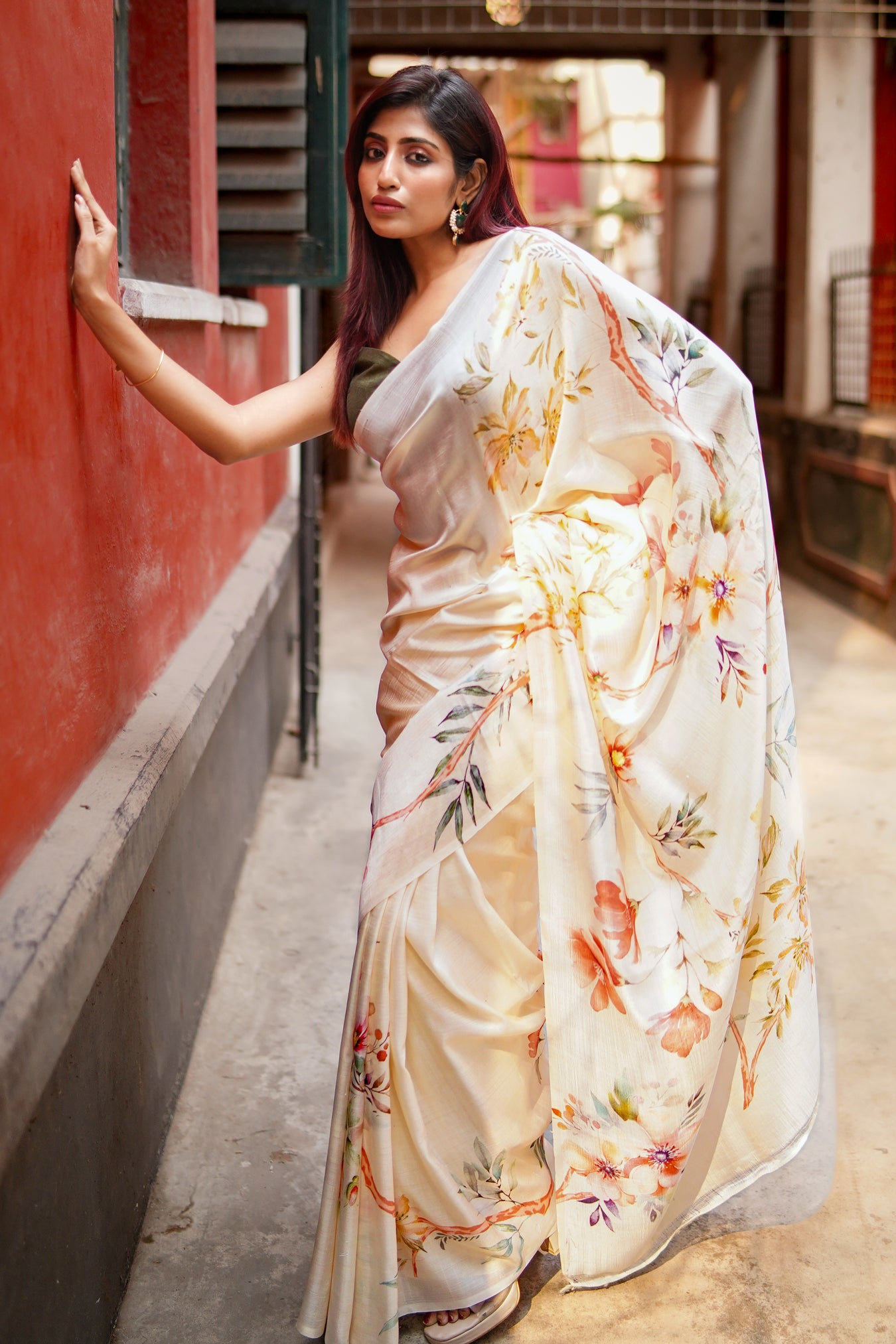 Size: 5.50Mtr B: 0.80MtrColor: WhiteFabric: Mulberry SilkPattern and print: Pure Mulberry silk in natural white shade with floral digital prints making the saree exquisite & beautiful. Purity: Natural fabricCare instructions: Dry wash