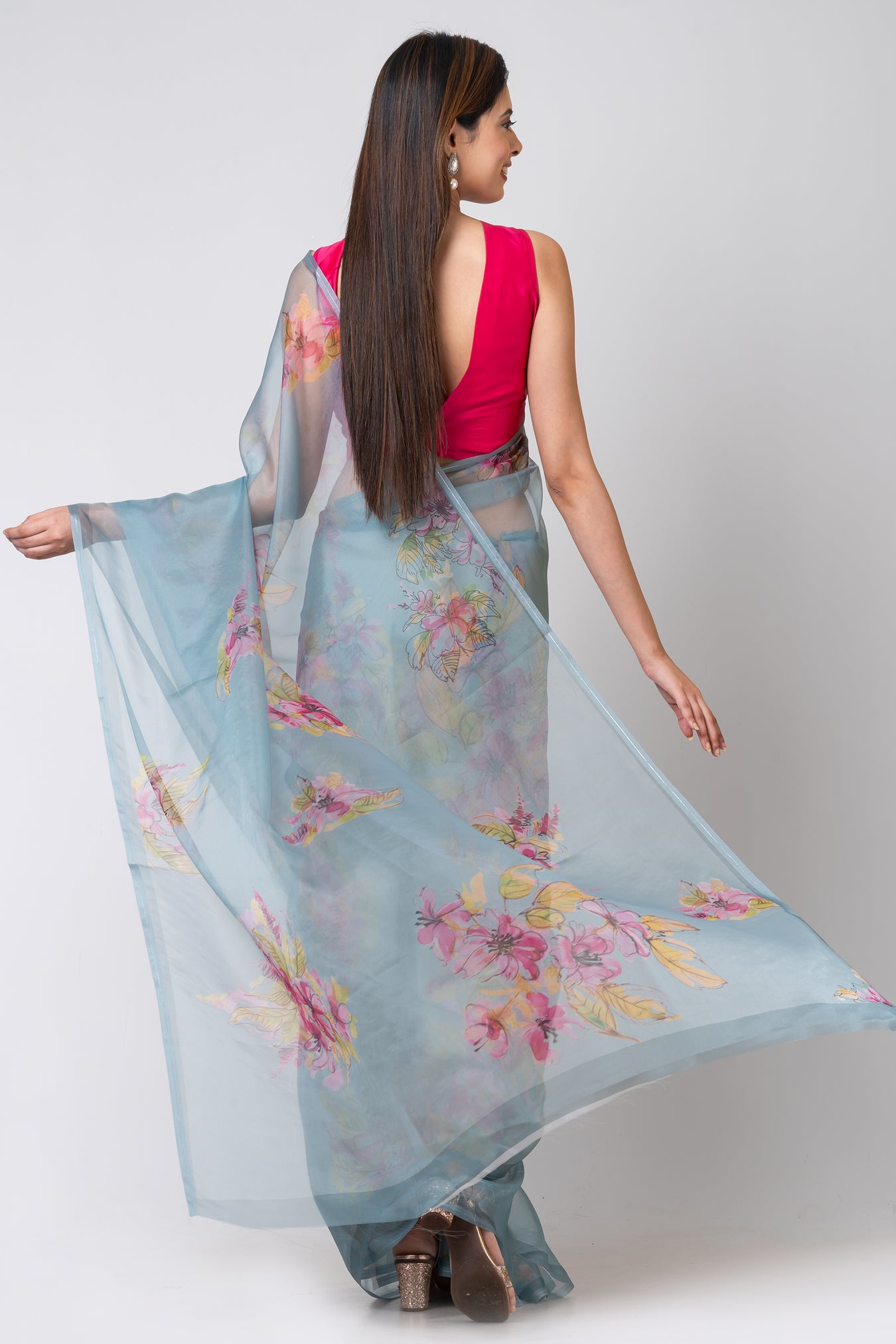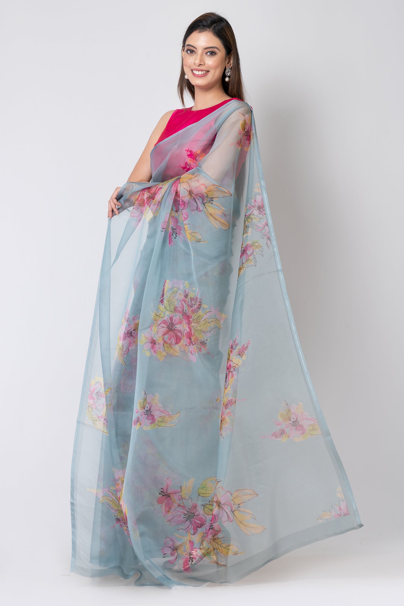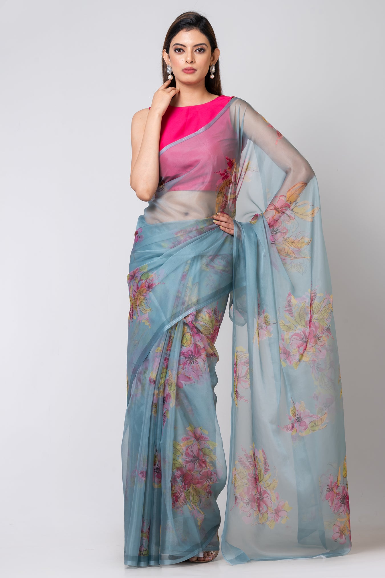 Size:Â 5.50Mtr B: 0.80MtrColour: Sea GreenFabric: OrganzaAttribute:Â Handwork bead scallopingPattern and print: The sea green organza saree is made of a delicate, lightweight fabric that drapes elegantly. Its calming color is enhanced by a lively Colourful water colour flower design.