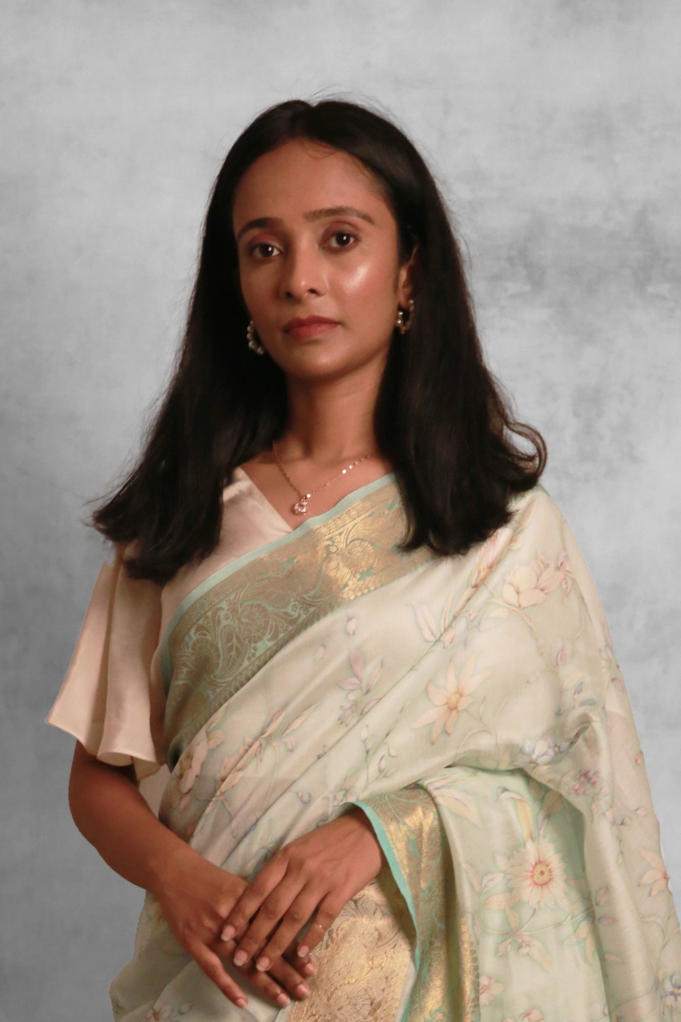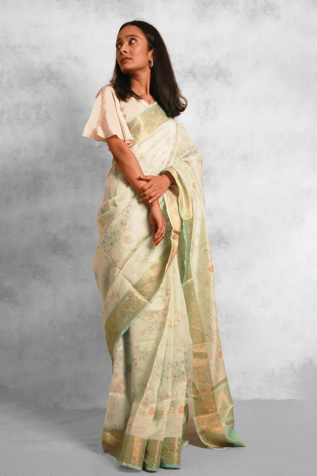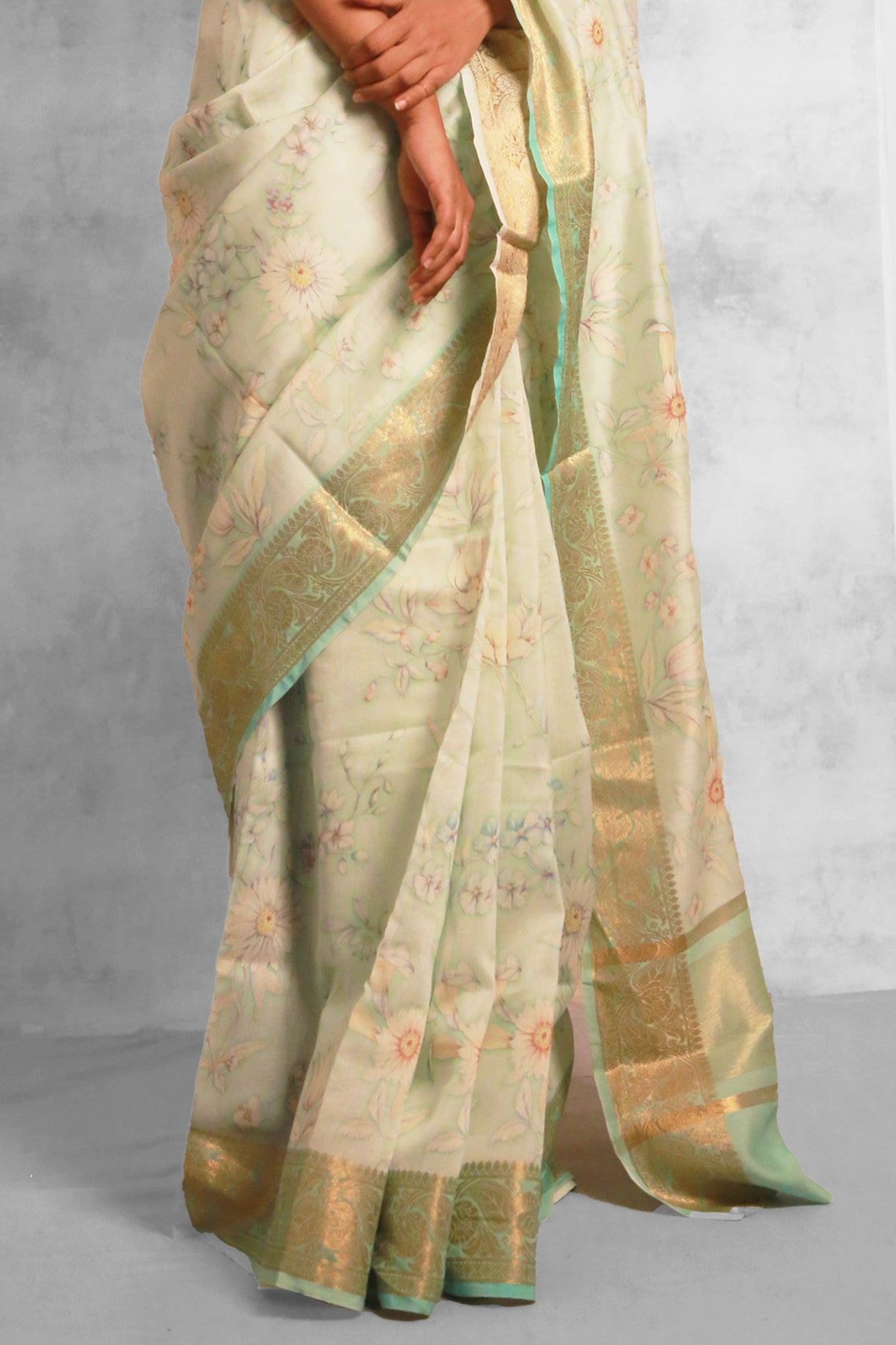 Fabric: Chanderi Zari Woven sareeColor: Pale sky with aqua blue borderPattern and Print: Drape yourself in the sheer elegance of this Pale sky -colored Chanderi saree, a quintessential embodiment of grace. Adorned with a aqua blue zari border, it exudes sophistication and timeless appeal. The allover saree boasts delicate watercolor flower designs, adding a touch of ethereal beauty to this classic ensemble. Perfect for any occasion.Silk Purity: Pure ChanderiPack Contains: 1 Saree, 1 BlouseCare Instructions: Dry wash                  Â