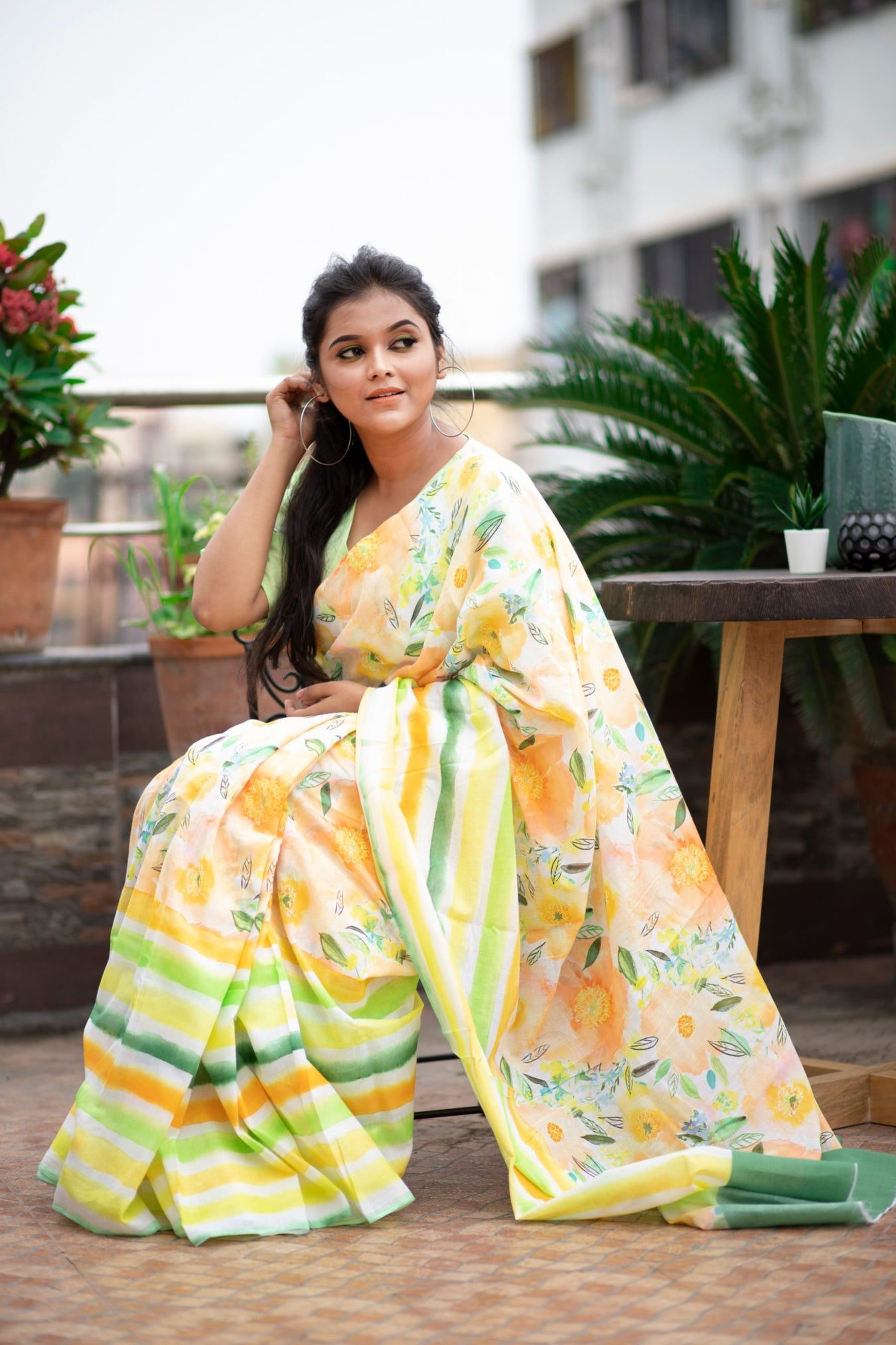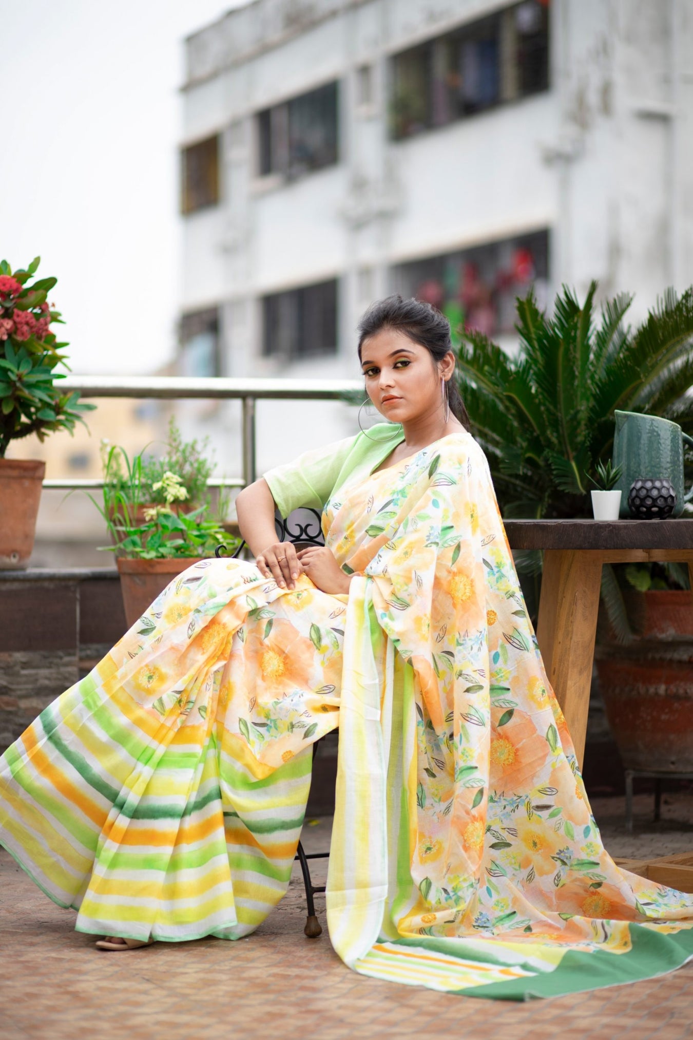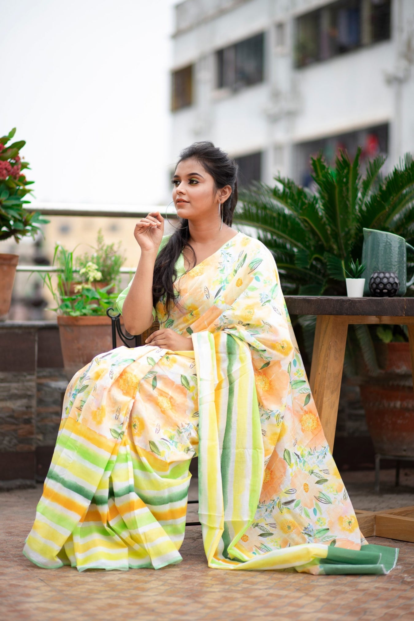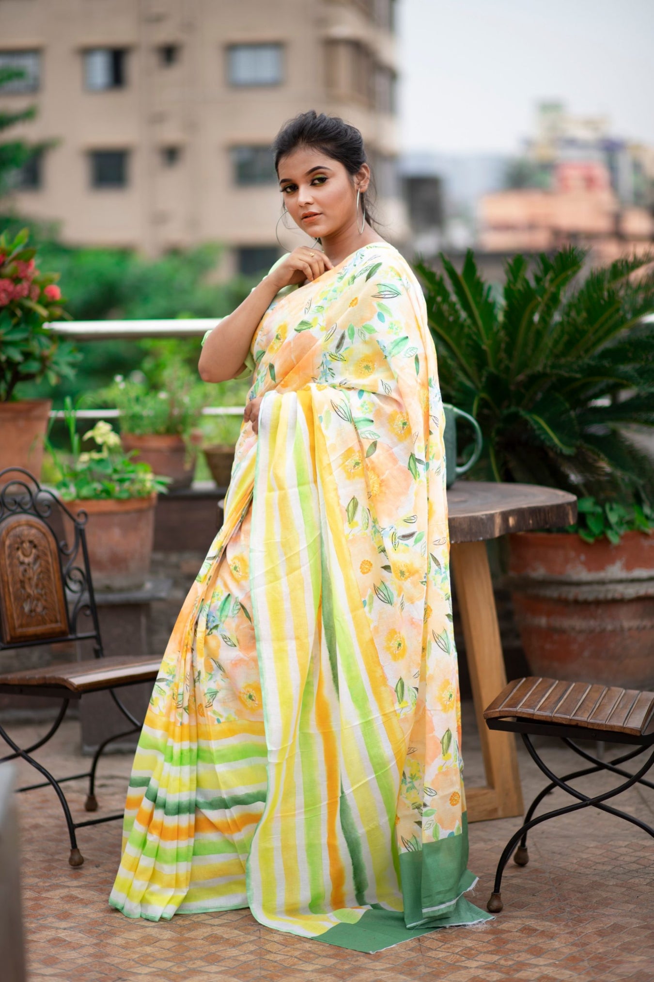 Colour:Â whiteFabric: MulmulPattern and print: Water color stripes on border and floral prints all over in the body done on natural mulmul Saree drapes smoothly on the body and gives a soft and smooth feel. The soothing, natural shades of the saree, makes it blend with nature and uphold natural beauty and class. the colorful striped borders make a frame to the floral print on the body.Care instructions:Â Dry wash