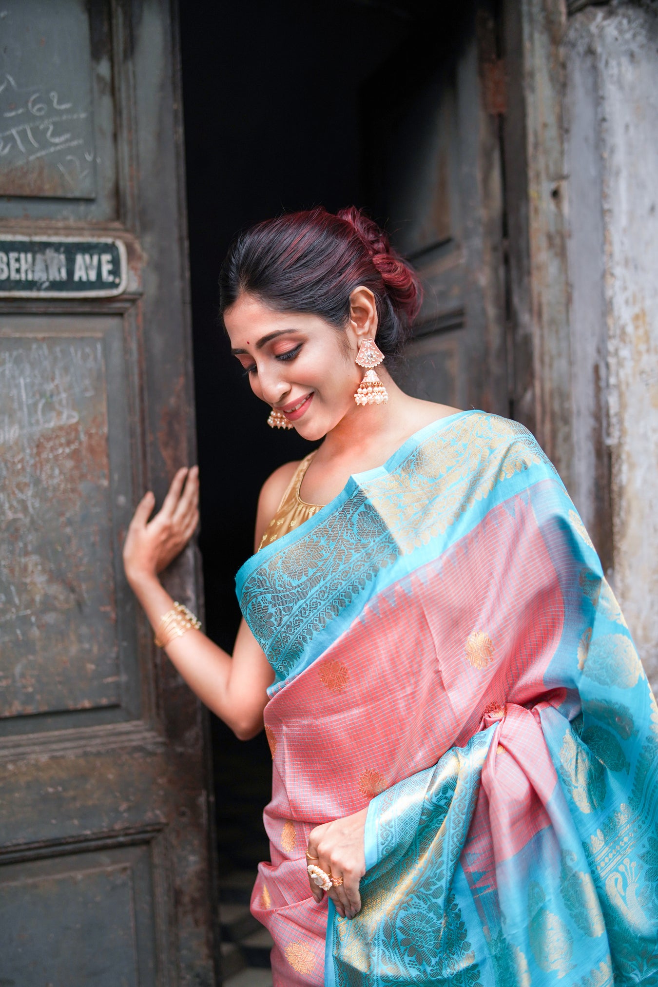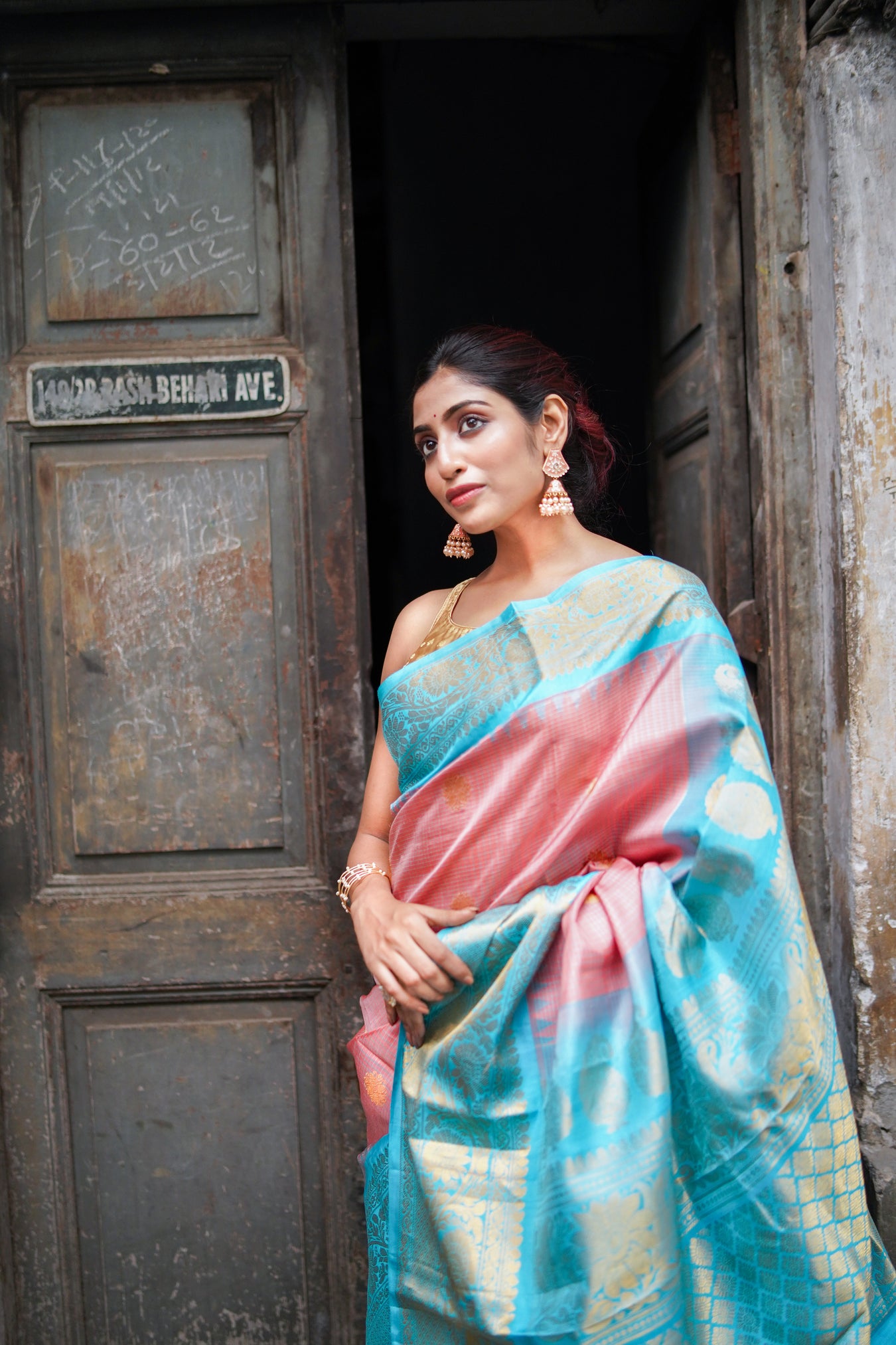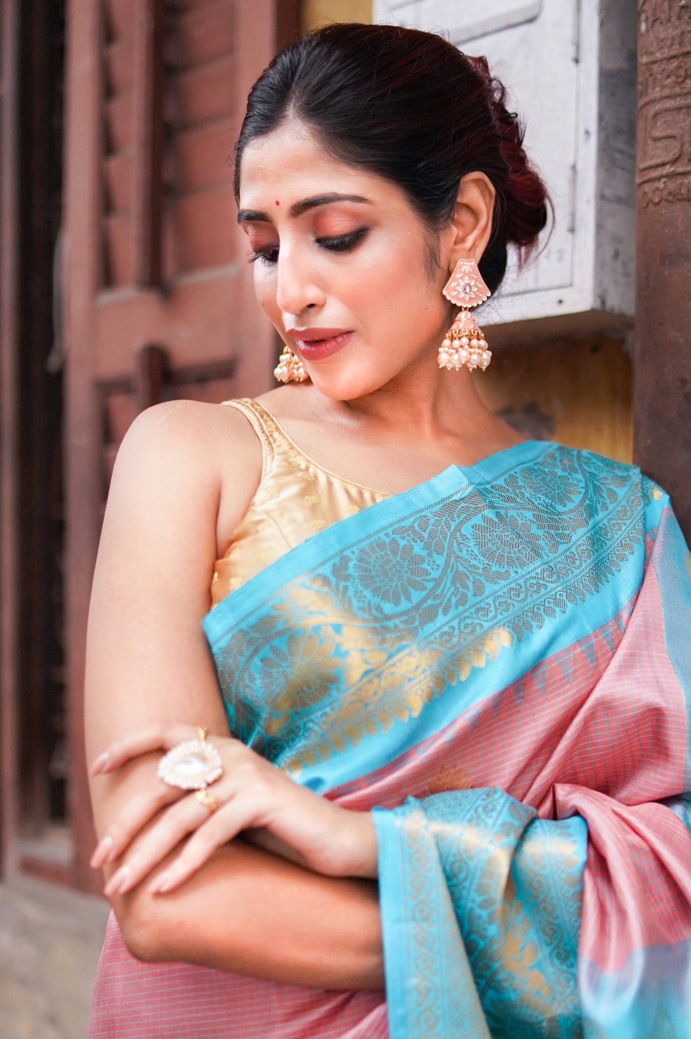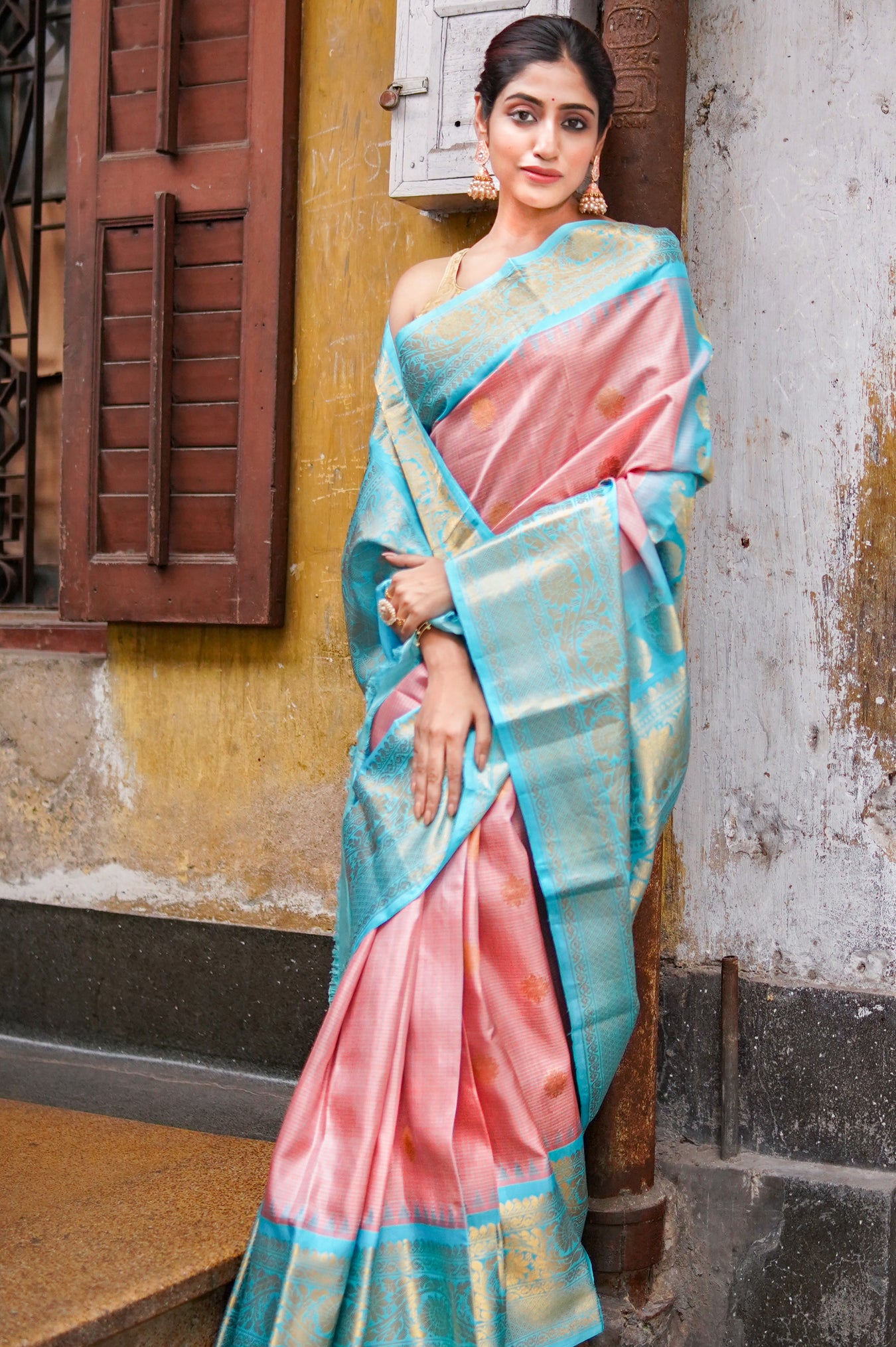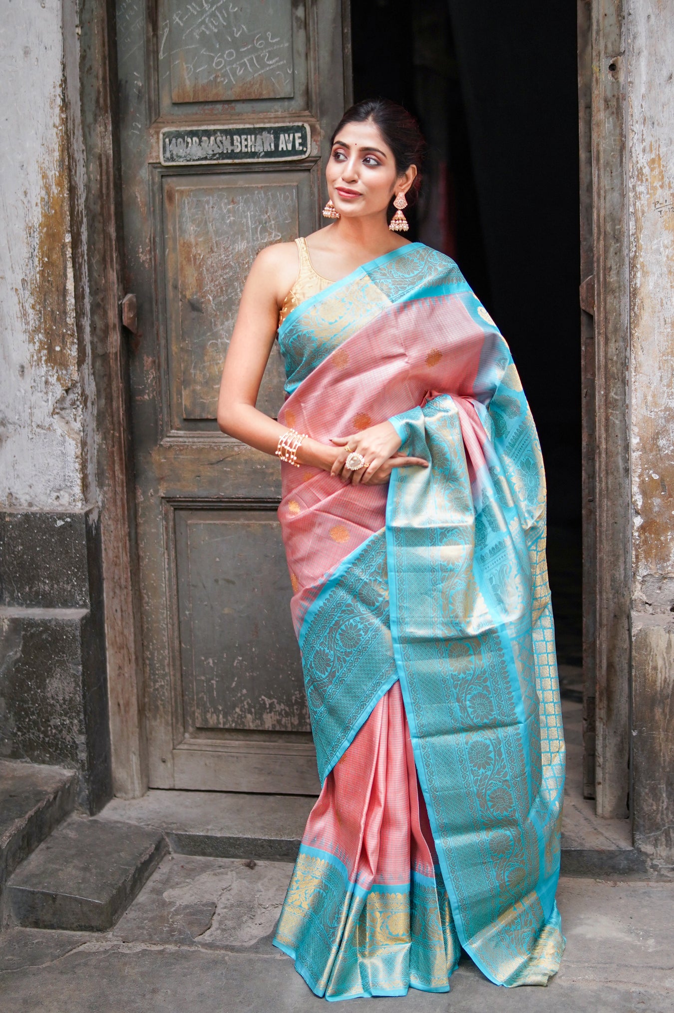 Size: 5.50Mtr B: 0.80MtrColor: Pastel Pink with contrast aqua blue border & zari workFabric: Silk GadwalPattern: Tradition Woven in GoldHandwoven in the historic town of Gadwal, these sarees are celebrated for their rich heritage, intricate zari work, and signature thick borders. Despite their opulent look, Gadwal sarees are incredibly lightweight and easy to drape. Crafted with the time-honored Kupadam technique and certified by the Silk Mark, each piece is a symbol of authenticity and artistry. Whether for weddings, festivals, or special occasions, a Gadwal silk saree offers timeless elegance and cultural pride in every fold.Pack contains: 1 Saree, 1 BlouseCare instructions: Dry wash