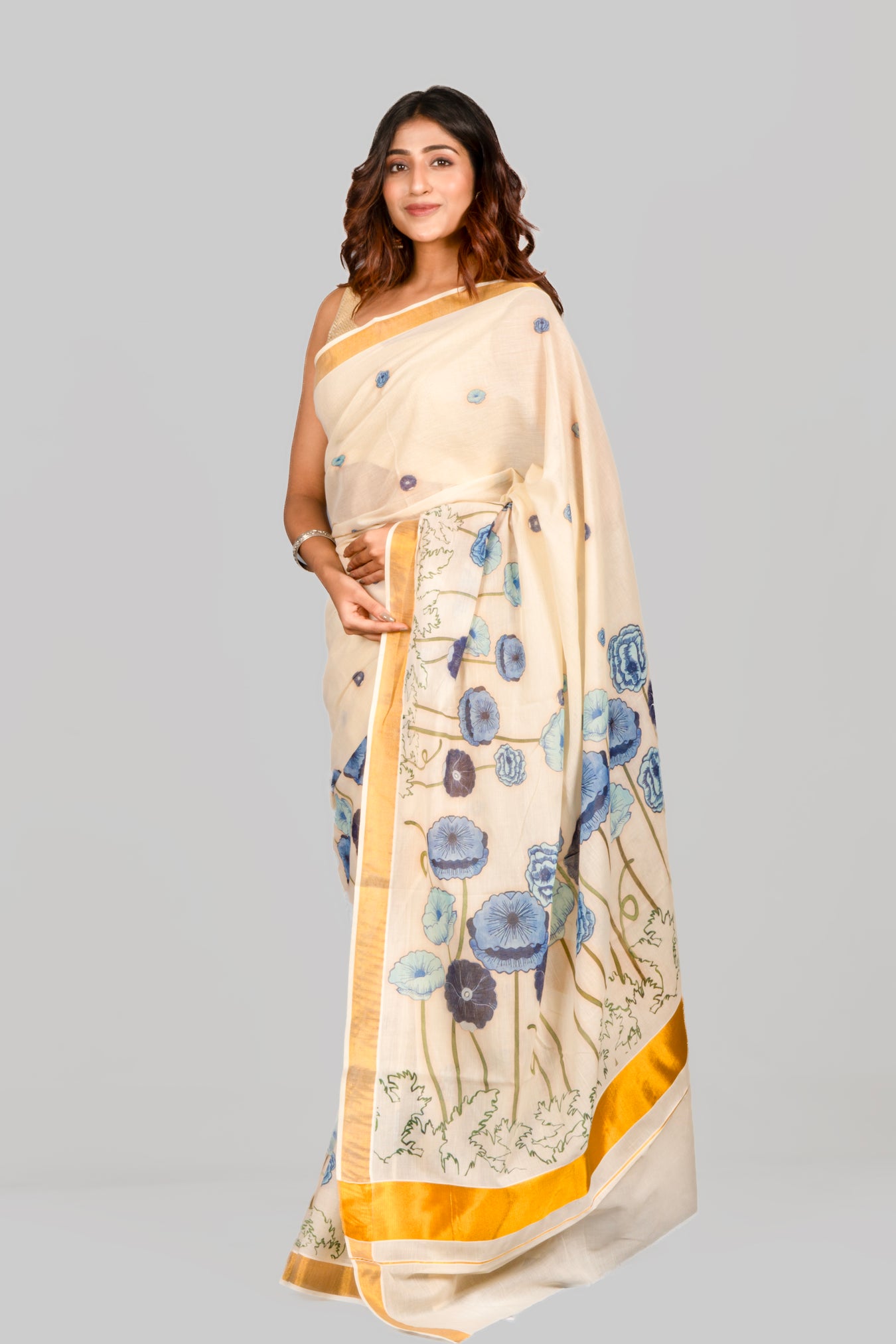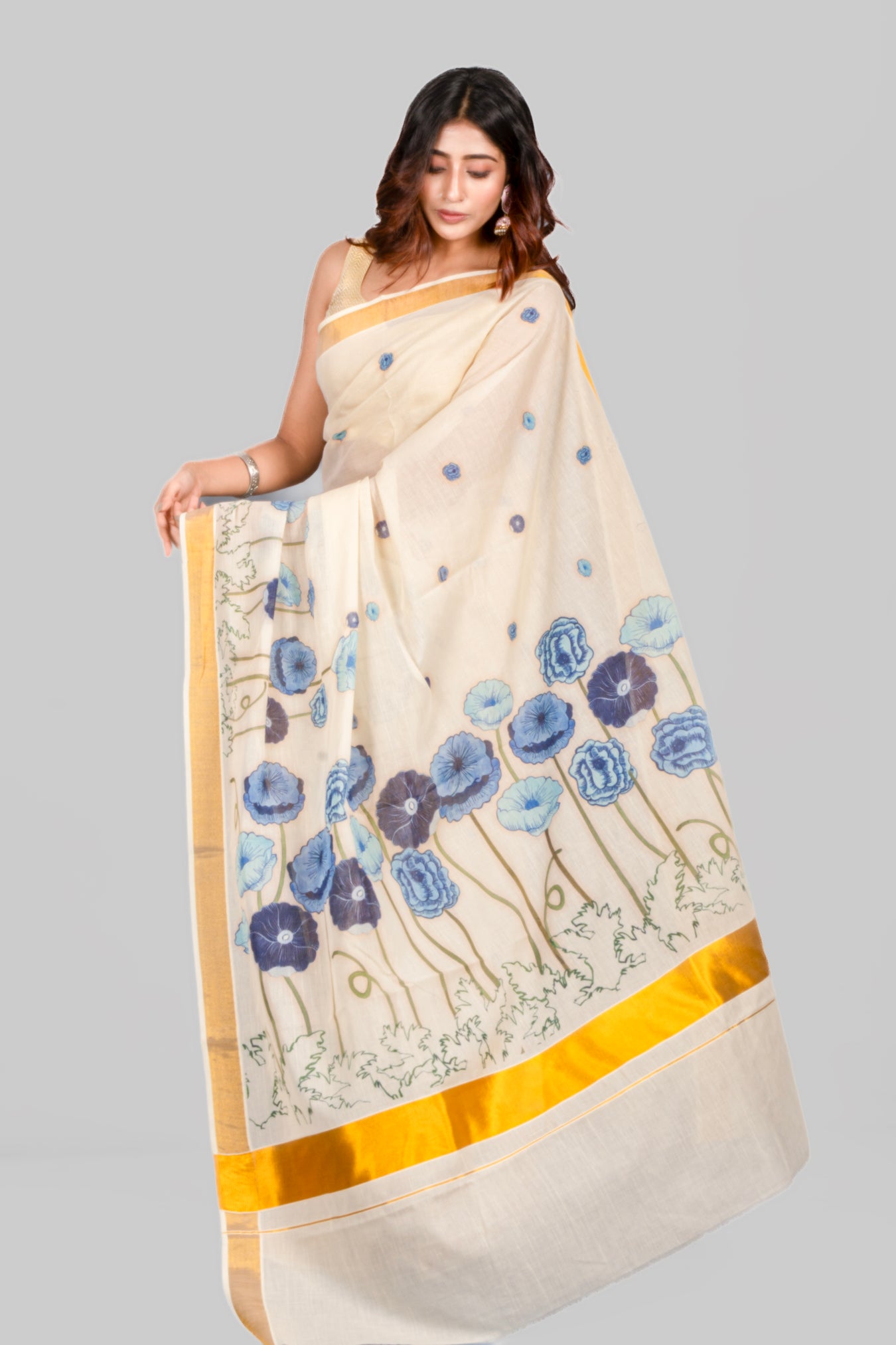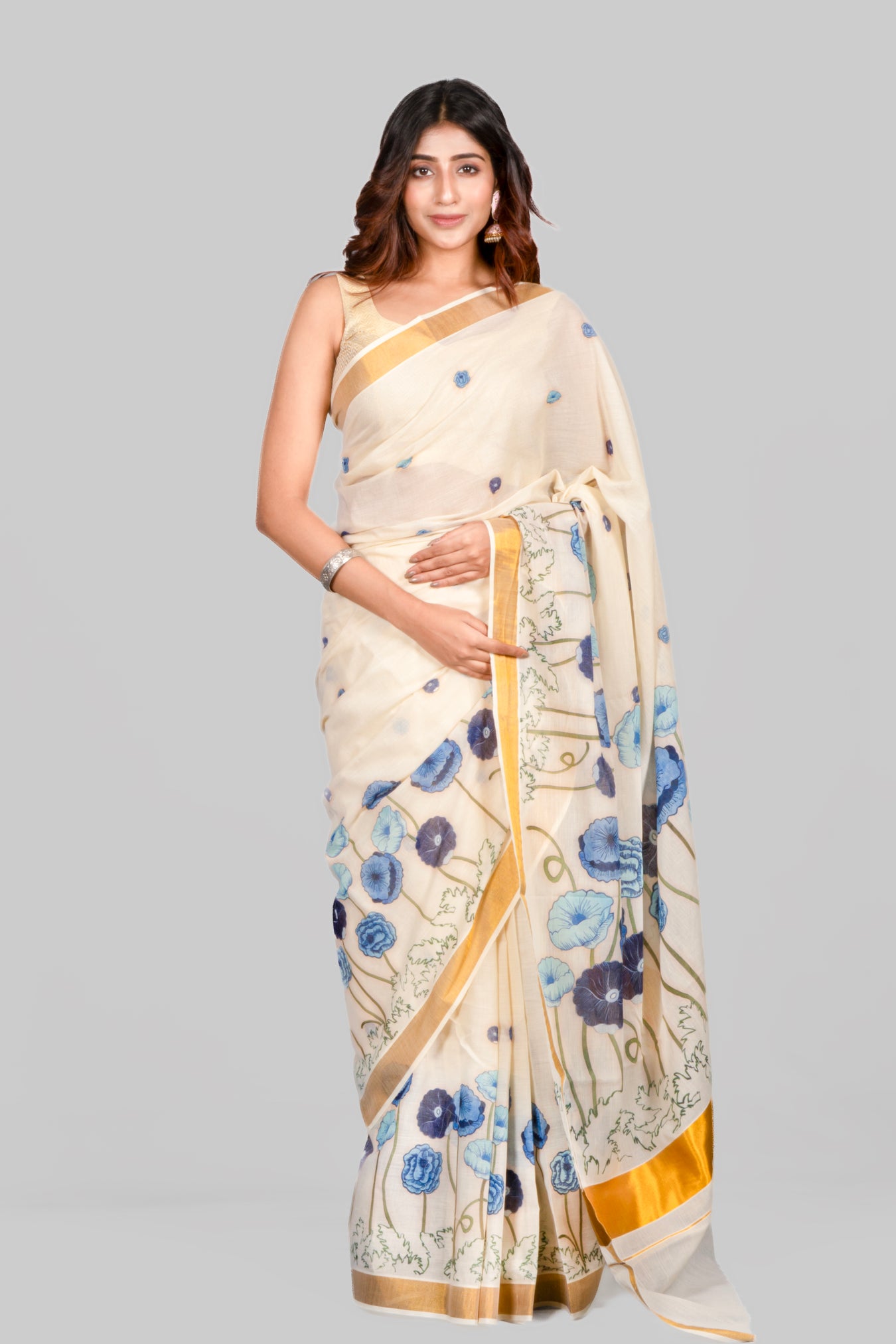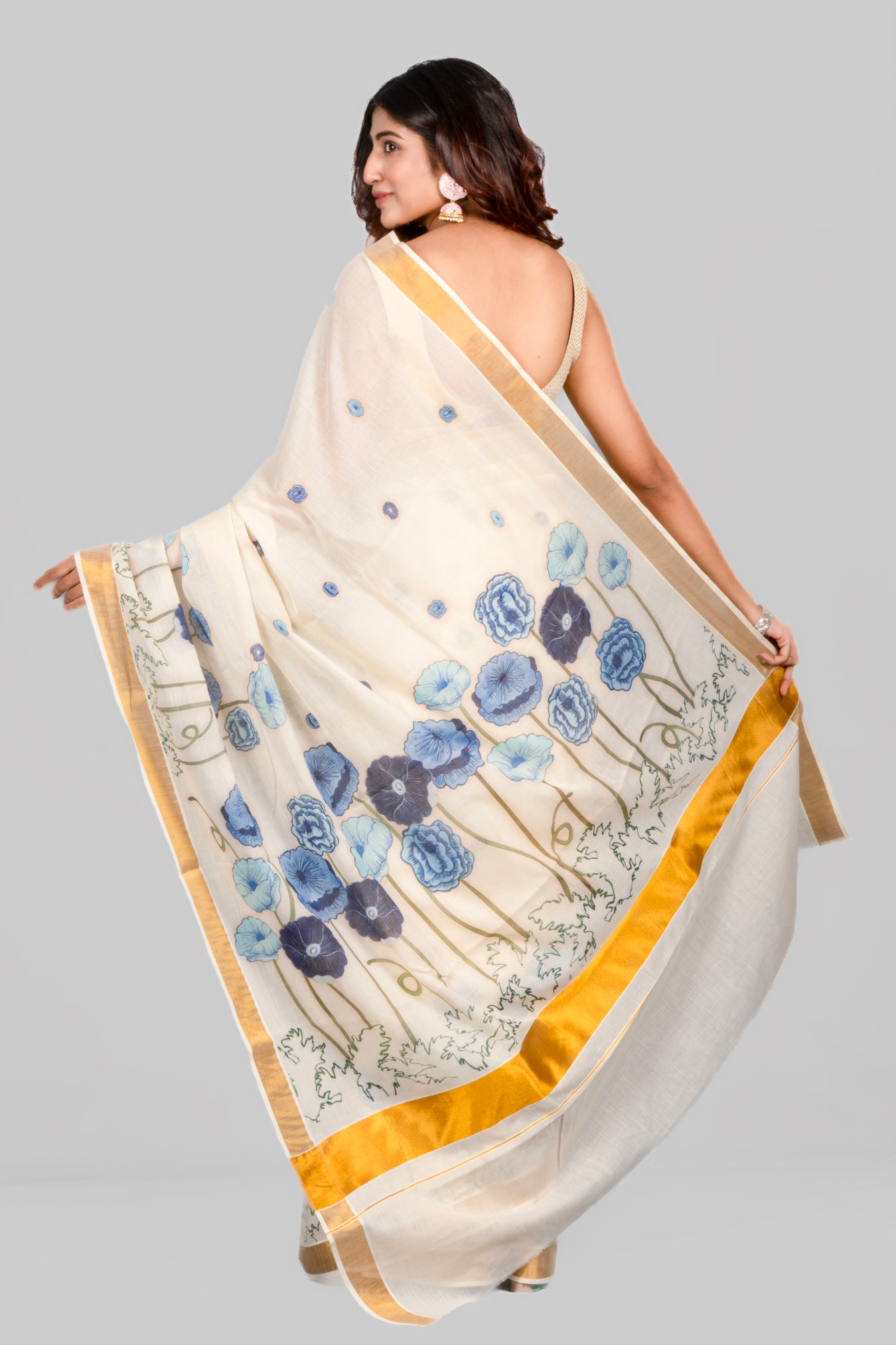 Size: 5.50Mtr B: 0.80MtrColor: Off WhiteFabric: Kasavu Cotton Pattern and print: A motif that features vibrant and vivid watercolor-style illustrations of flowers. Watercolor is a painting technique that uses translucent pigments, creating a soft and fluid appearance, typically associated with a sense of delicacy and artistic expression. Pack contains: 1 Saree, 1 BlouseCare instructions: Dry wash