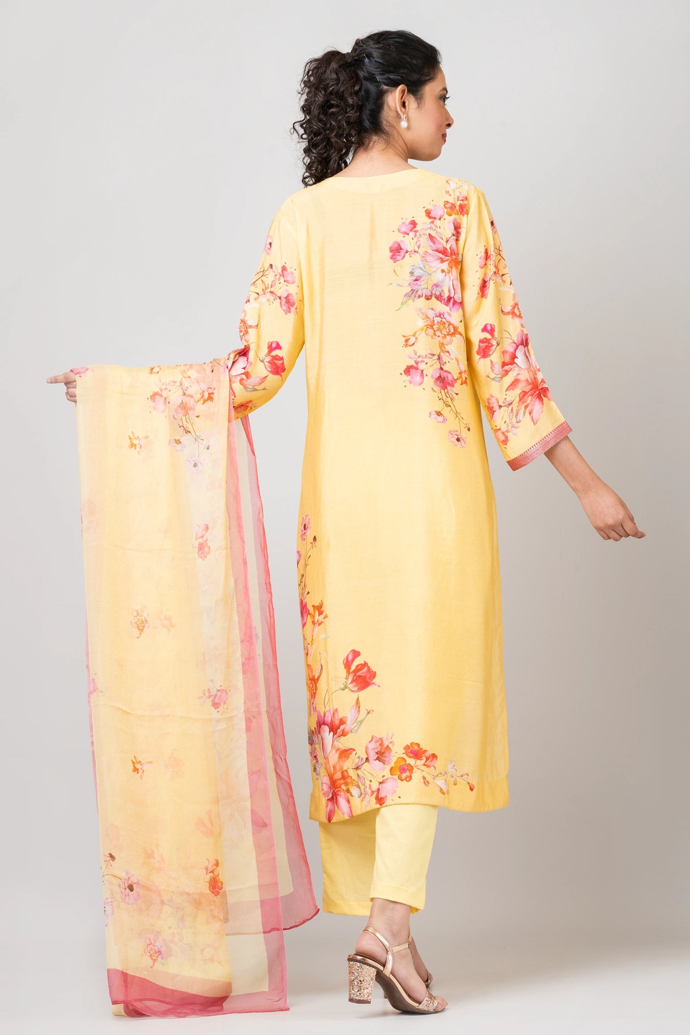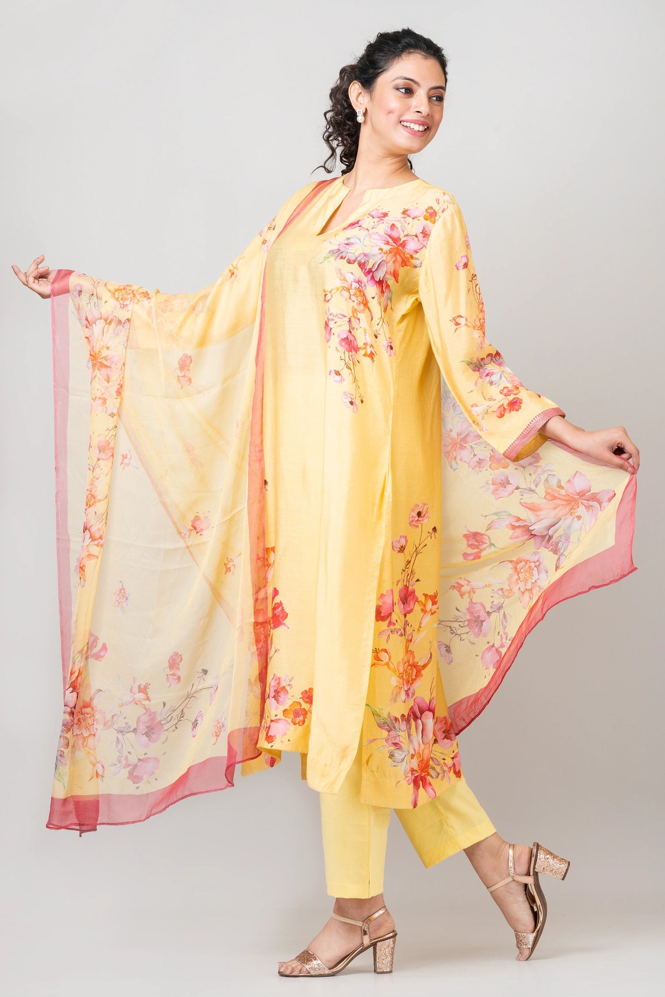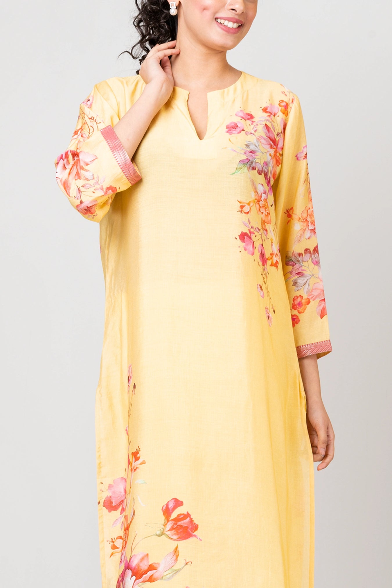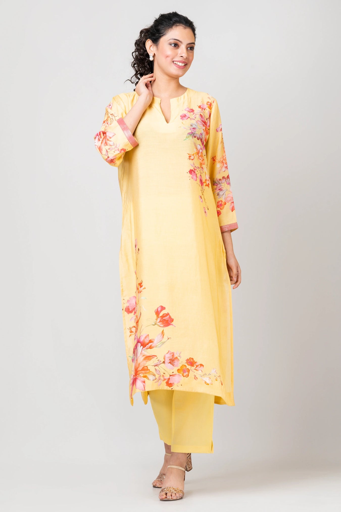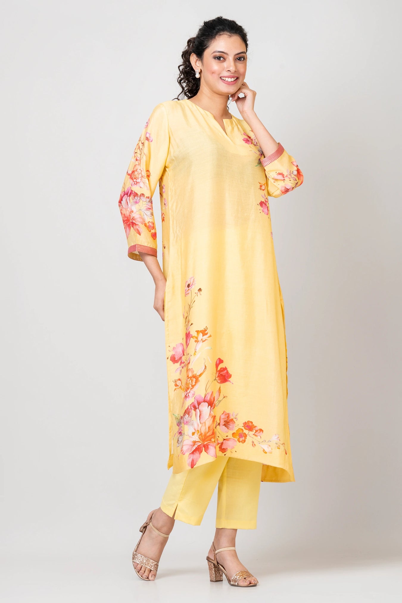 Colour: Light YellowFabric: Chanderi Kurti, Chanderi Pants, Chifon DuppattaAttribute: Zari border on sleevePattern and print: Indulge in the timeless beauty of our floral print kurta, where the delicate blooms paint a picture of elegance and charm in every stitch.Purity: Natural FabricPack Contains: 1 Kurti, 1 Pant with 1 DupattaCare instructions: Hand wash