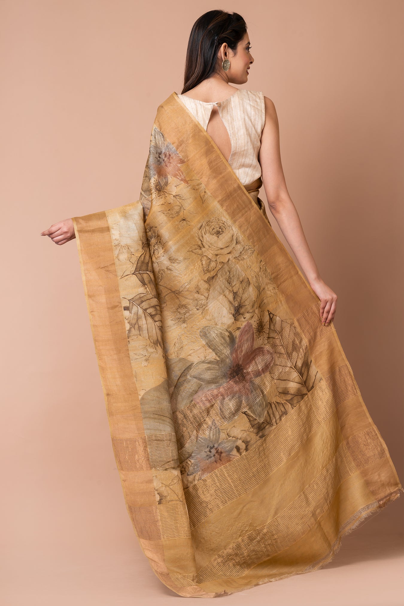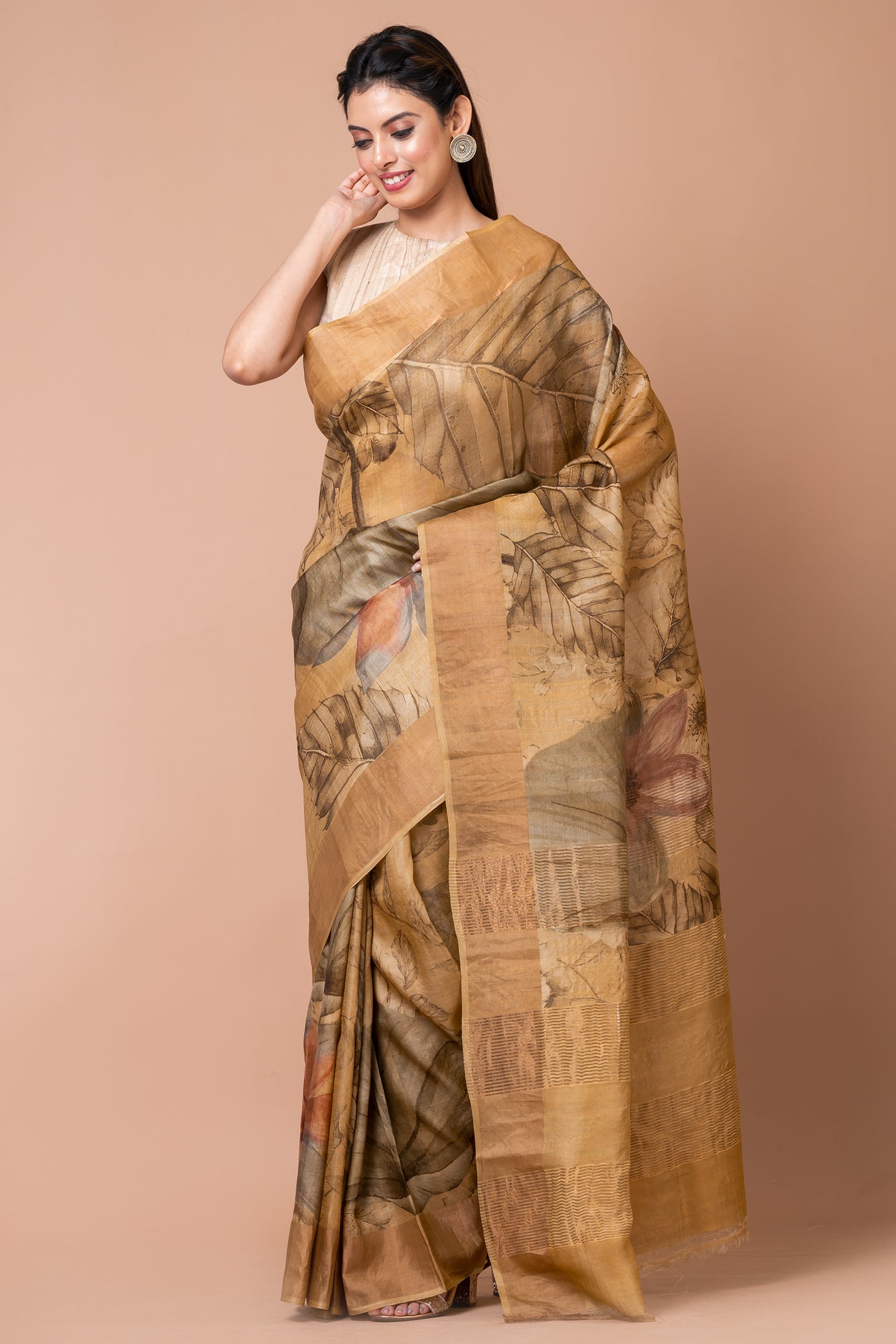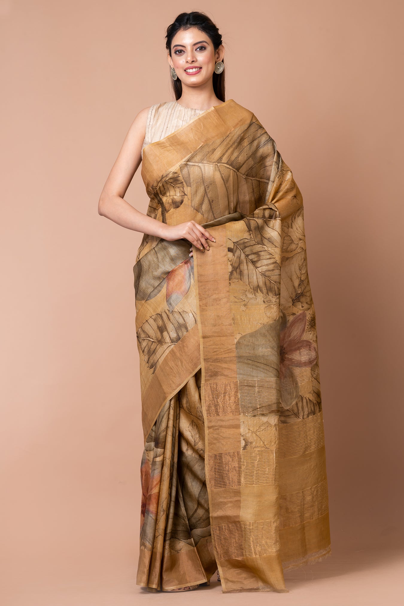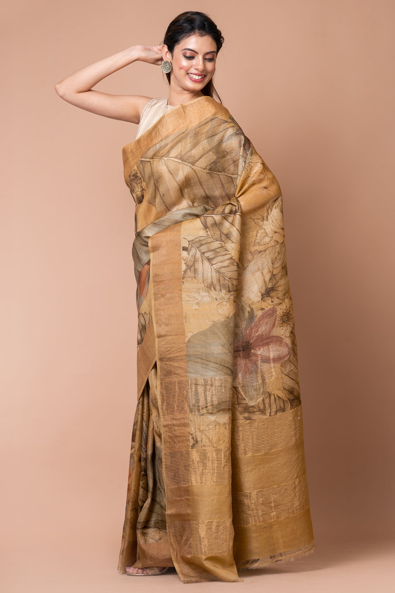 Size: S: 5.50Mtr B: 0.80MtrColour: MustardFabric: TussarPattern and print: Introducing our elegant mustard Tussar silk saree, featuring a delicate zari border and adorned with large monotone-colored flower motifs throughout. This saree effortlessly combines traditional charm with modern sophistication, making it a timeless choice for any occasion.Silk purity: Pure Tussar Silk with zari borderPack contains: 1 Saree, 1 BlouseCare instructions: Dry wash
