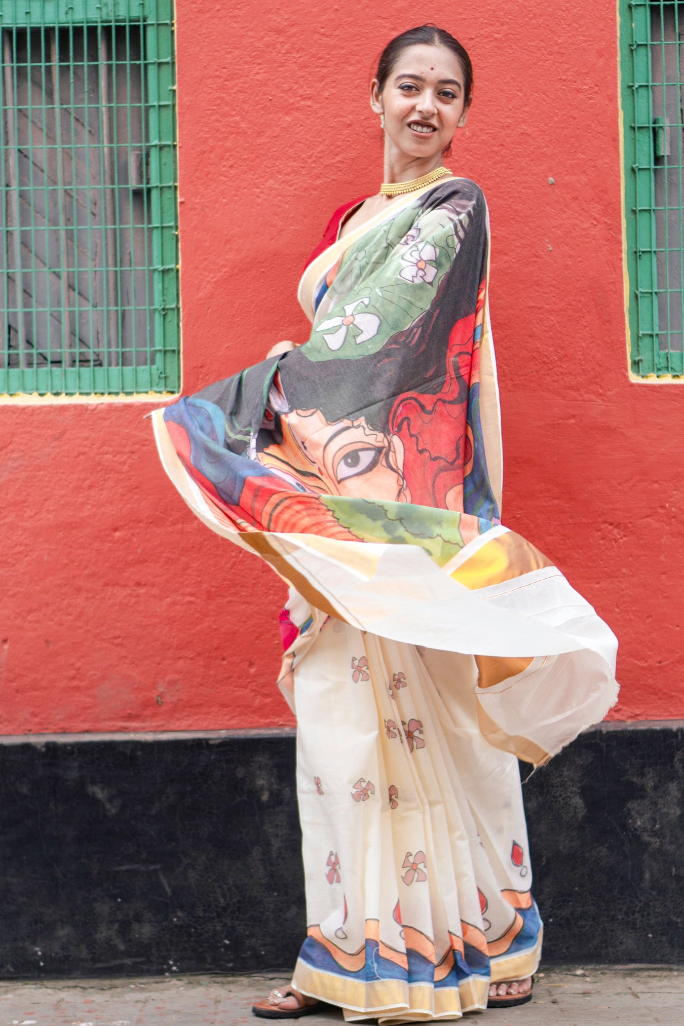 Size: 5.50Mtr BP: 0.80MtrColor: Off WhiteFabric: Kasavu Cotton Pattern and print: This saree is a traditional white base handloom piece featuring script-style motifs in a deep red maroon tone across the body and pallu. The print resembles ancient manuscript text and artistic line drawings, giving it a heritage look. The saree is bordered with a slim golden zari edge and highlighted with yellow detailing on the pallu, adding a touch of vibrancy. The overall pattern combines cultural storytelling through script prints with minimalistic elegance, making it perfect for festive and traditional occasions.Pack contains: 1 Saree, 1 BlouseCare instructions: Dry wash