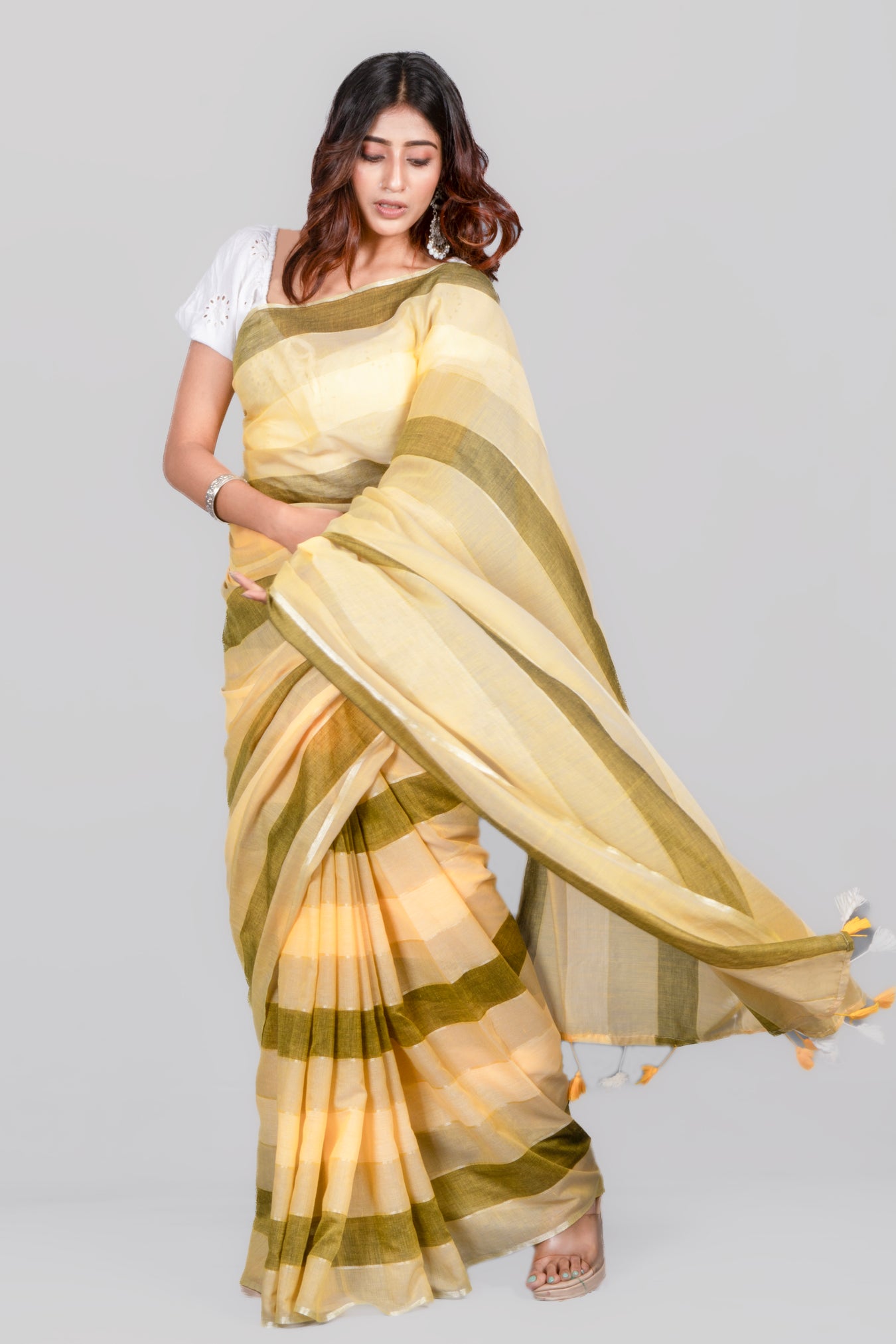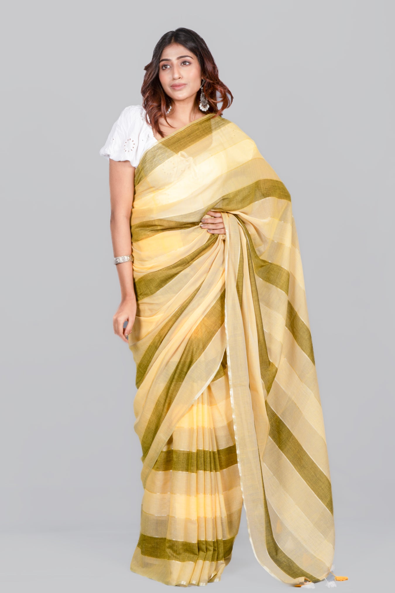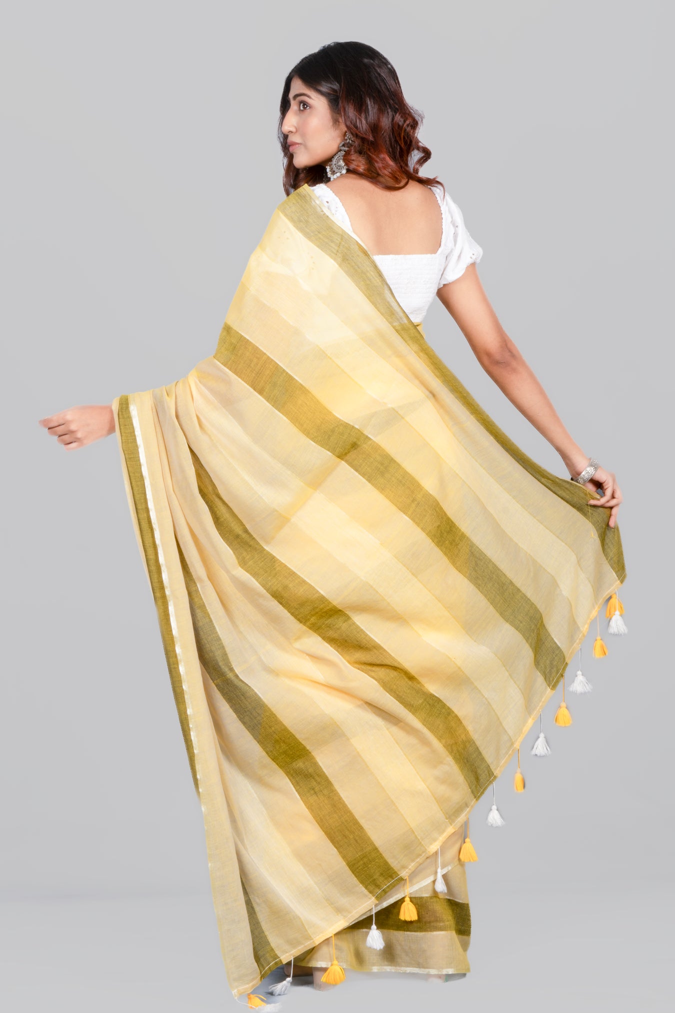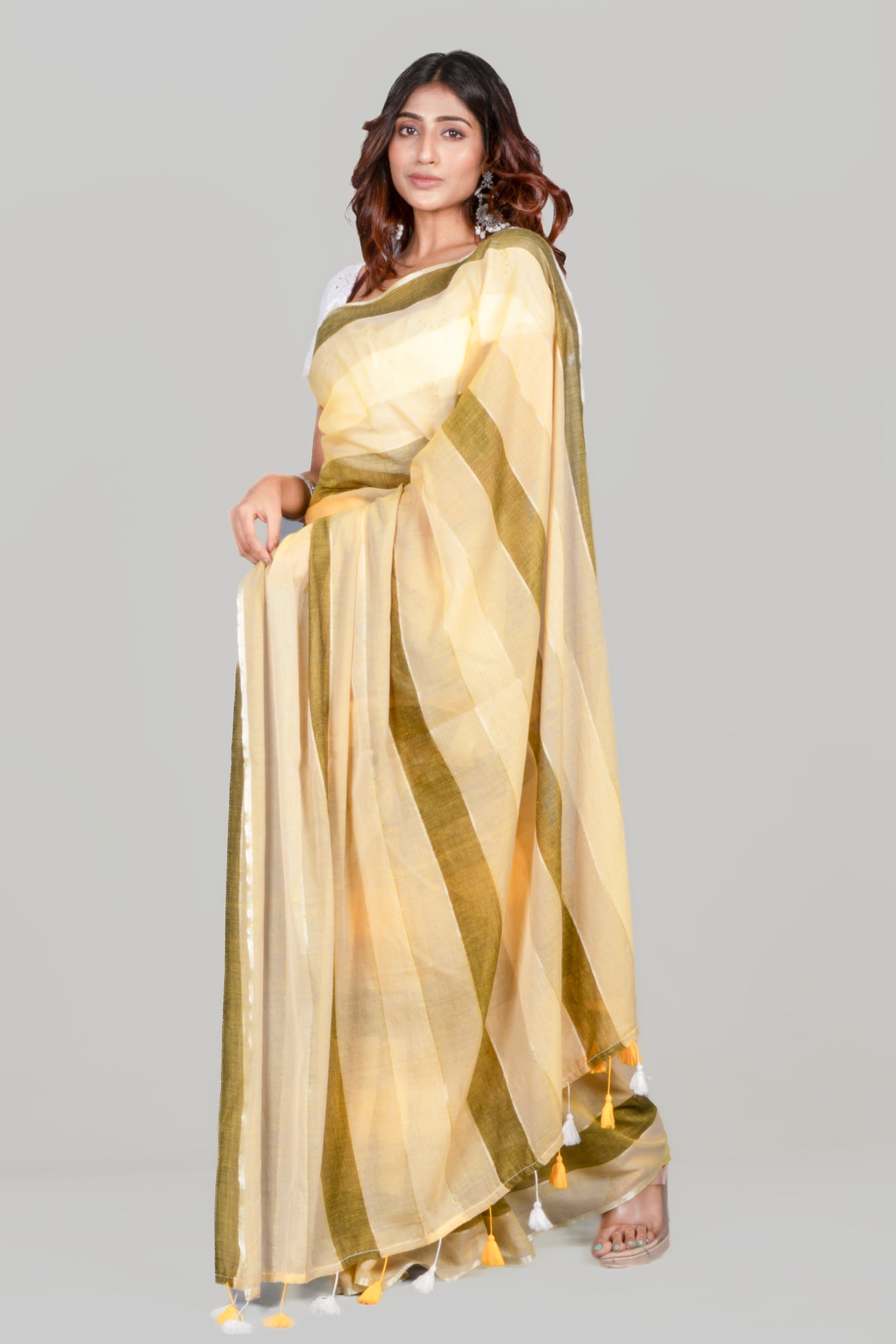 Color: Olive green shadedFabric: MulmulPattern and print: This soft mulmul saree in stripe body is one of a kind with multi-color tassels. The saree brings out the softness from within and making it a statement look.
