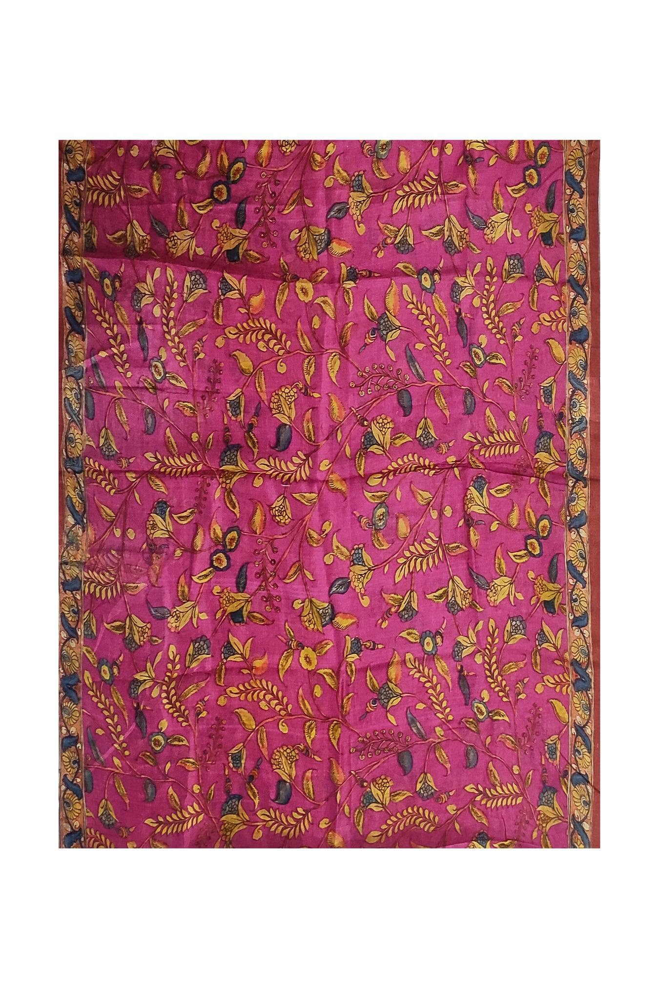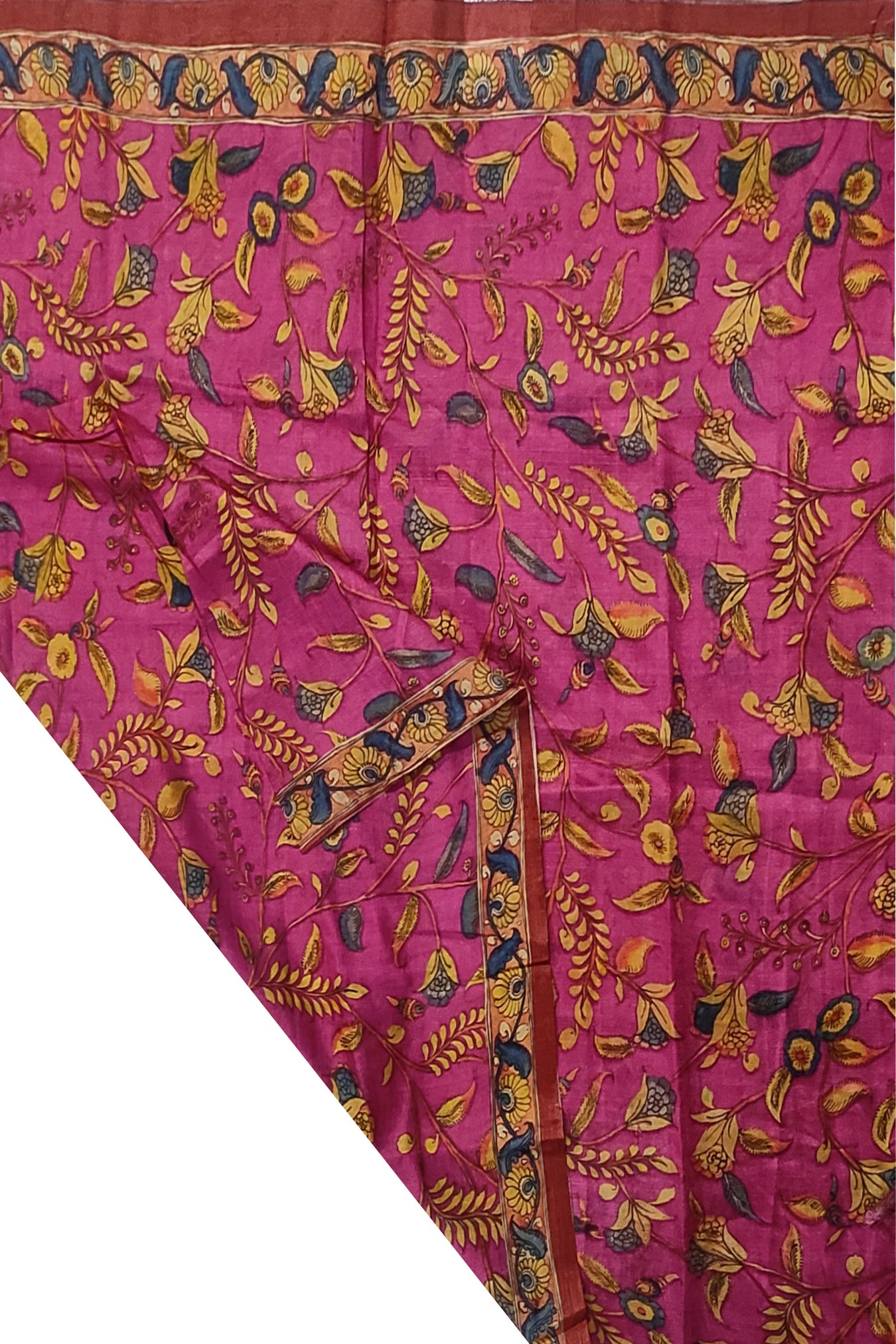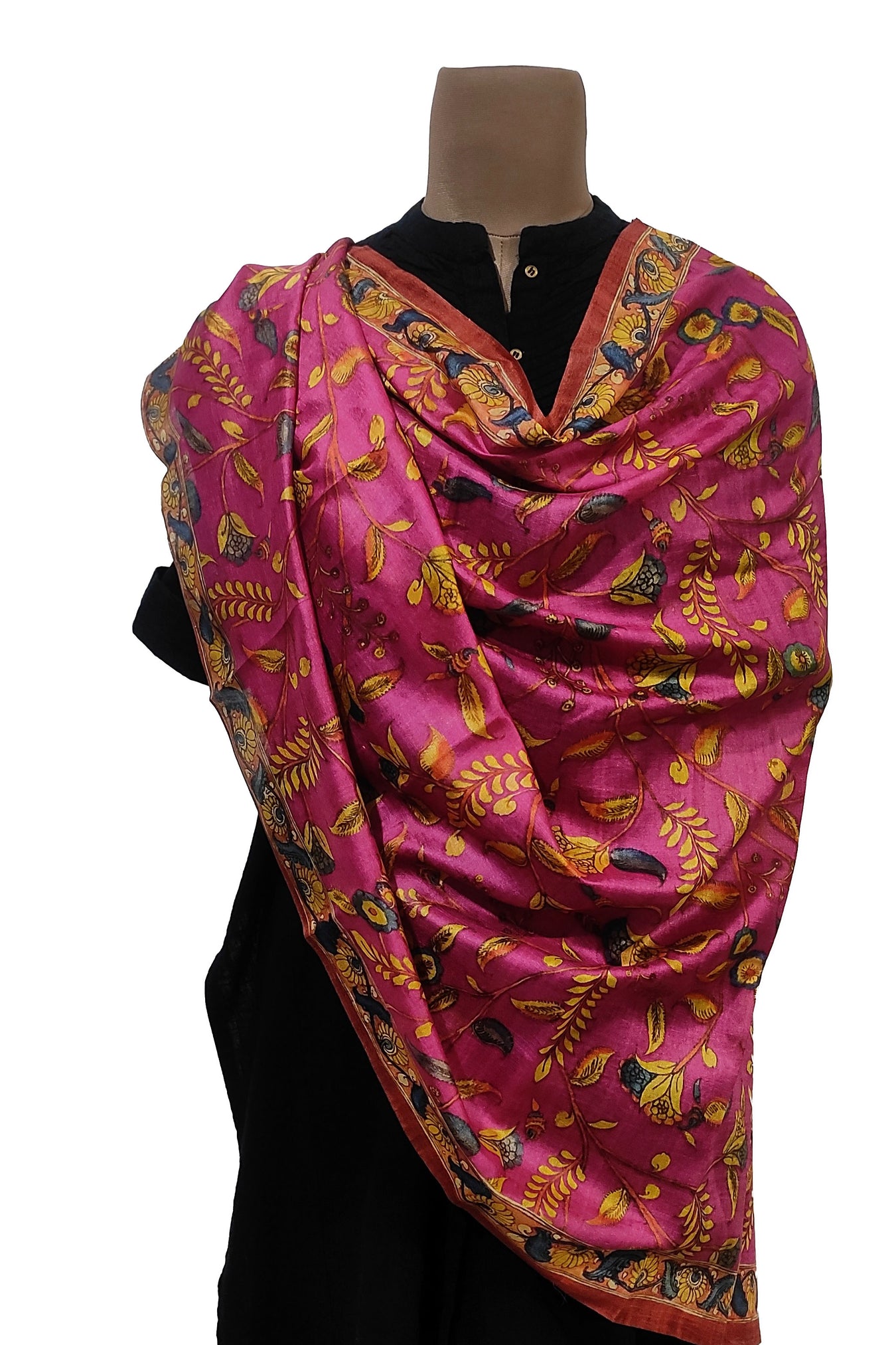 The body is covered in kalamkari digital prints, which are accentuated by a border and the luster of the fabric. Its design value is enhanced by a bright fusain pink base embellished with floral kalamkari motifs. The kalamkari prints have been modernized in response to changing fashion trends. The item can be worn with both traditional and Indo-western clothing. A one-of-a-kind piece that combines tradition and style.