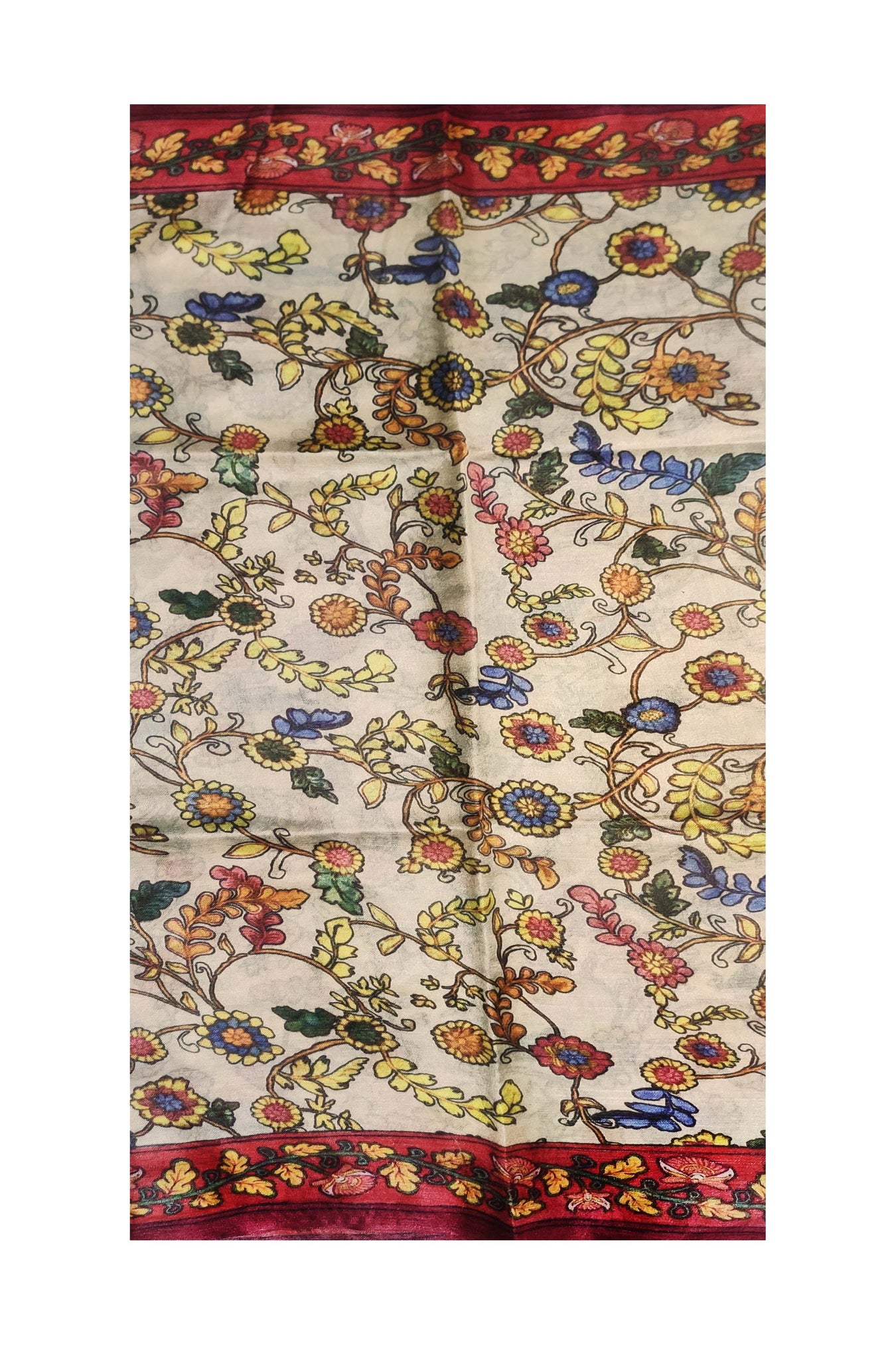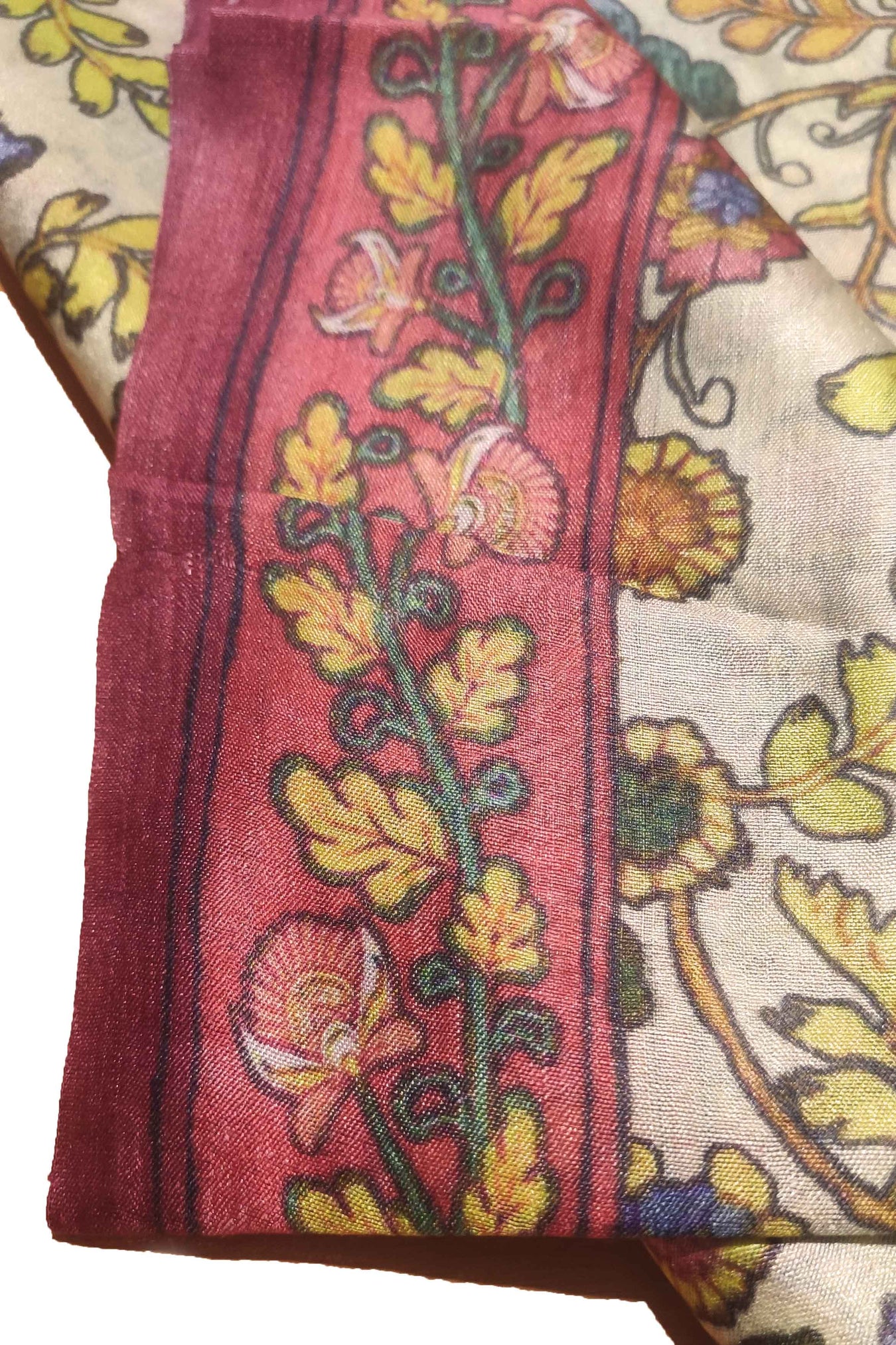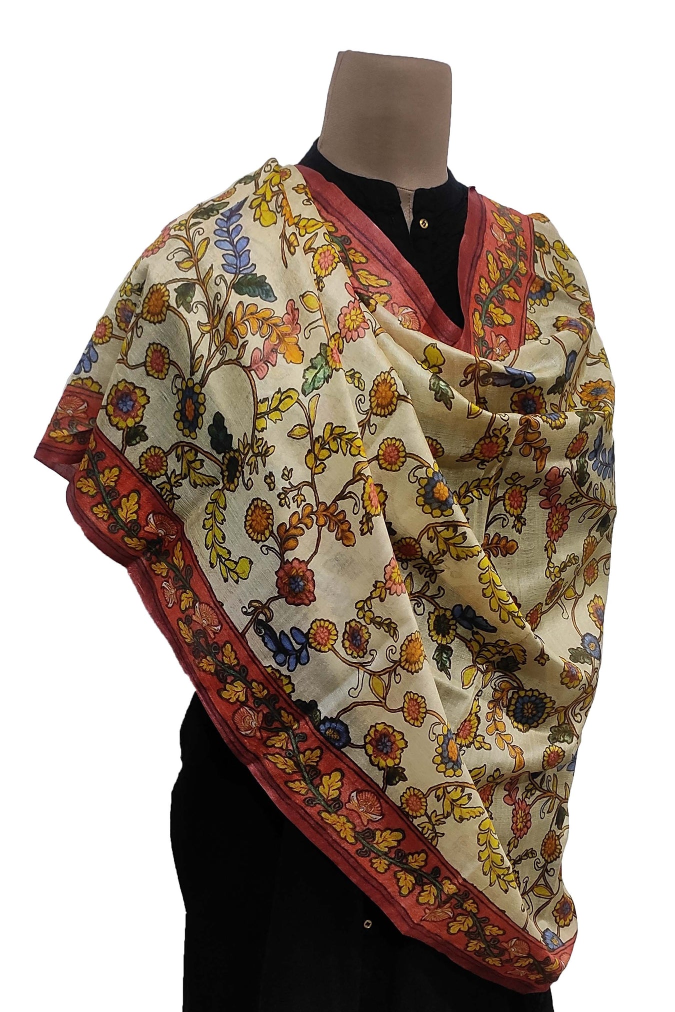 The duppatta's body is covered in kalamkari digital prints, which are complemented by a floral border and the luster of the fabric. A cream tone base embellished with bright colored floral jaal kalamkari motifs adds to its design value. In response to changing fashion trends, kalamkari prints have been modernized. The piece can be worn in a traditional manner. It's a one-of-a-kind piece that combines tradition and modernity.