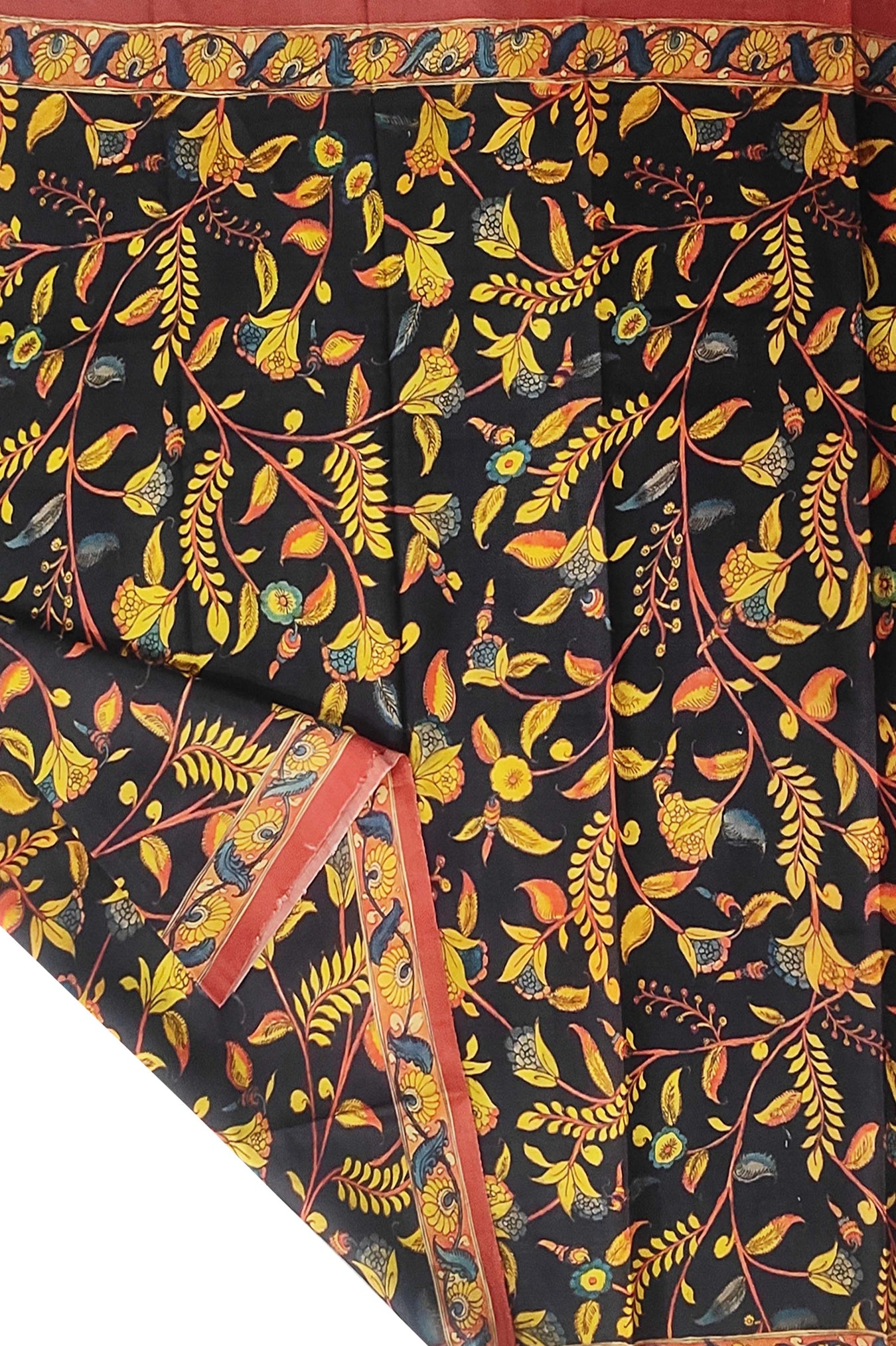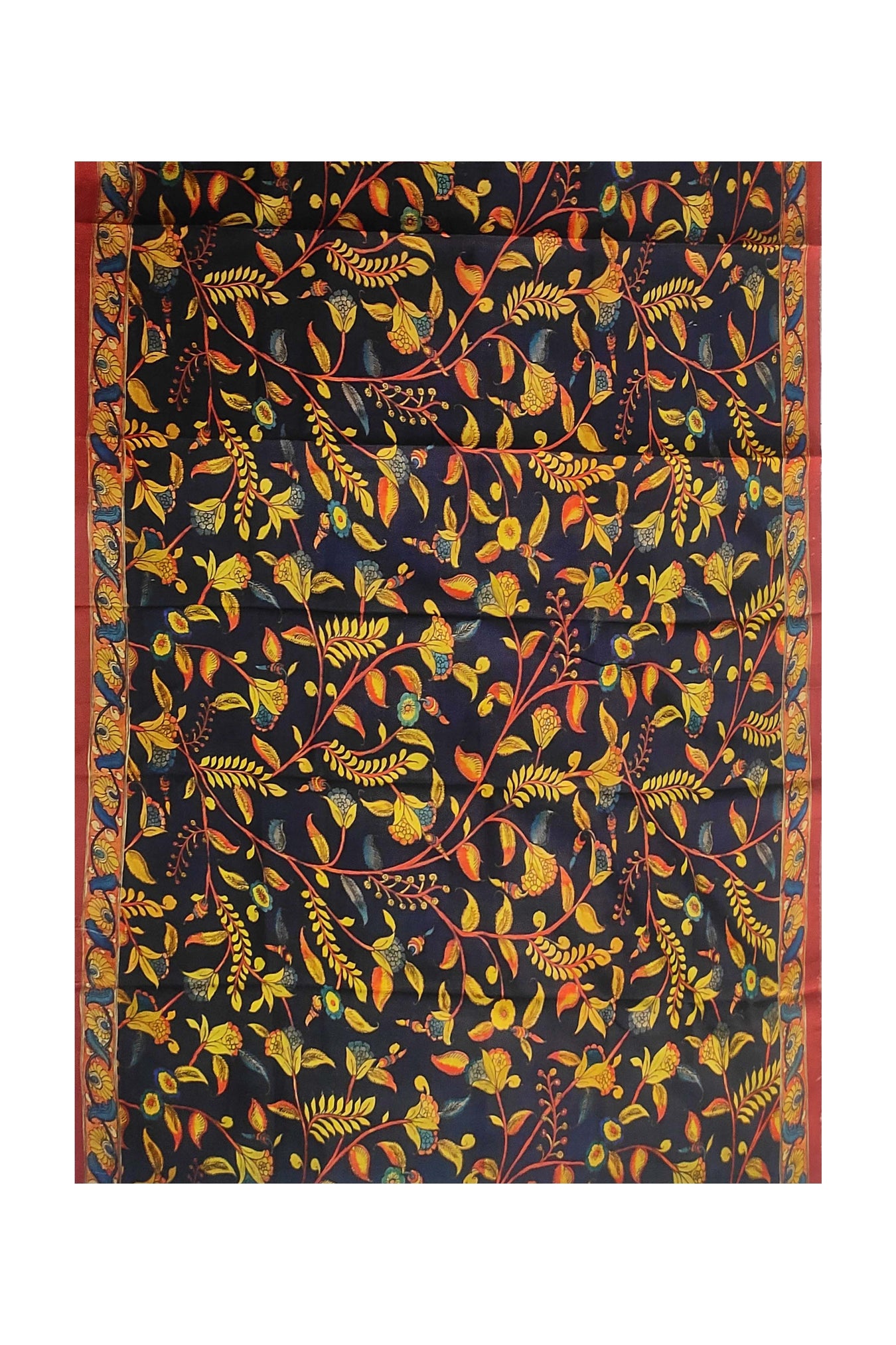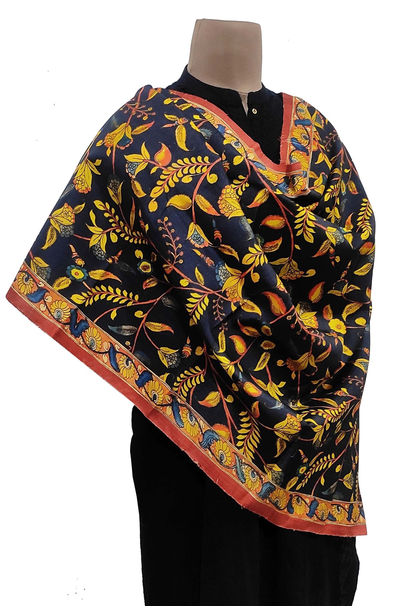 The duppatta's body is covered in kalamkari digital prints, which are complemented by a floral border and the luster of the fabric. A dark blue base embellished with brightly colored floral kalamkari motifs adds to its design value. In response to changing fashion trends, kalamkari prints have been modernized. The item is appropriate for both traditional and Indo-western attire. A one-of-a-kind piece that blends tradition and fashion.