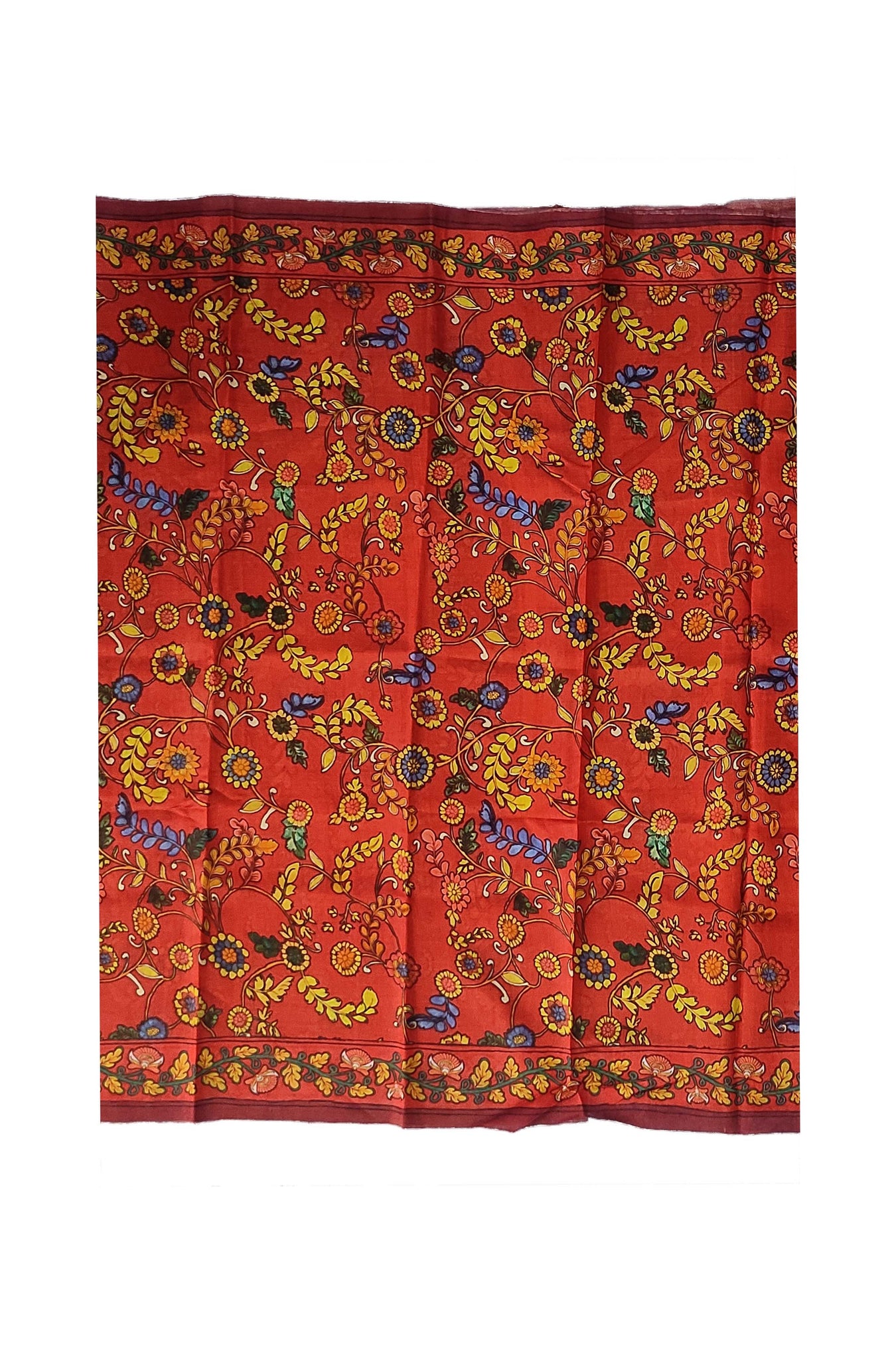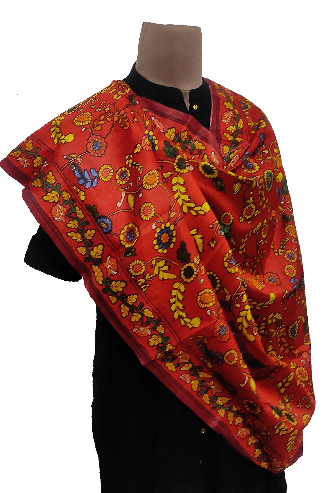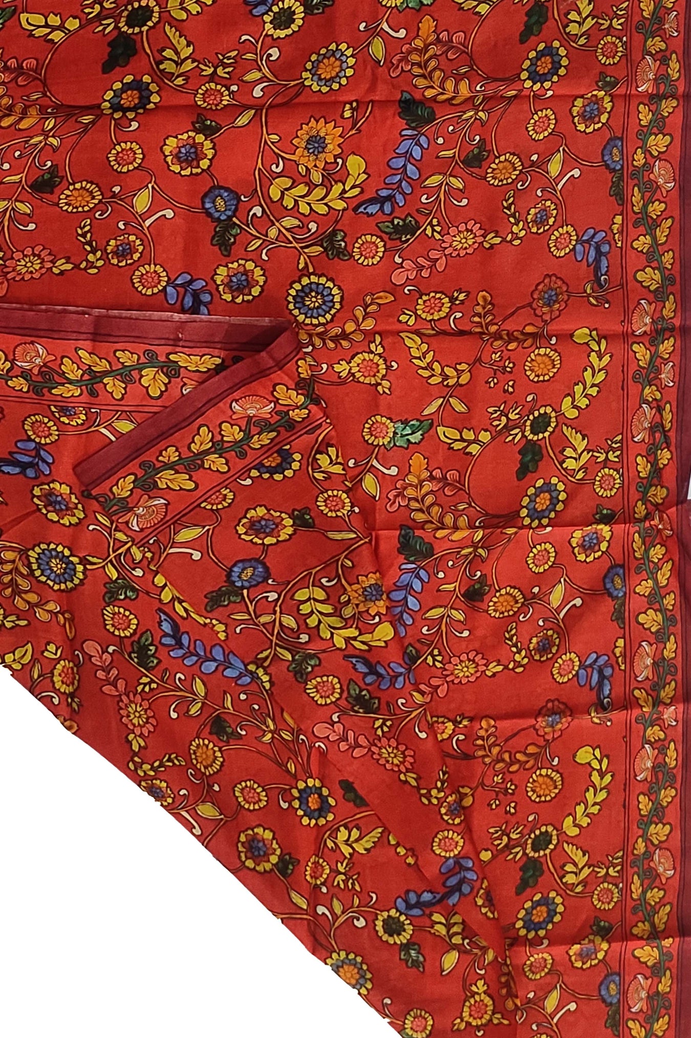 The body is covered in kalamkari digital prints that are enhanced by a detailed border and the luster of the fabric. A bright reddish orange base embellished with brightly colored floral kalamkari motifs adds to its design value. In response to changing fashion trends, the kalamkari prints have been modernized. The item is suitable for both traditional and Indo-western attire. A one-of-a-kind item that blends tradition and style.