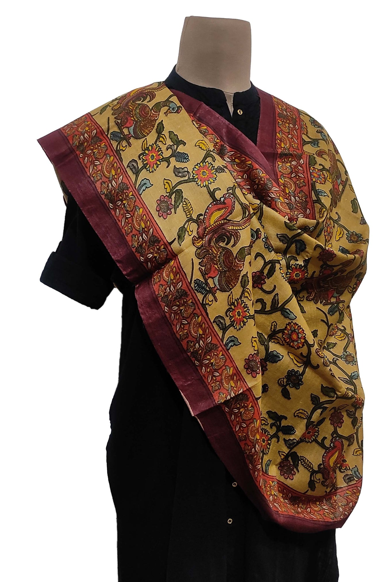 The body is decorated with kalamkari digital prints that are framed by a border. An earthy soil-like color base embellished with floral kalamkari motifs adds to its design value. In response to changing fashion trends, kalamkari prints have been modernized. This piece expresses tradition, ethnicity, and sophistication. A one-of-a-kind piece that blends tradition and fashion.