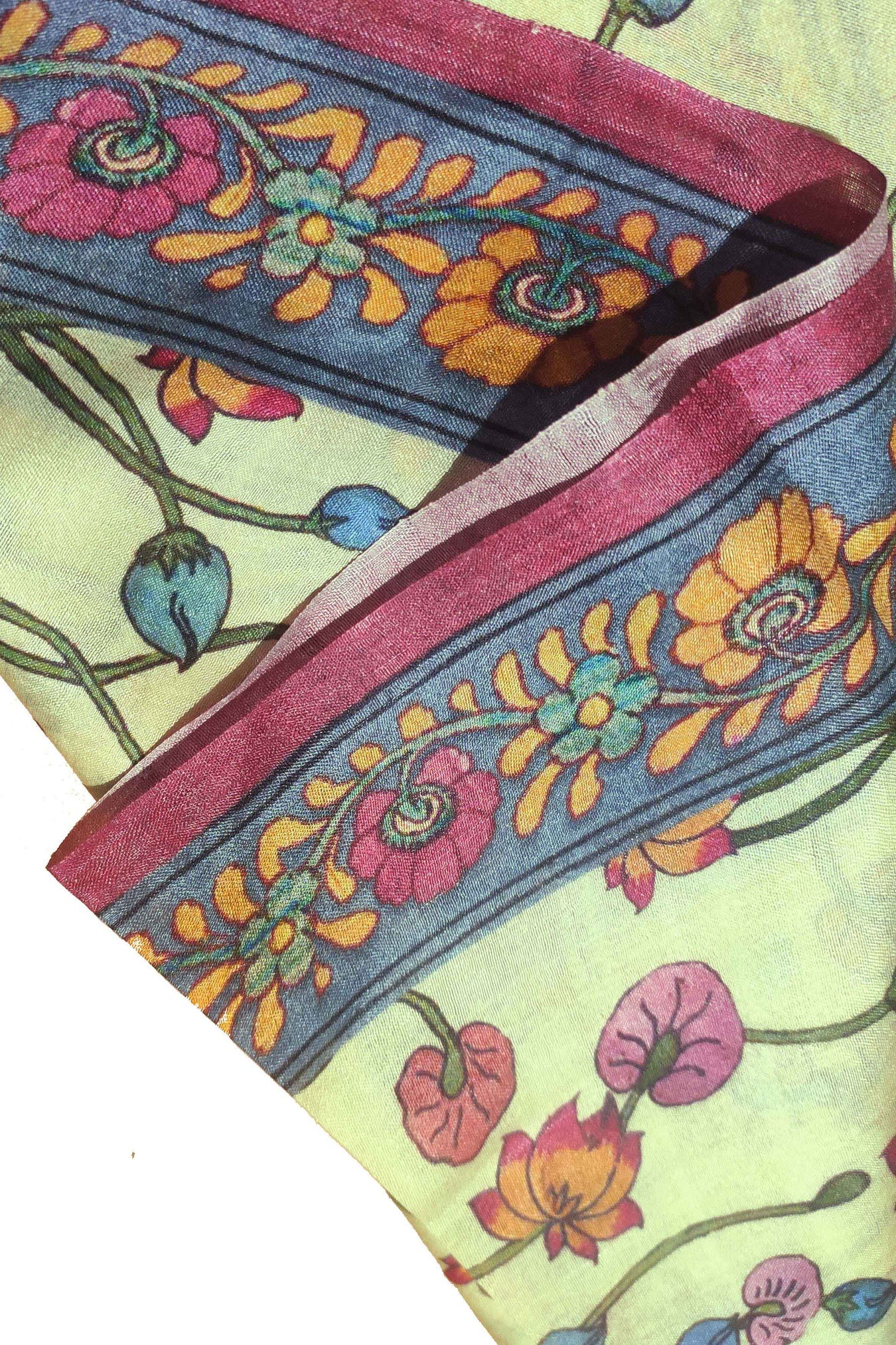 The duppatta's body is covered in kalamkari digital prints, which are complemented by a floral border and the luster of the fabric. A natural toned base embellished with bright colored Lotus jaal kalamkari motifs adds to its design value. In response to changing fashion trends, kalamkari prints have been modernized. The piece can be worn in a traditional manner. It's a one-of-a-kind piece that combines tradition and modernity.