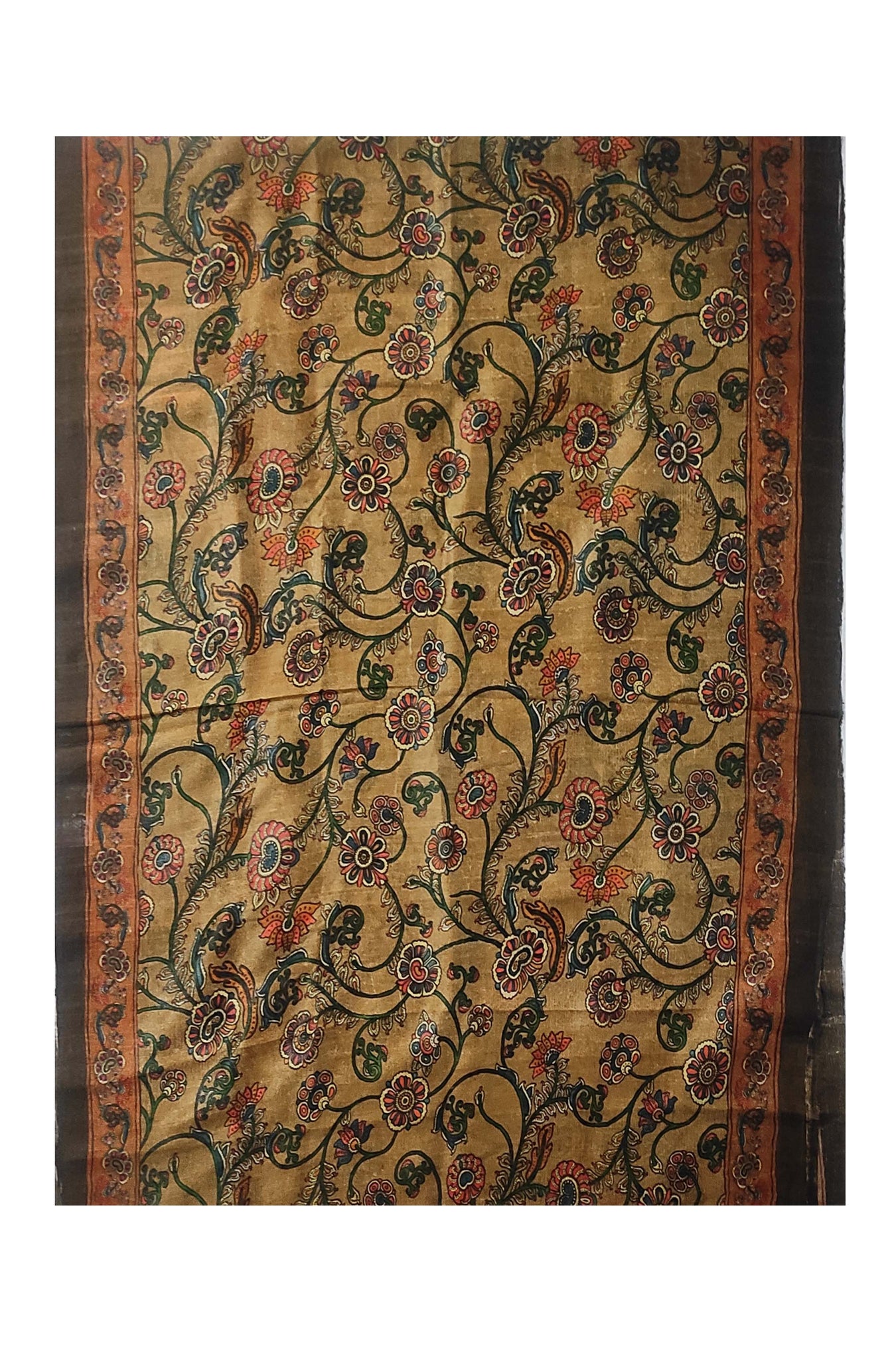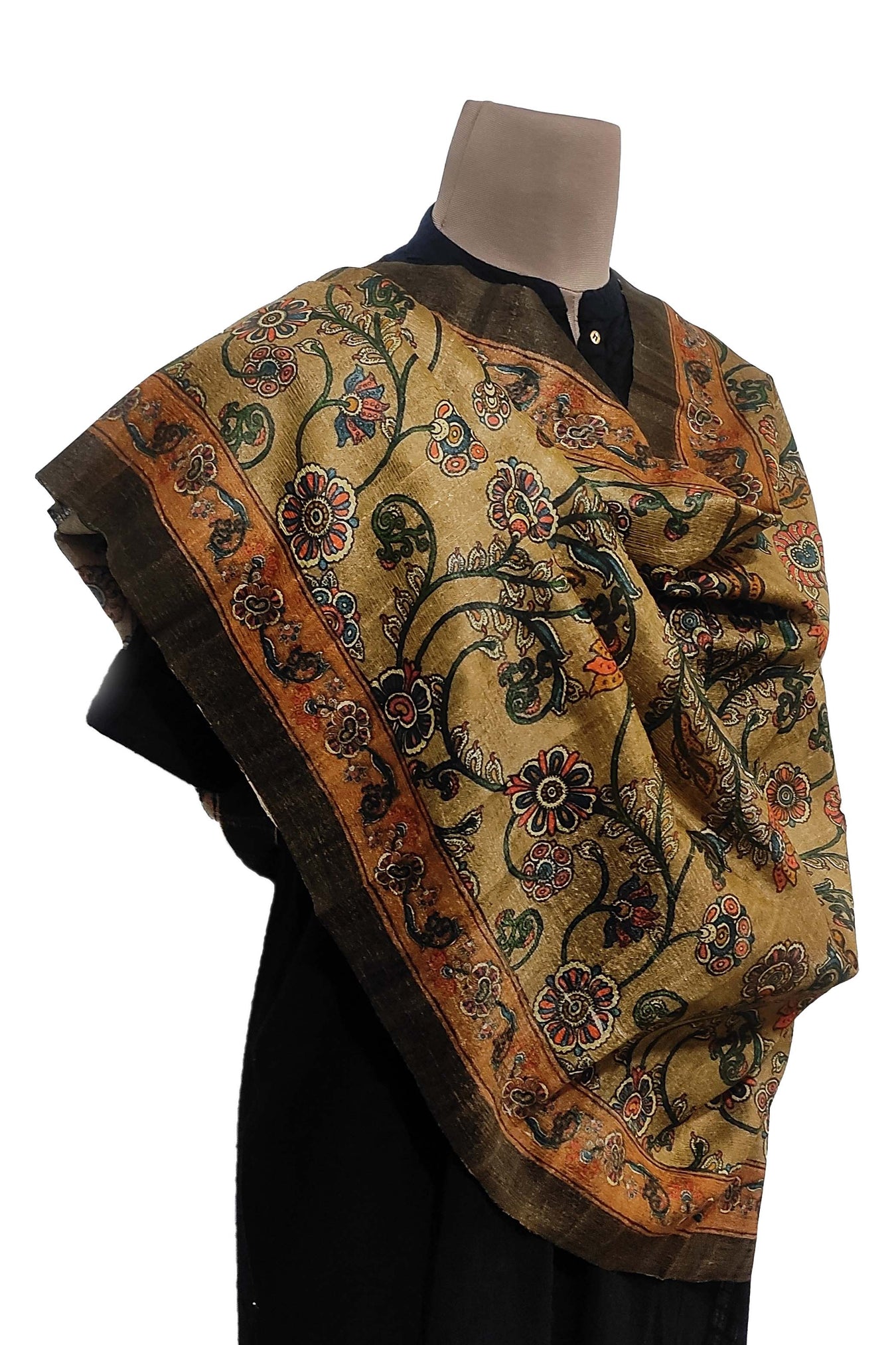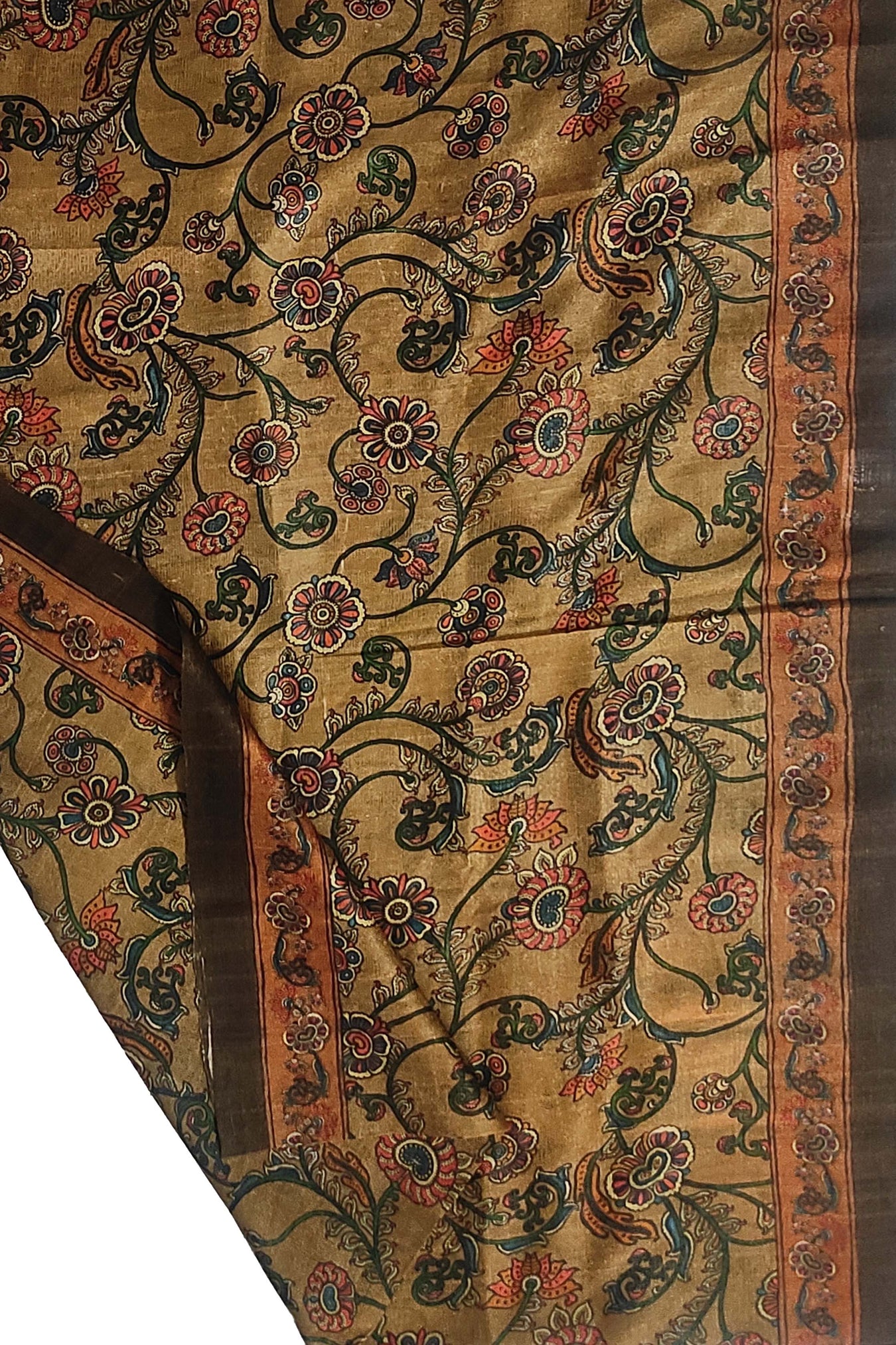 The duppatta is embellished with kalamkari digital prints and a floral border. A natural toned base embellished with subdued colored kalamkari motifs adds to its design value. In response to changing fashion trends, kalamkari prints have been modernized. The piece can be styled in a traditional manner, adding to the art's and tradition's richness. It's a one-of-a-kind piece that combines tradition and modernity.