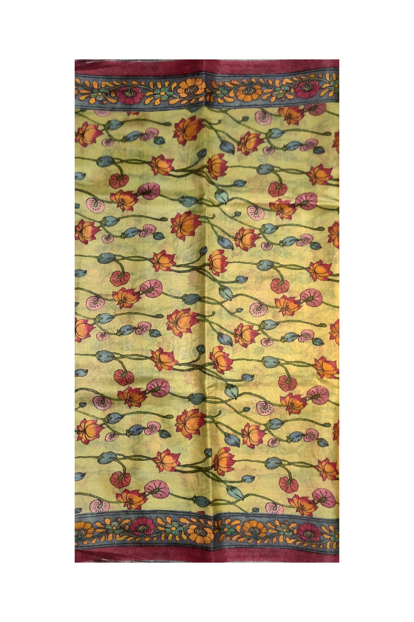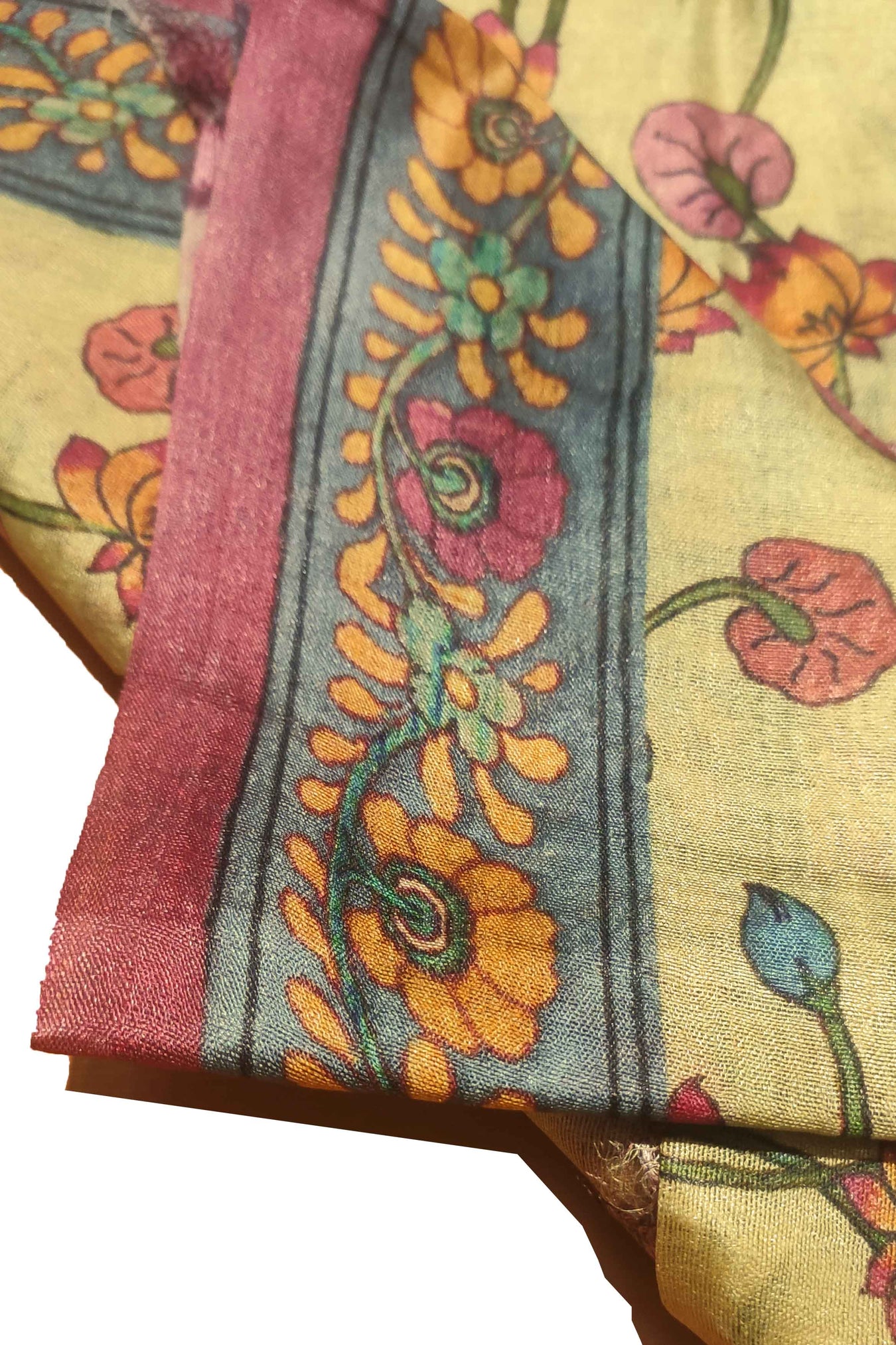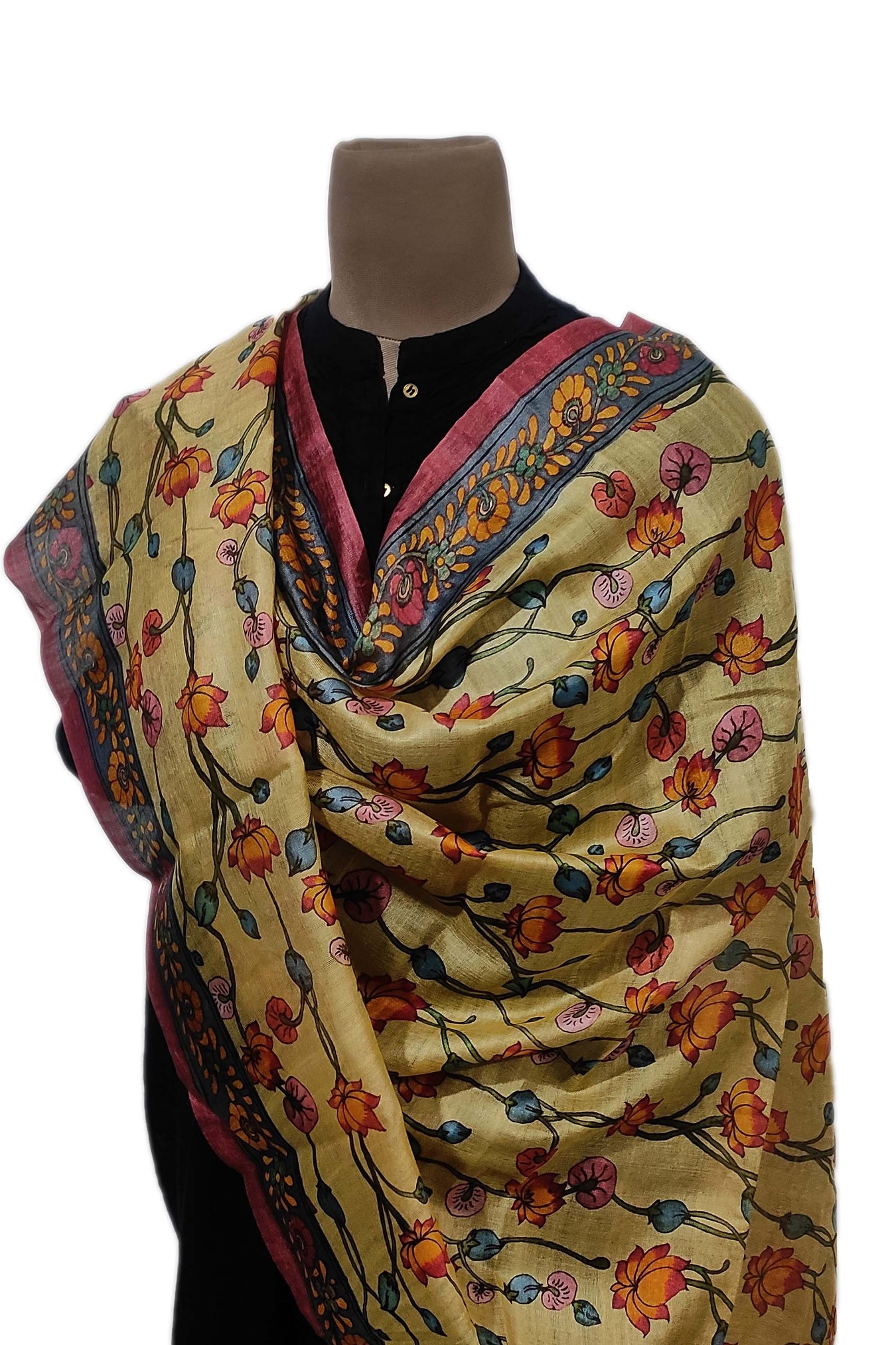 The duppatta's body is covered in kalamkari digital prints, which are complemented by a floral border and the luster of the fabric. A cream tone base embellished with bright colored Lotus jaal kalamkari motifs adds to its design value. In response to changing fashion trends, kalamkari prints have been modernized. The piece can be worn in a traditional manner. It's a one-of-a-kind piece that combines tradition and modernity.