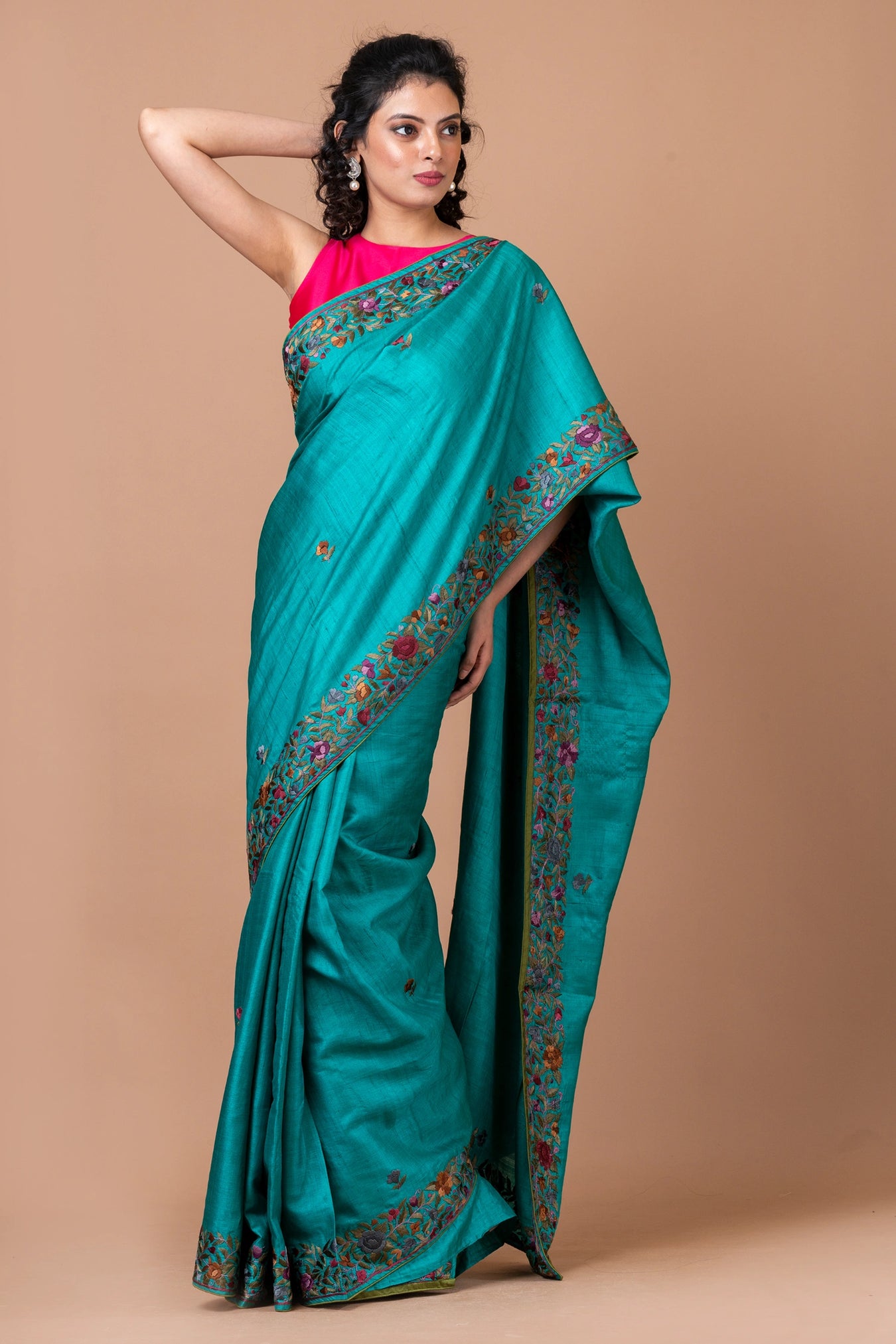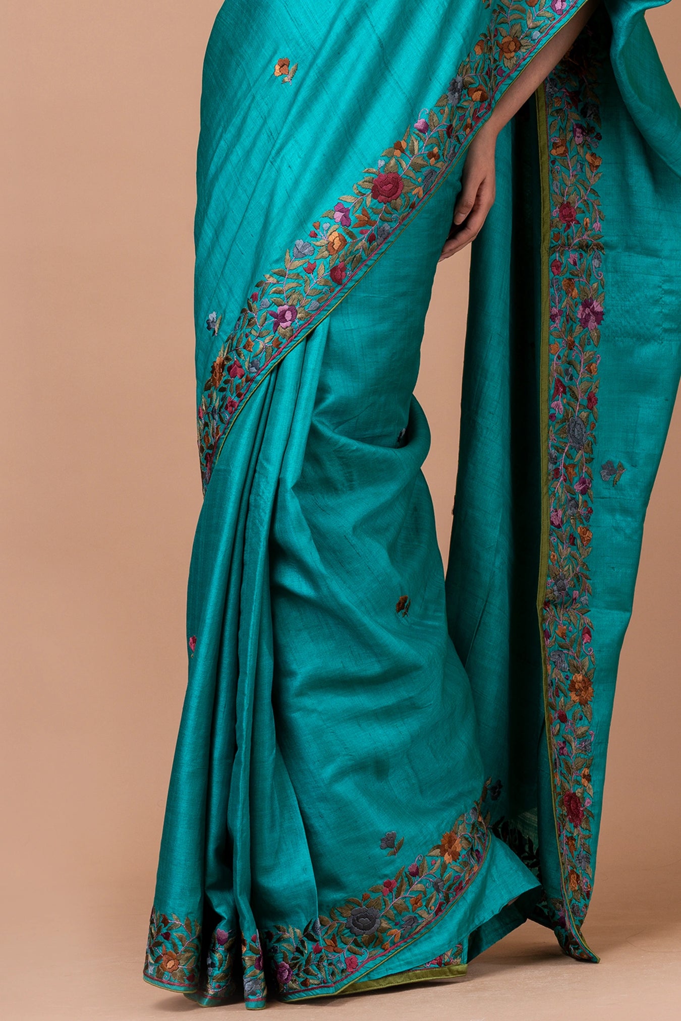 Size:Â S: 5.50Mtr B: 0.80MtrColour: Turqoise Fabric: Tussar SilkAttributes: Parsi satin hand embroideryPattern and print:Â Wrap yourself in luxury with our floral satin embroidery saree. The soft and lustrous satin fabric is adorned with intricate floral embroidery, creating a dazzling and elegant masterpiece. Elevate your style with this exquisite ensemble that captures the essence of femininity and sophistication.Pack contains:Â 1 Saree, 1 BlouseCare instructions:Â Dry wash