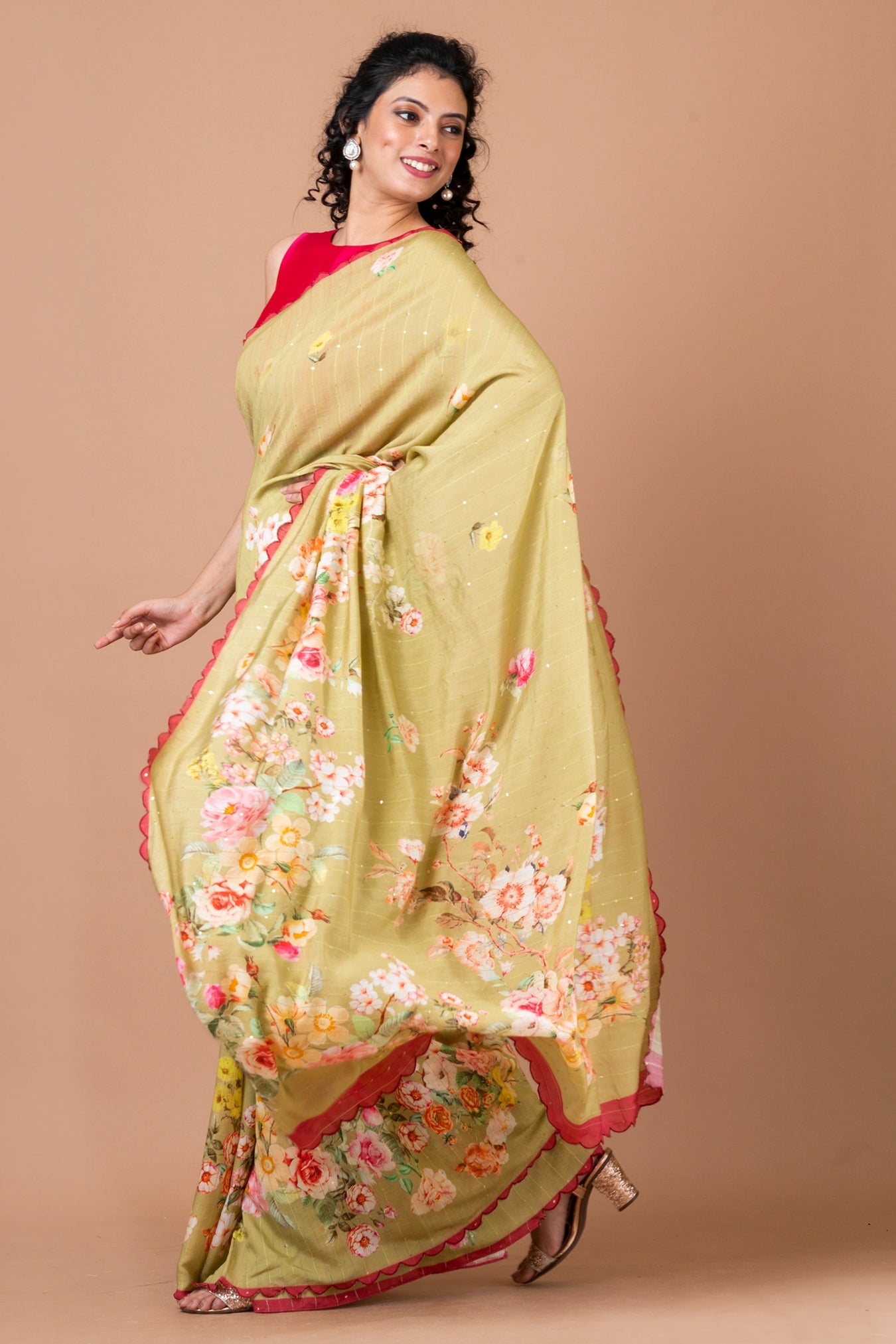 Size: S: 5.50Mtr B: 0.80MtrColour: MehandiFabric: Woven Sequence CrepePattern and print: Experience the allure of cherry blossom floral print with woven sequins in our exquisite saree. The delicate cherry blossoms bloom gracefully on the fabric, while the woven sequins add a touch of enchanting sparkle. Embrace the beauty of this captivating ensemble, celebrating the essence of spring and elegance in every step you take.Purity: Natural fabricCare instructions: Dry wash